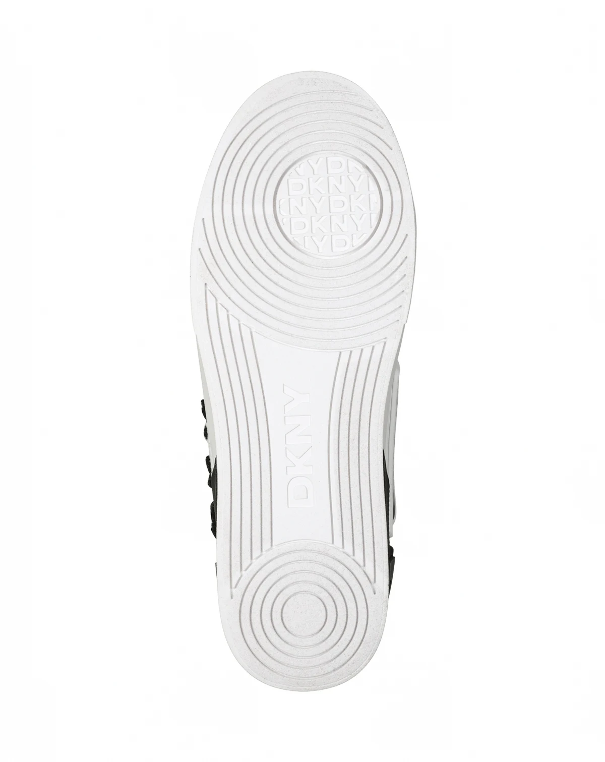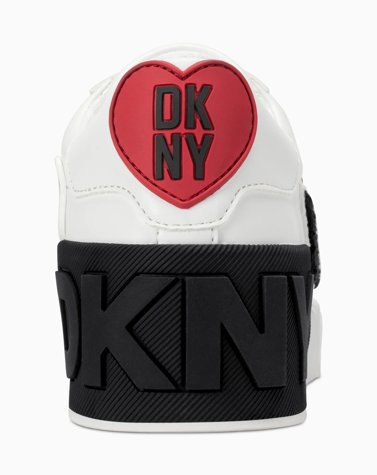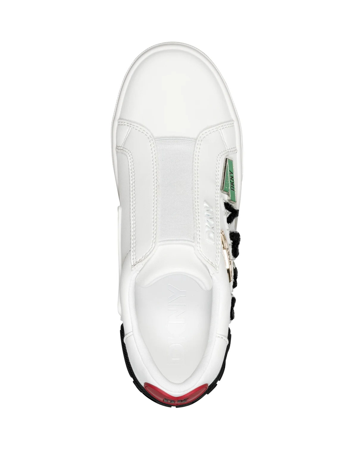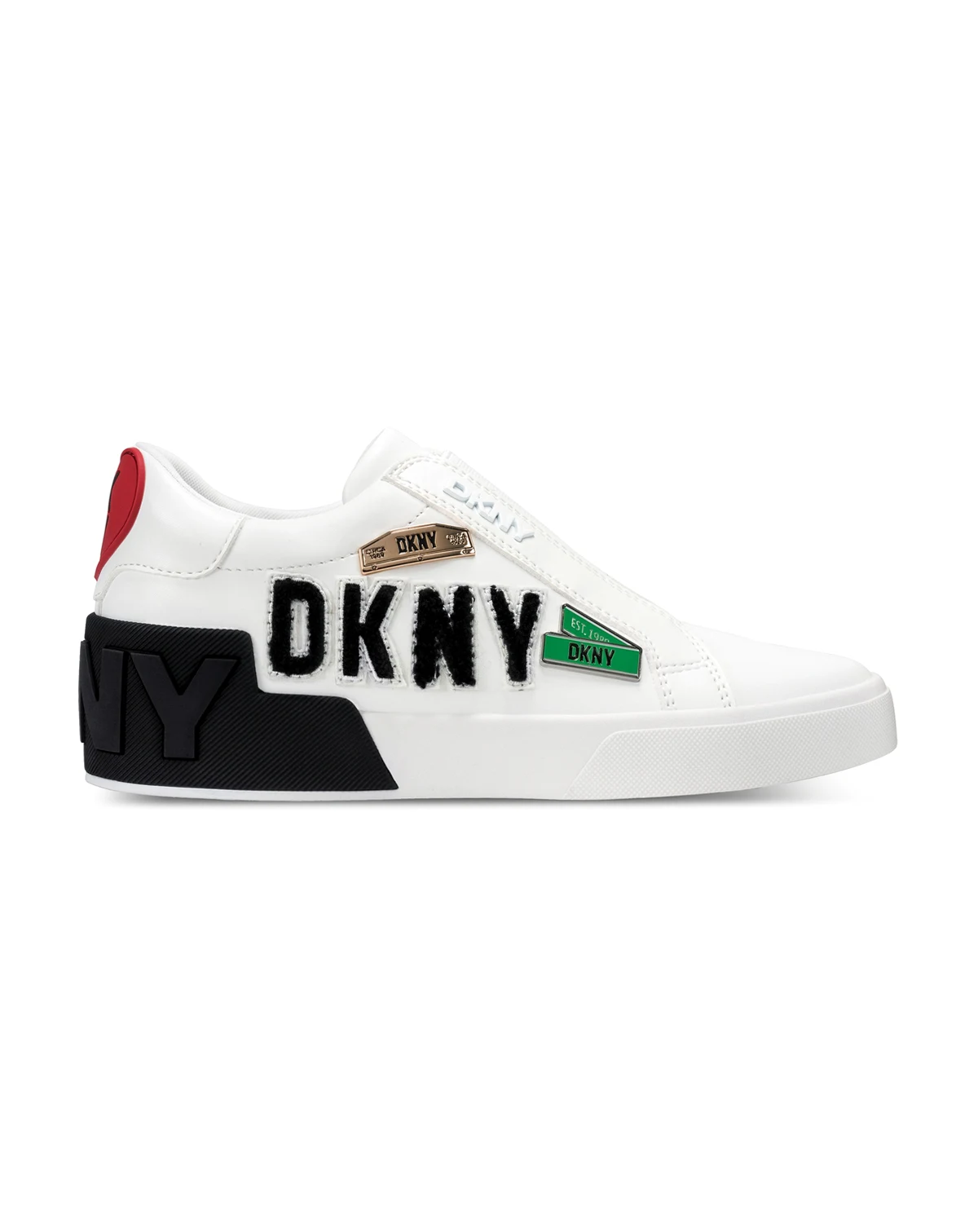 Statement-making City Sign graphics elevate these DKNY Mindi sneakers, designed for effortless slip-on wear. Round toes and flat heels deliver comfort for an easygoing, casual look.
