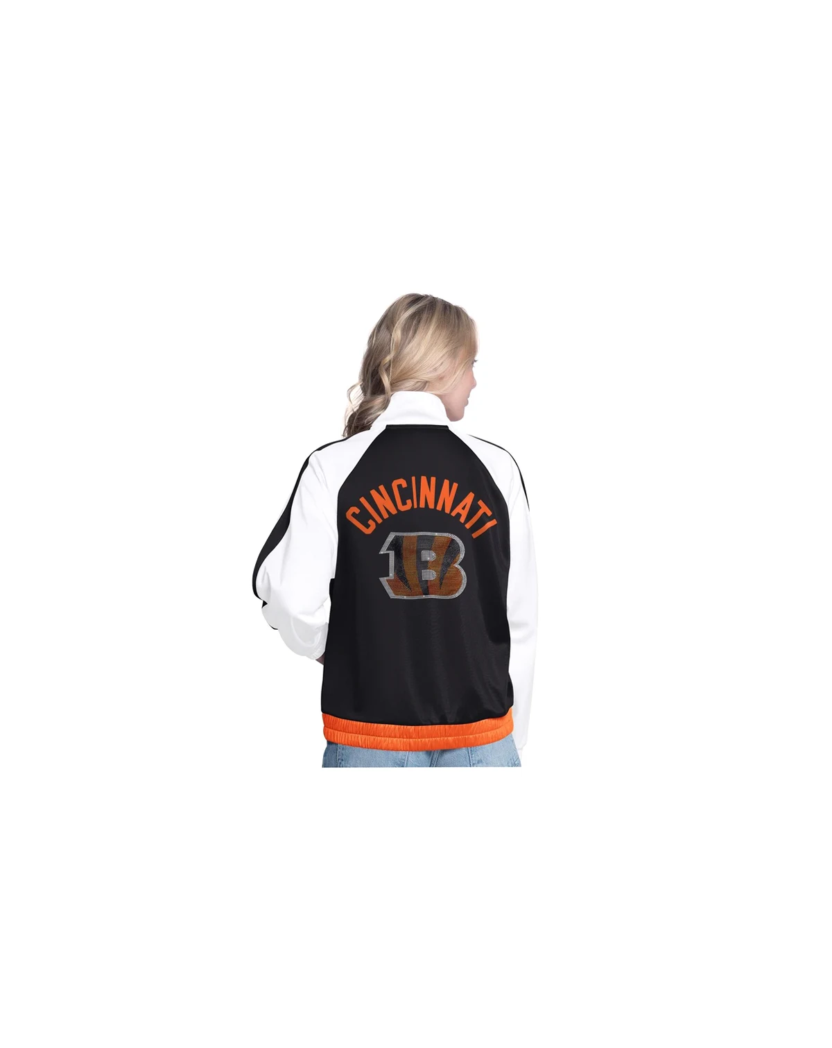 Show your Cincinnati Bengals spirit with this G-III 4Her by Carl Banks Rally Rhinestone Full-Zip Track Jacket. This stylish jacket features bold sleeve stripes, screen printed graphics and a color rhinestone team logo on the back, making it a standout piece in your wardrobe. Its lightweight polyester construction and comfortable fit make it perfect for mild weather, whether you're cheering for the Cincinnati Bengals from the stands or running errands around town.