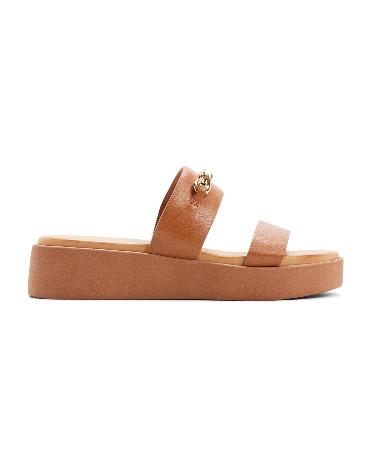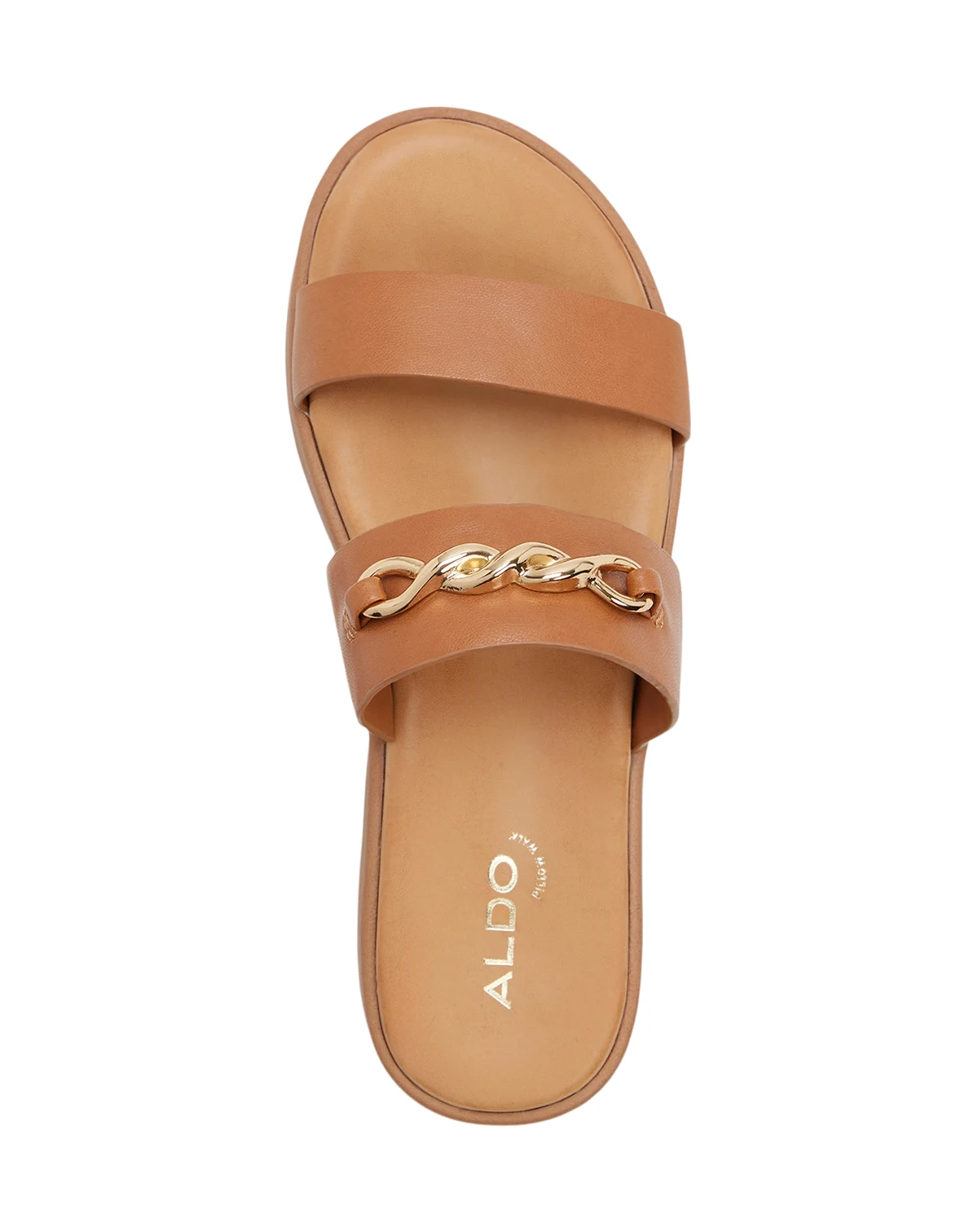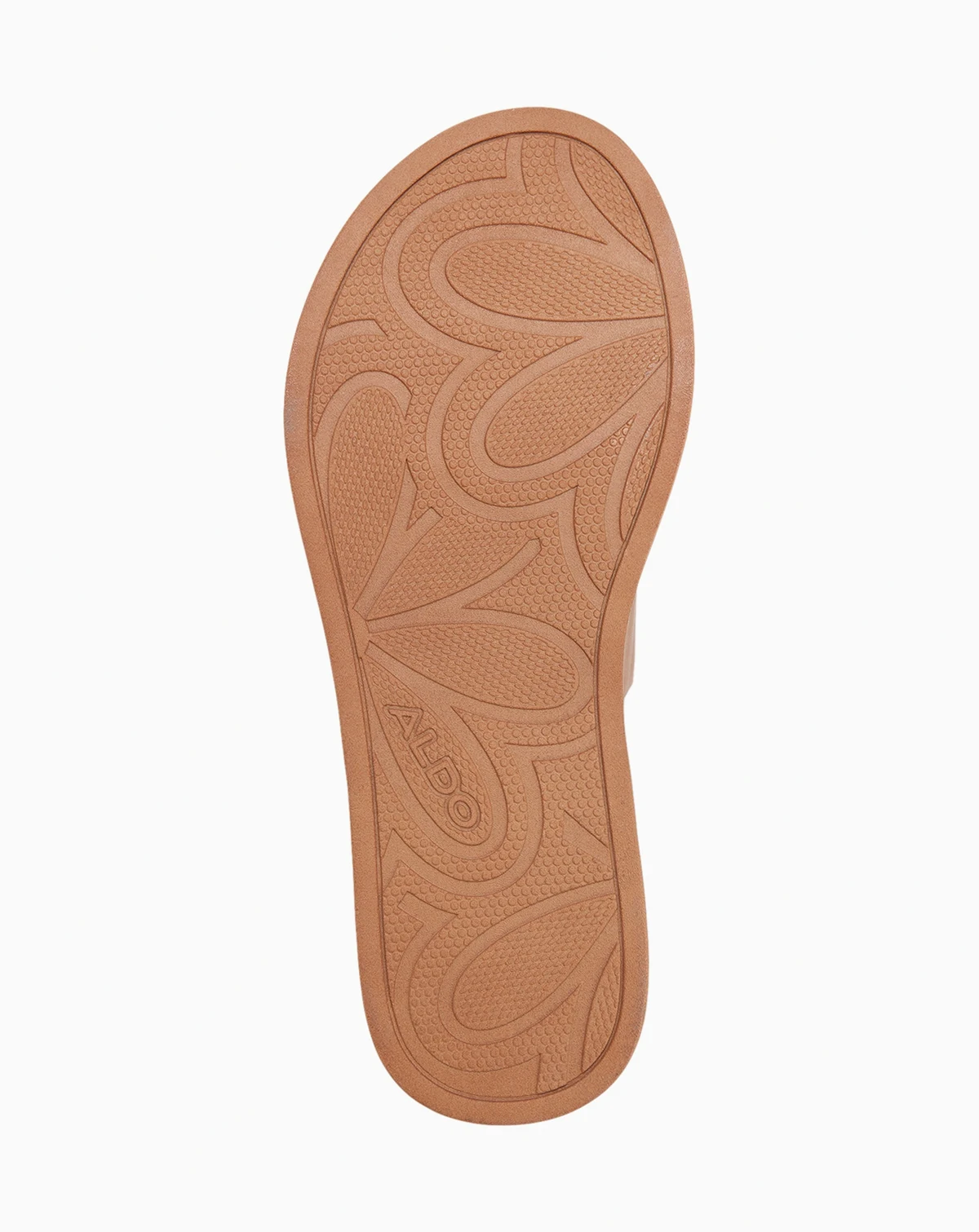Relax in stylish comfort with this pair of ALDO platform flat sandals, featuring sleek almond toes and metallic ornaments. Cushioned designs ensure ease during leisurely moments.
