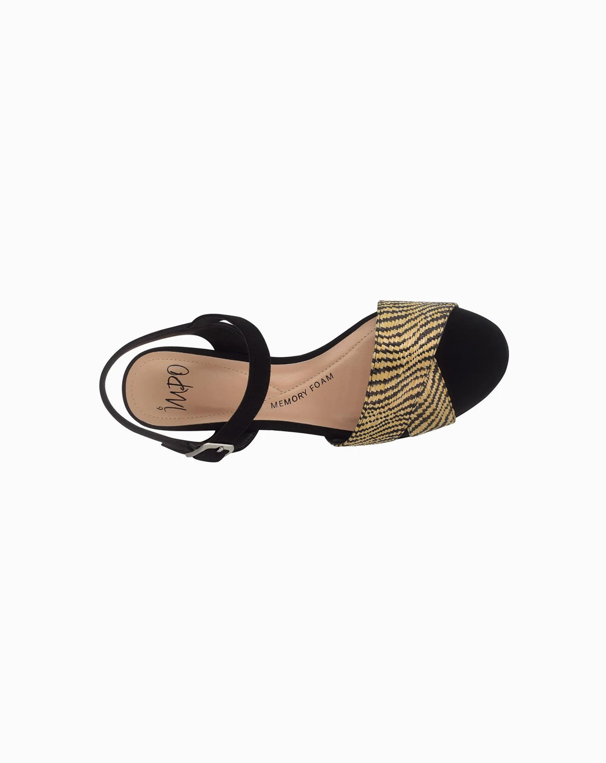 A nod to mod, the Nicolette rests on a cushioned platform. An asymmetrical band, with raffia or a tropical floral print. Adjustable buckle strap, memory foam, 2.75" heel, 1.25" platform, non-skid sole.