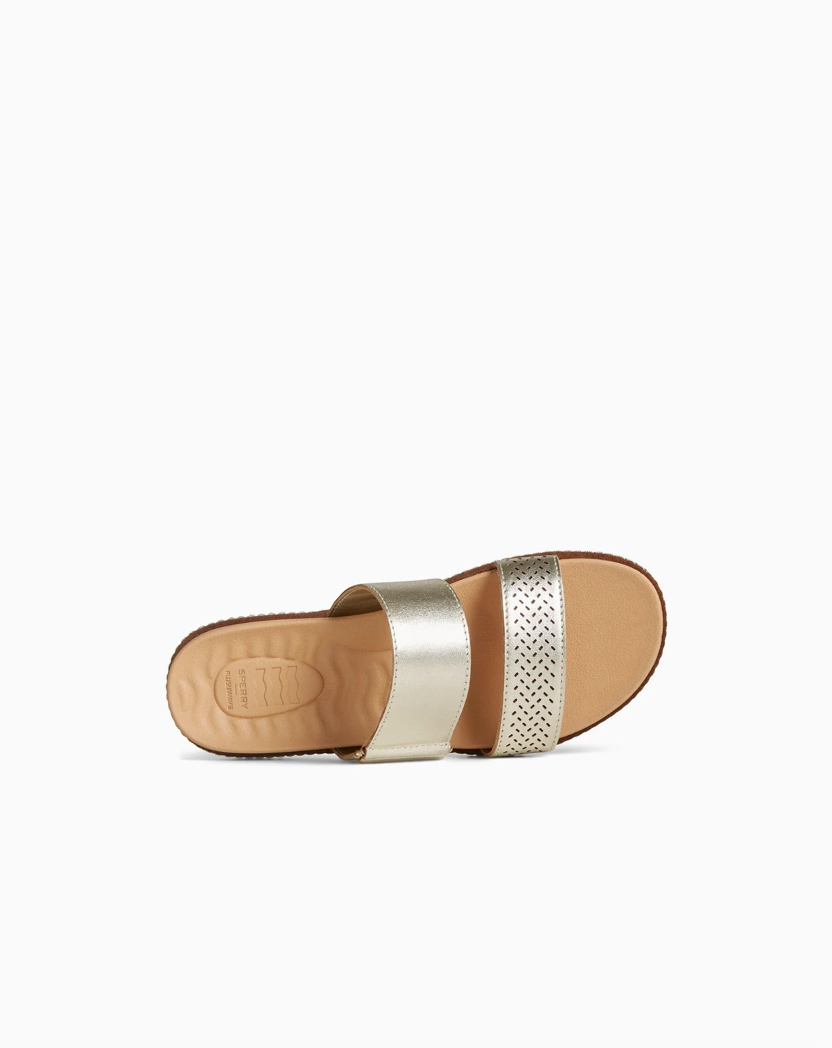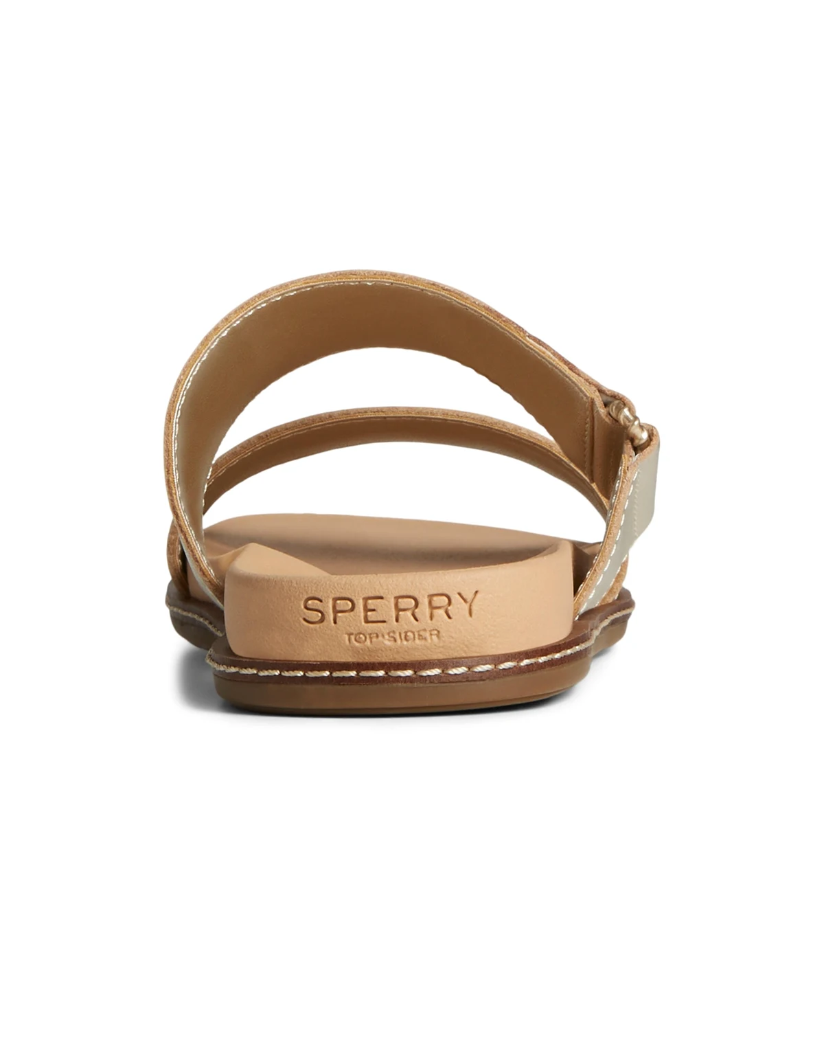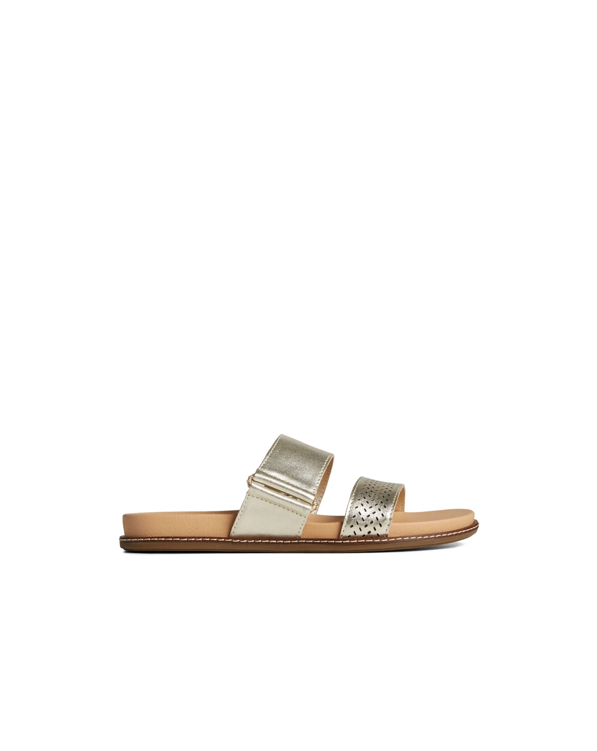 The simple slide sandal gets a big visual upgrade thanks to a premium leather upper with a double strap detail and oversized decorative hardware. Lightweight cushioning technology provides an all-day comfort boost.