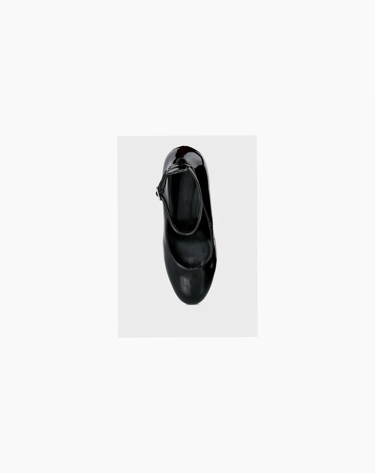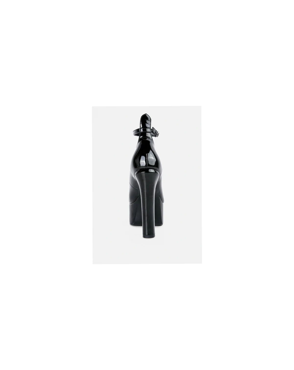 The platform pumps are shiny and chic with a scrumptious platform heel that looks chunky and trendy. The ankle strap secures feet well and the lightly cushioned insoles cut strain. The high heeled sandals are a delish treat for a fun night out!