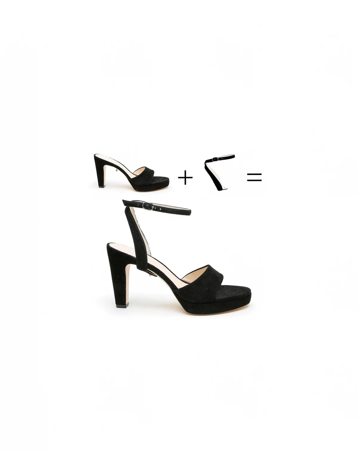 Elegant black suede platforms that you can wear all night. Designed for all-night comfort, they may feel snug at first but soften beautifully over time. Plus, the customizable design lets you mix and match with any Alterre straps (sold separately) to create many pairs in one.