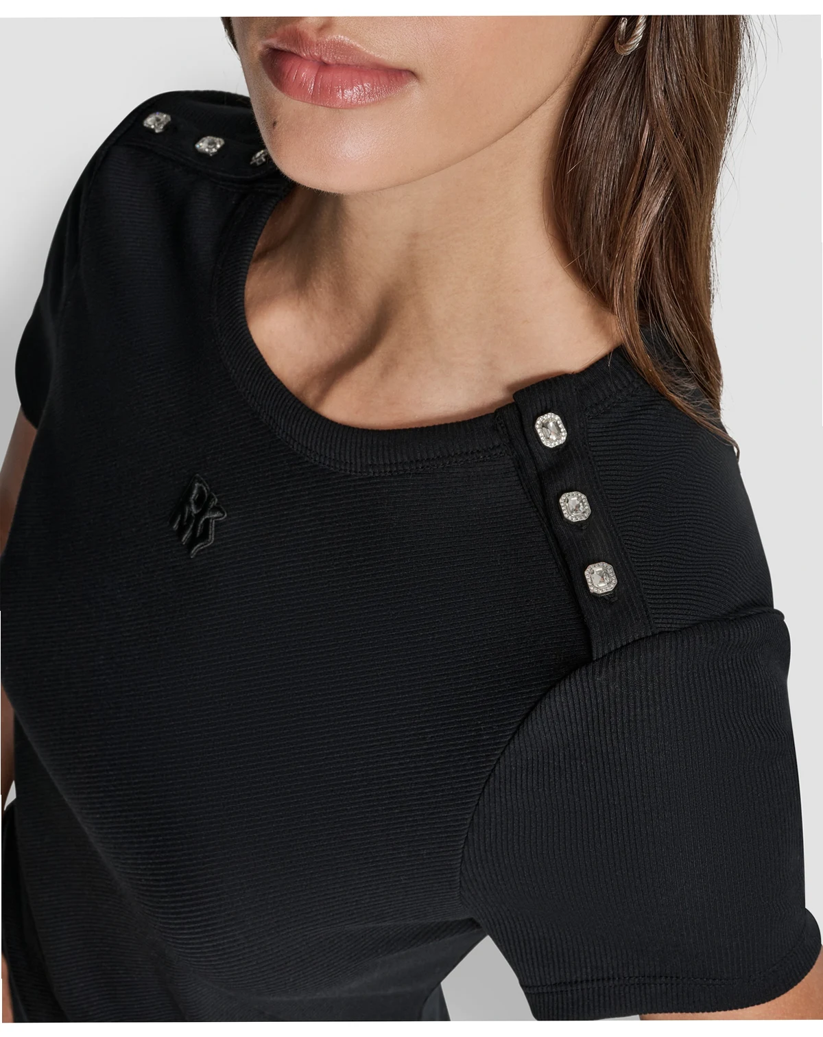 Add a touch of elegance to a casual look with this chic top from DKNY Jeans. Featuring a pull-on design, crew neckline, and jewel decorative buttons on the shoulders, it enhances polished appeal.