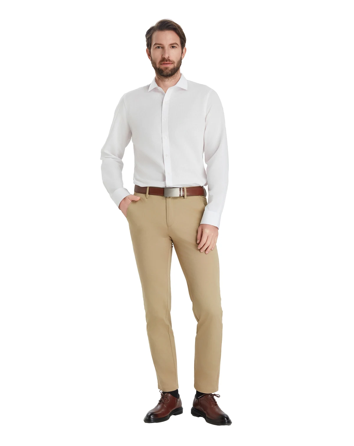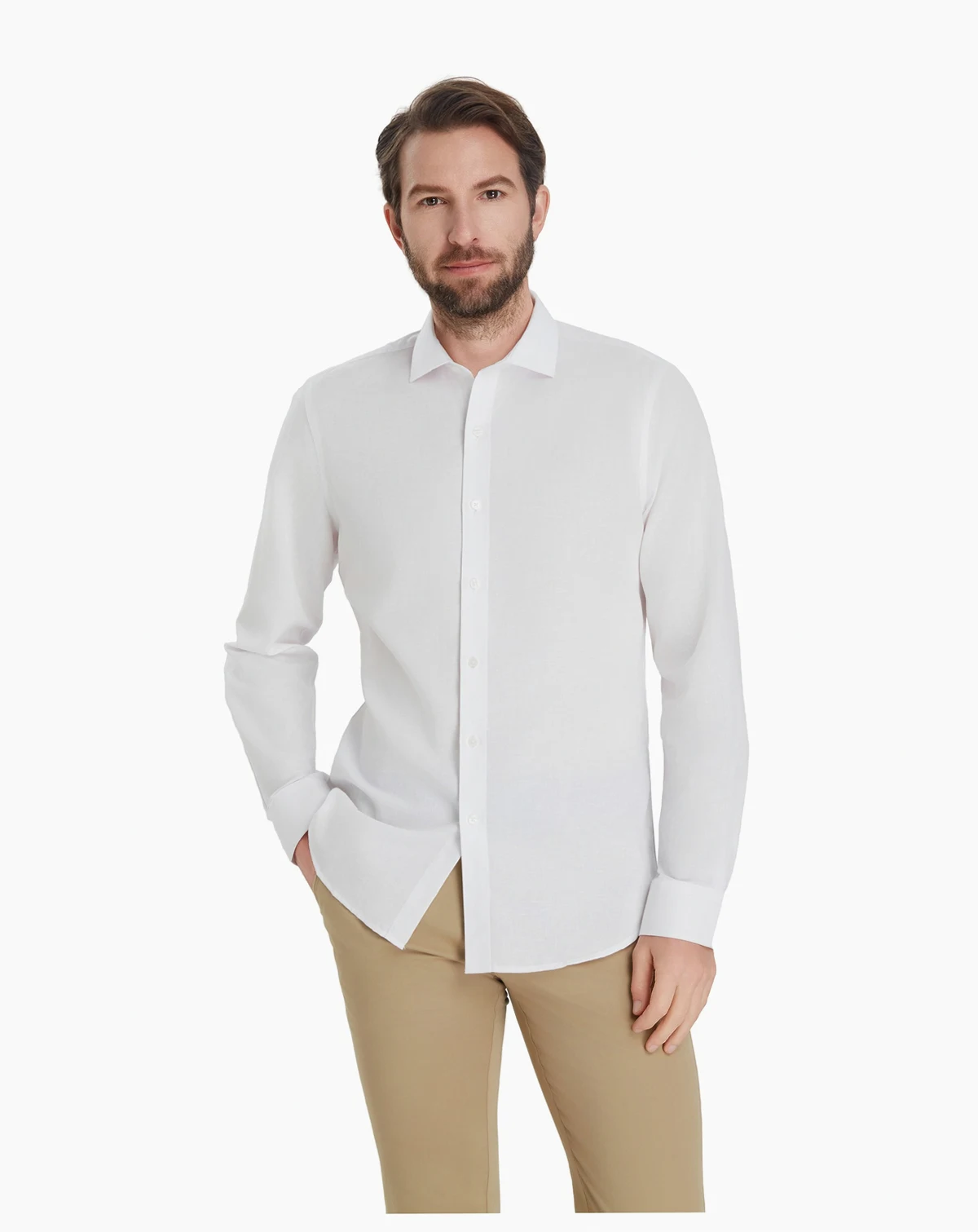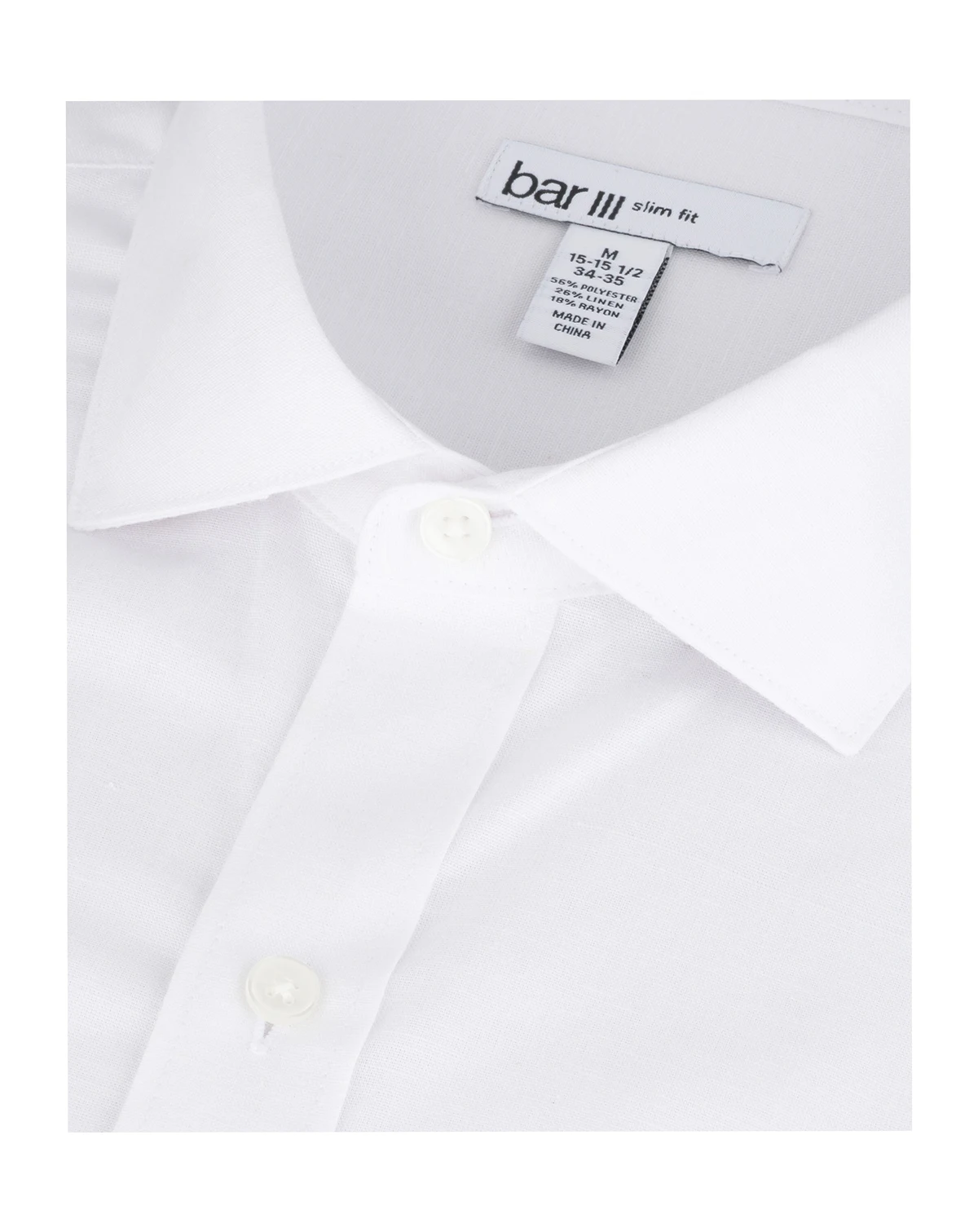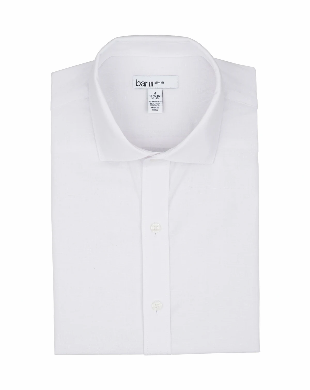 Refined yet relaxed, this Bar III Slim-Fit dress shirt features a linen-blend construction that delivers lightweight comfort throughout the day. A spread collar frames the neckline with modern structure, while rounded cuffs provide a smooth, tailored finish. Clean tailoring sharpens the silhouette for an effortlessly polished look.