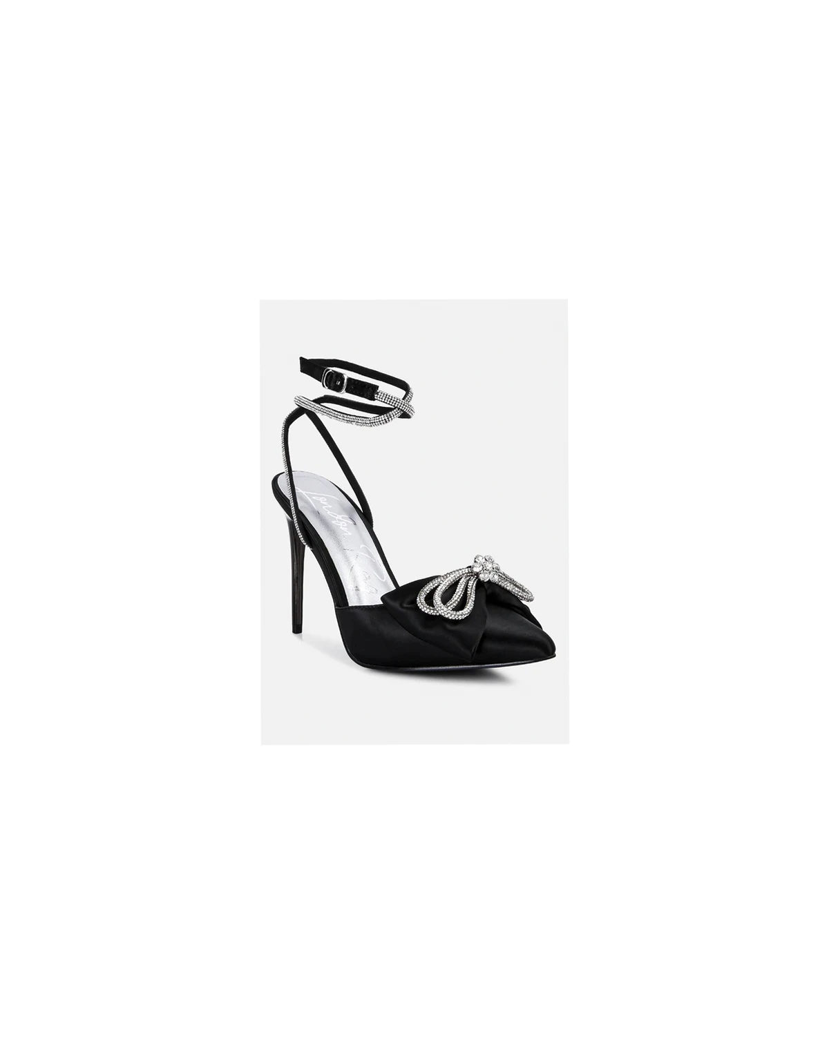 Oozing femininity and sensuality, these high-heel stiletto heels are the epitome of beauty. A rhinestone jewel bow on the pointed top on an exquisite satin in the backdrop makes them the best must-have heels! What's more? The ankle straps are embellished with rhinestones and fastened securely by a pin buckle for an ultimate stylish fit. Type: Heels Upper Material: Satin Light Cushion Insole Outer Sole: TPR Stiletto Heel Closed Pointed Toe Ankle Buckle Fastening Rhinestone Embellished Bow Detail SH3430