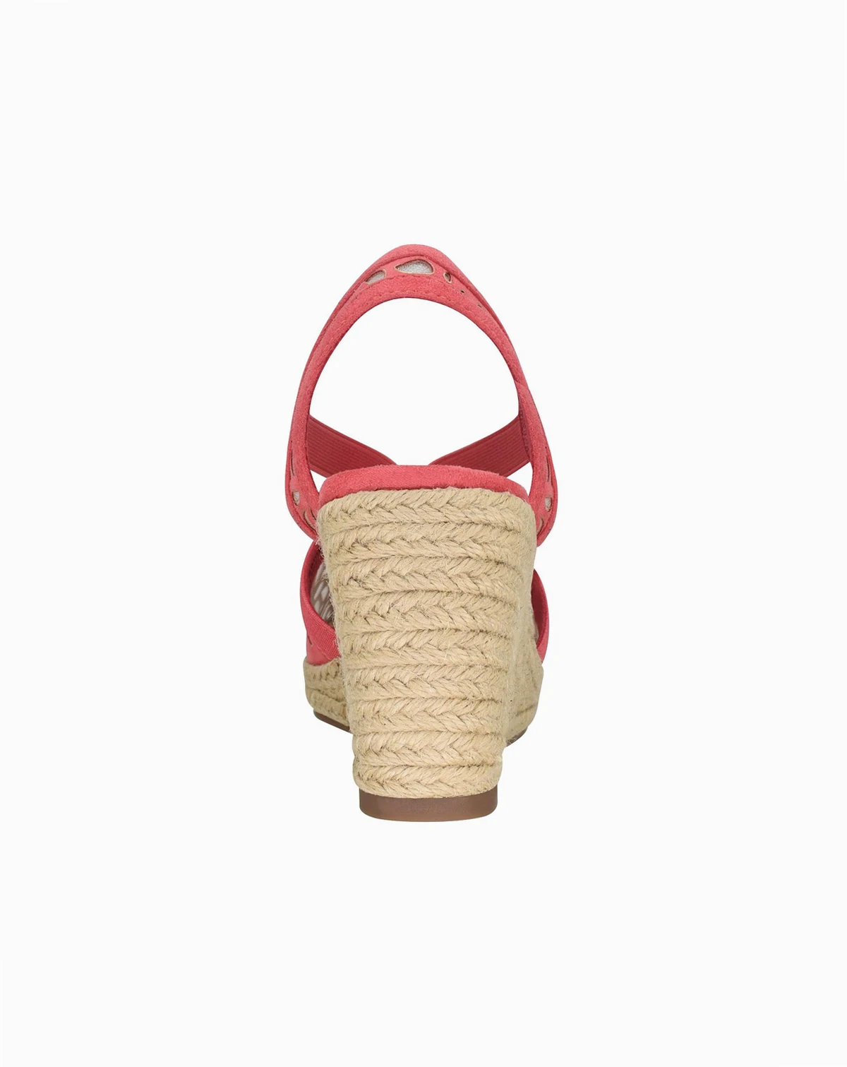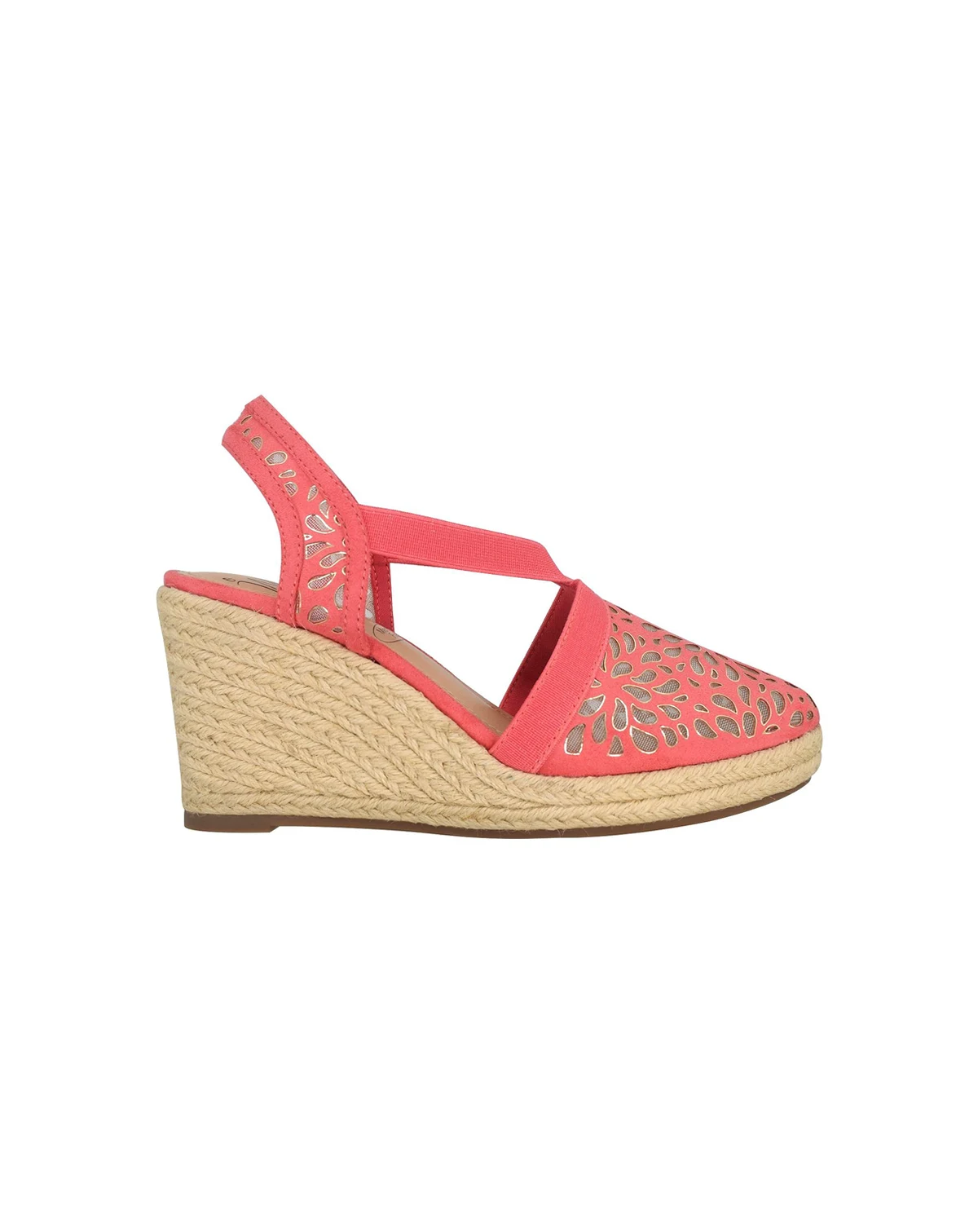 Delicately lacy, gold-outlined petals dance upon a peek-a-boo mesh vamp on this timeless espadrille. Stretch elastic embrace your instep, with a matching peek-a-boo mesh backstrap, a round toe and a cushioned memory foam insole with a natural rope-covered platform wedge.
