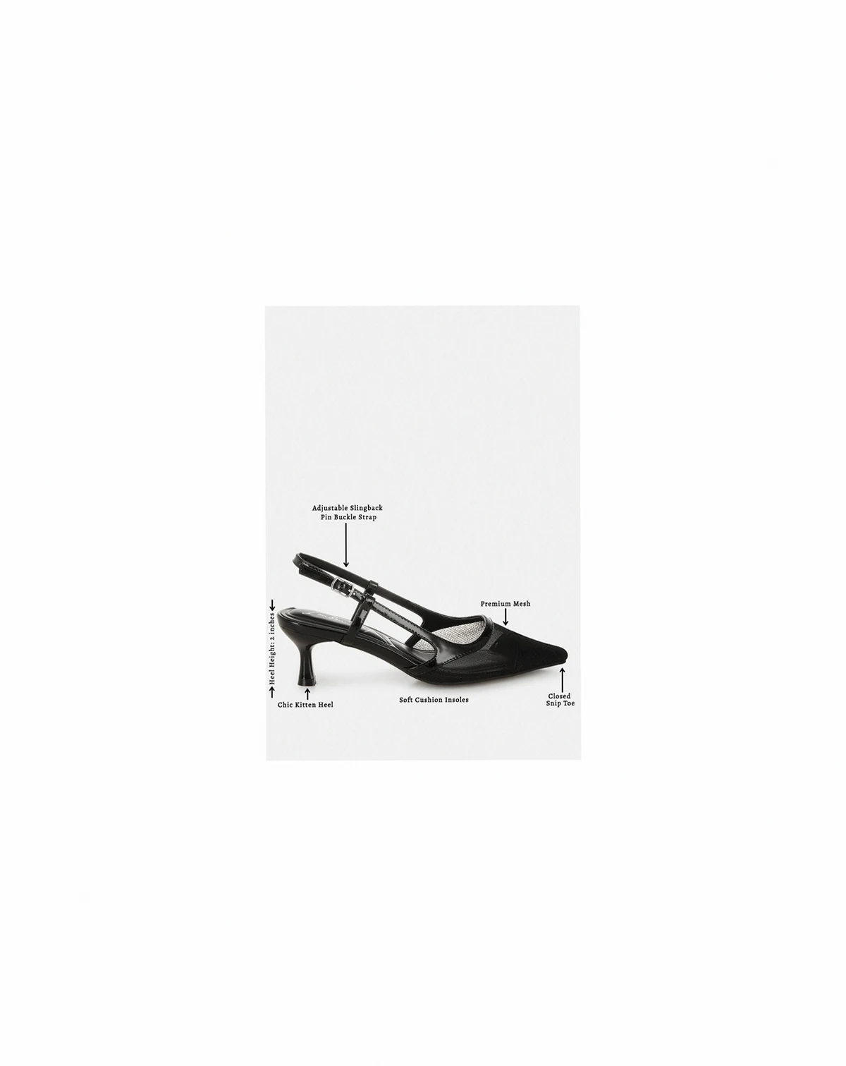 Chic, comfy, and totally wearable—these black mesh slingbacks are your answer to looking dressed-up without trying too hard. With a flared kitten heel and breezy mesh panels, they're perfect for everything from desk days to dinner nights. Type: Heels Upper Material: Mesh Outer Sole: TP Rubber Closed Snip Toe Adjustable Slingback Pin Buckle Strap Kitten Heel Soft Cushion Insoles Heel Height: 2 inches SH5789