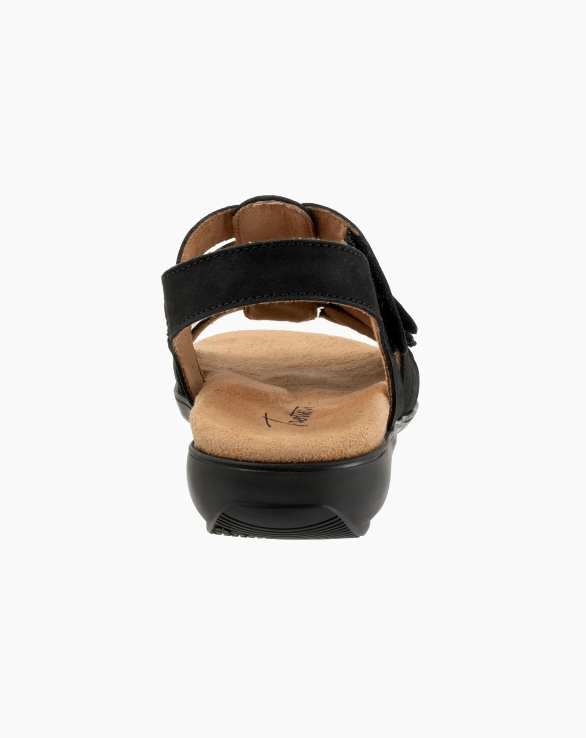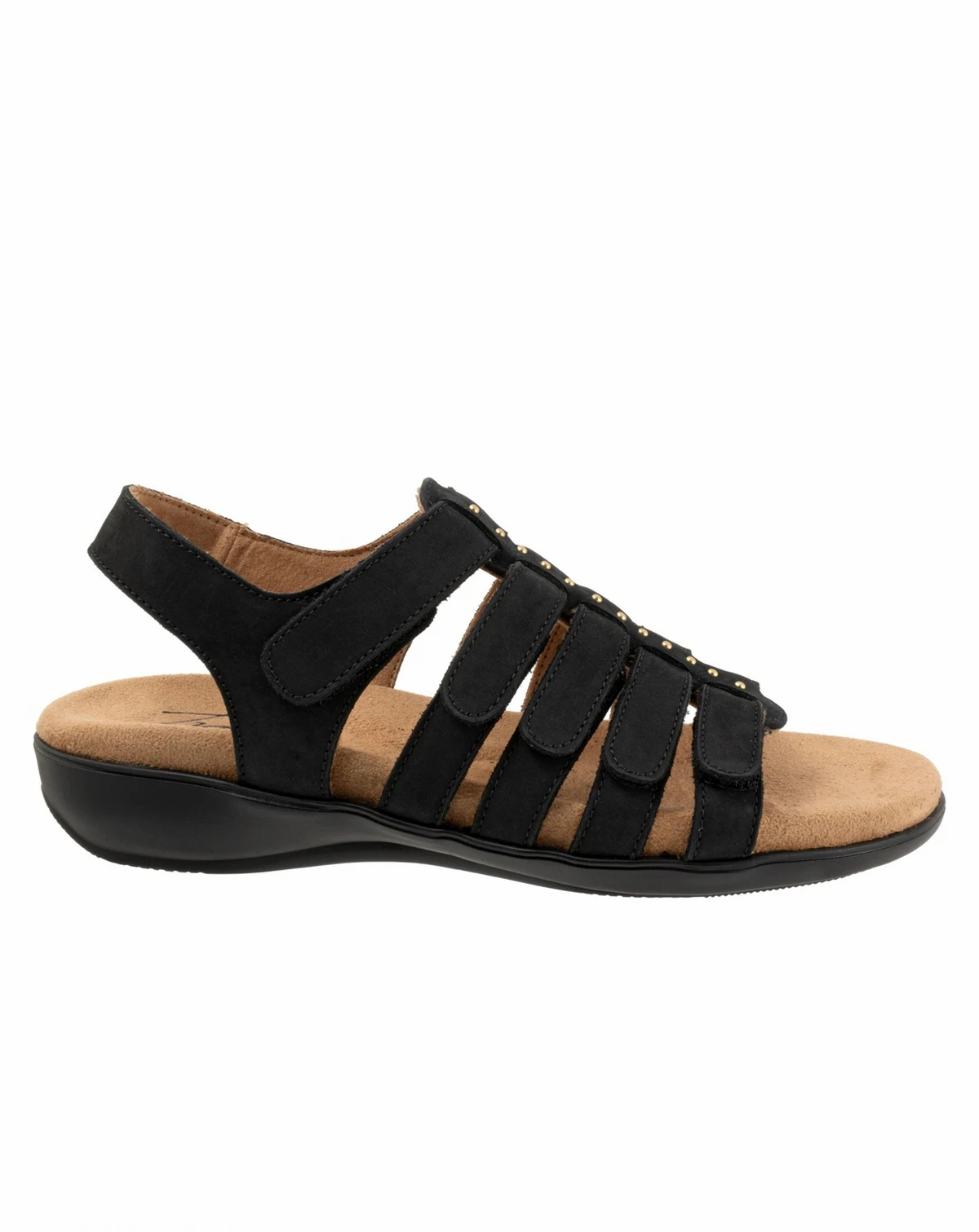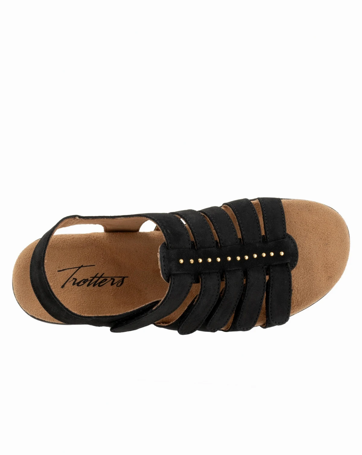 Step into comfort and standout style with the Trotters Rikki Studs Sandal. Crafted from genuine leather, this strappy silhouette is accented with metallic studs along the center for a touch of modern edge. The outside hook-and-loop closure allows for a secure, customizable fit, while the cushioned footbed and built-in arch support deliver lasting comfort. Finished with a modest flat 1 1/4" heel, the Rikki Studs is the perfect blend of polish and practicality.