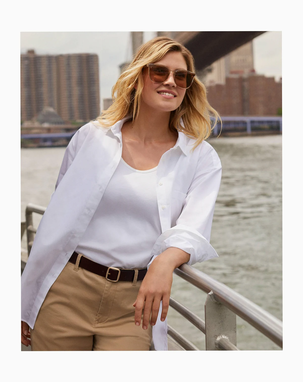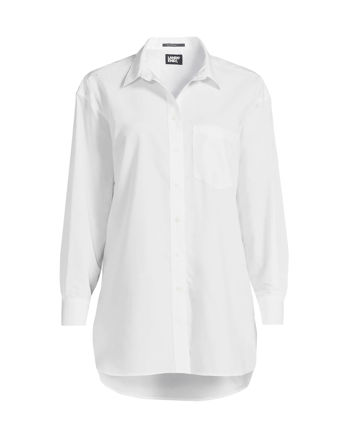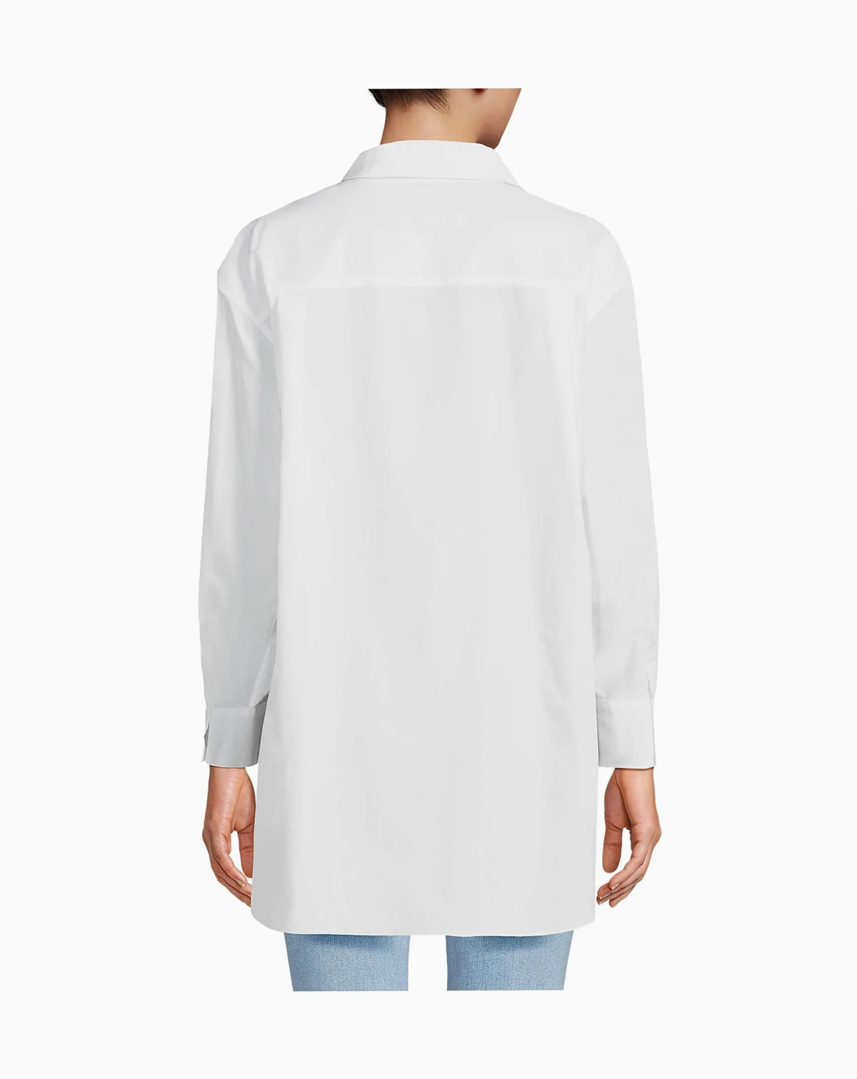 Experience the comfort and versatility of this crisp cotton tunic. Its oversized design is not just about style it s about allowing you to move easily. It has plenty of well-crafted details, including the button placket front, dropped shoulder, back yoke, and barrel cuffs. The shirttail hem falls mid-thigh. Whether you pair it with jeans or leggings, tie it at the waist, or leave it untucked, it s an easy choice to keep you comfortable all day long. .
