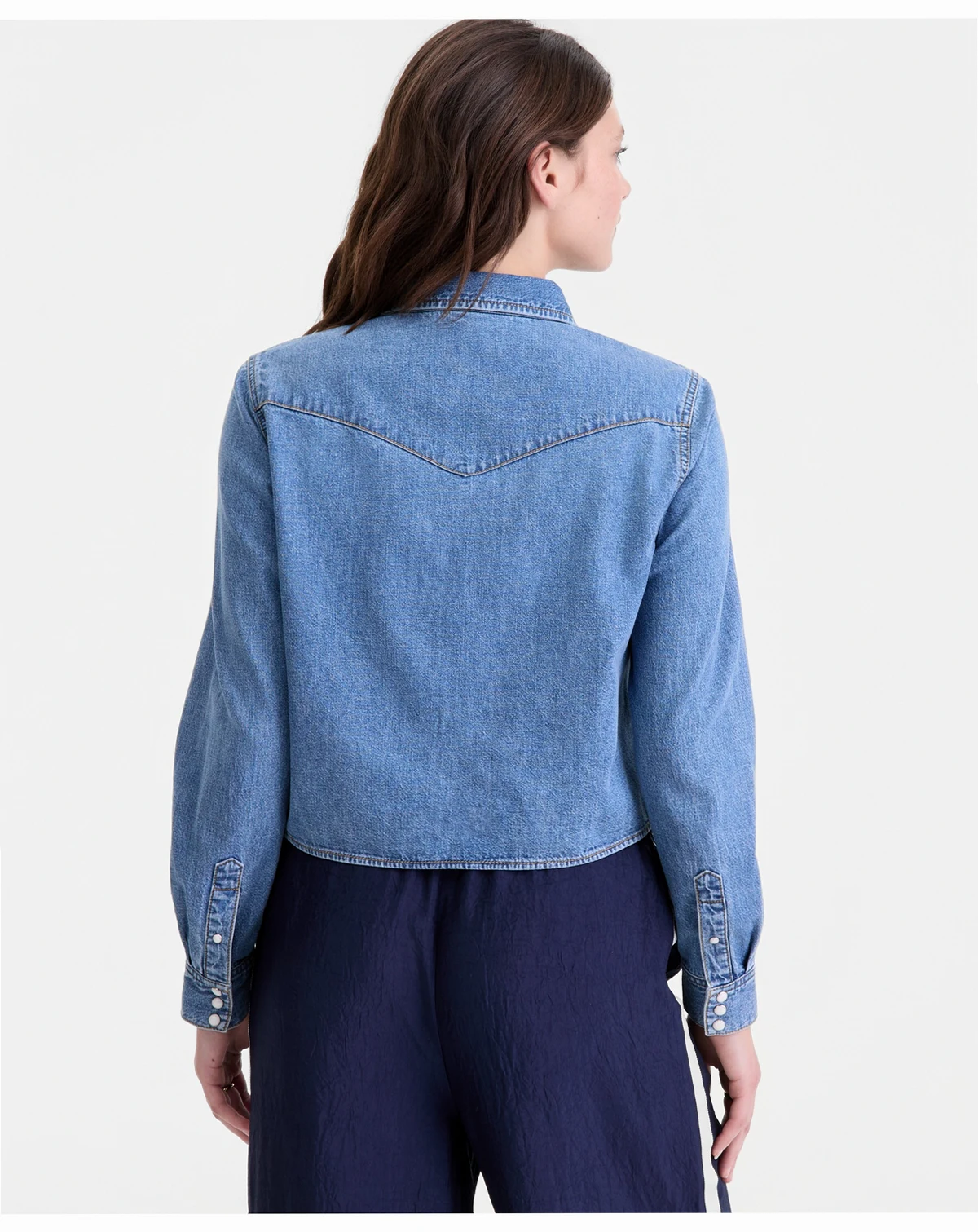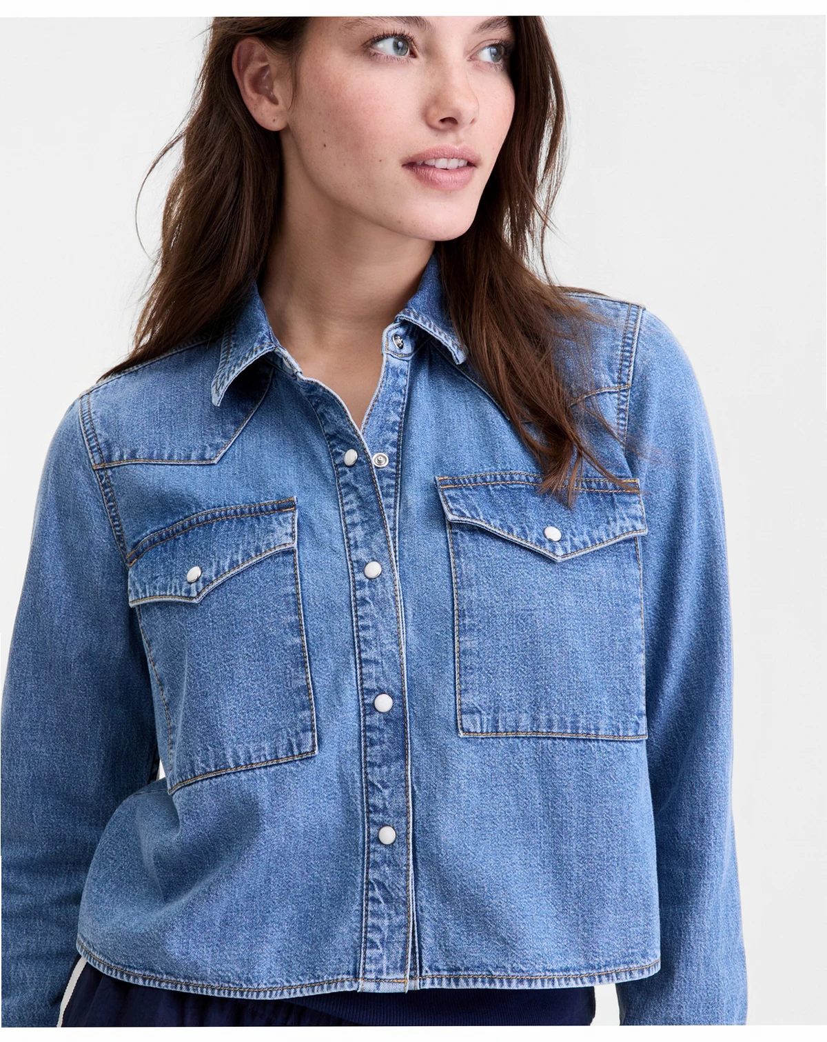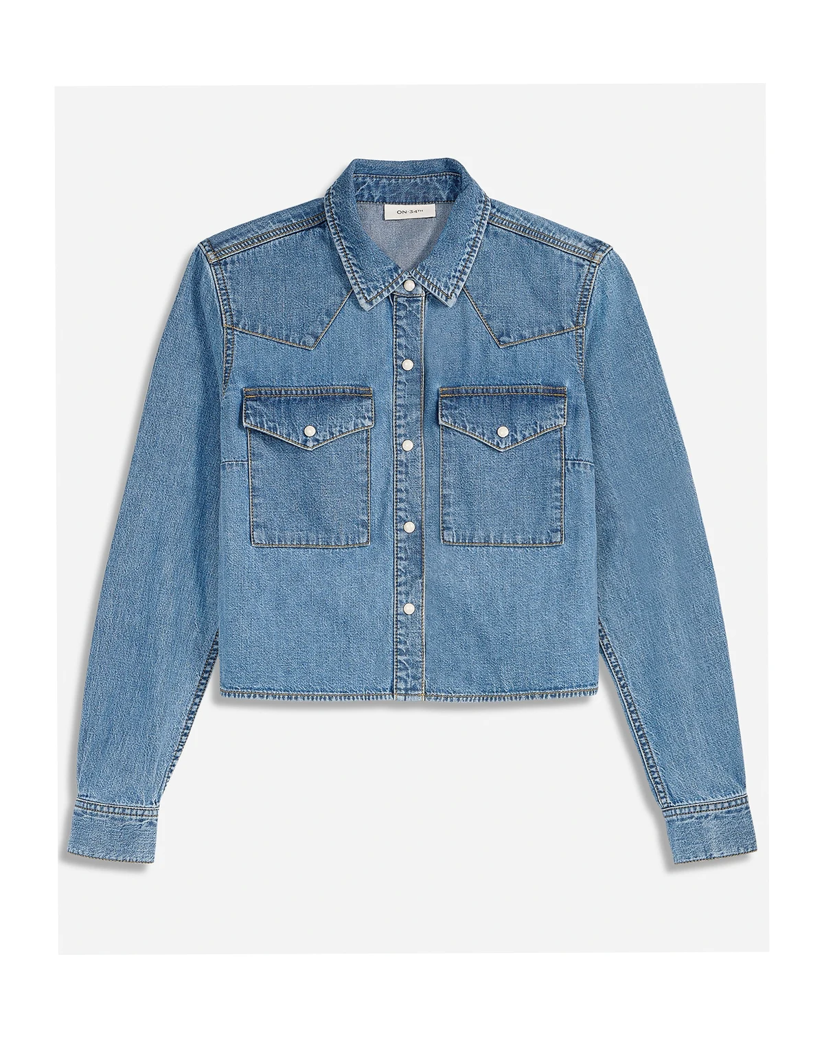 Western inspiration that's wearable anywhere, our denim shirt features a cropped hem and snap-front metal closures. ABOUT THE BRAND: On 34th was designed for and with women like you. Made for your body, your style, and your truth. As your wardrobe's BFF, these mix-and-match pieces work with everything in your closet.