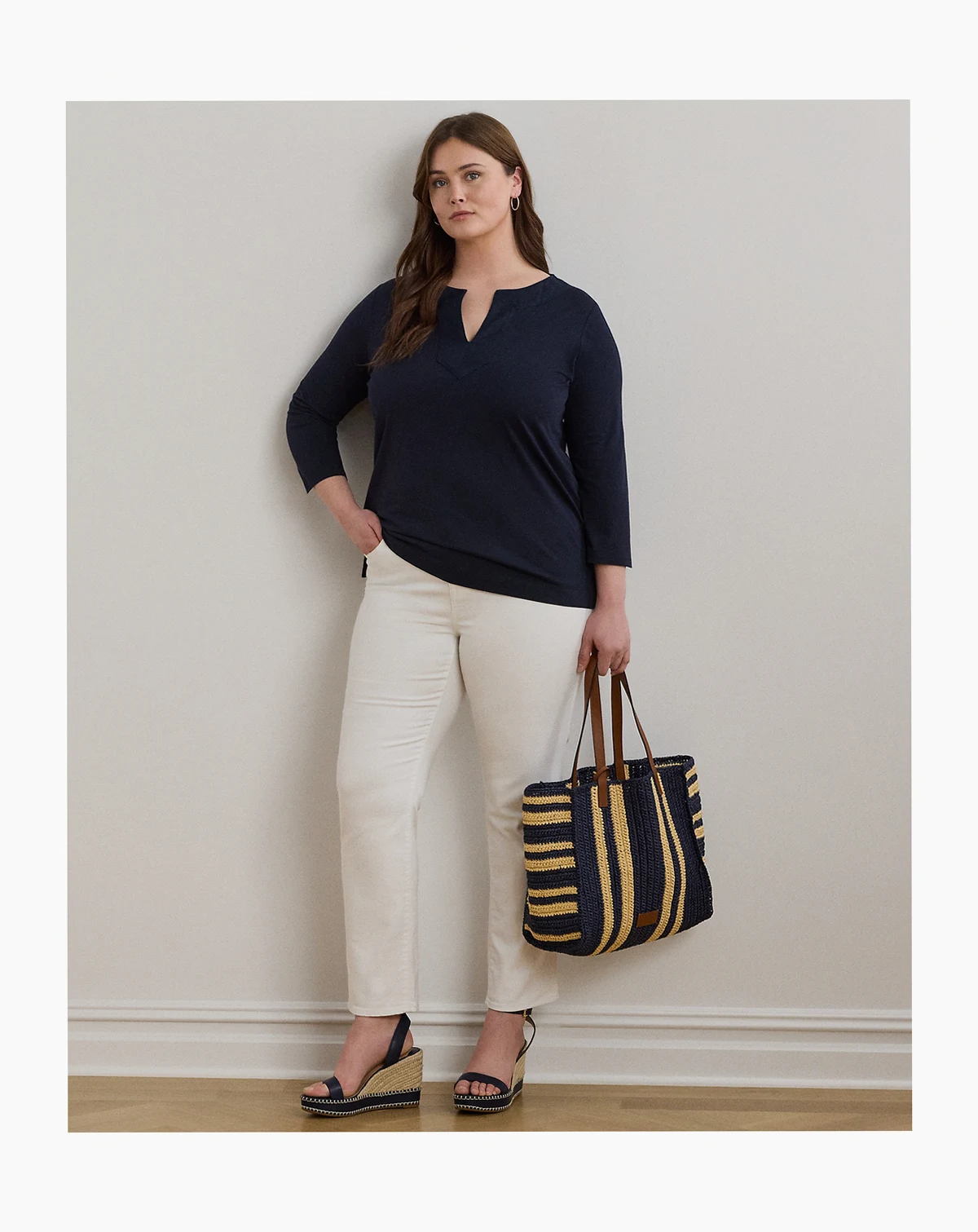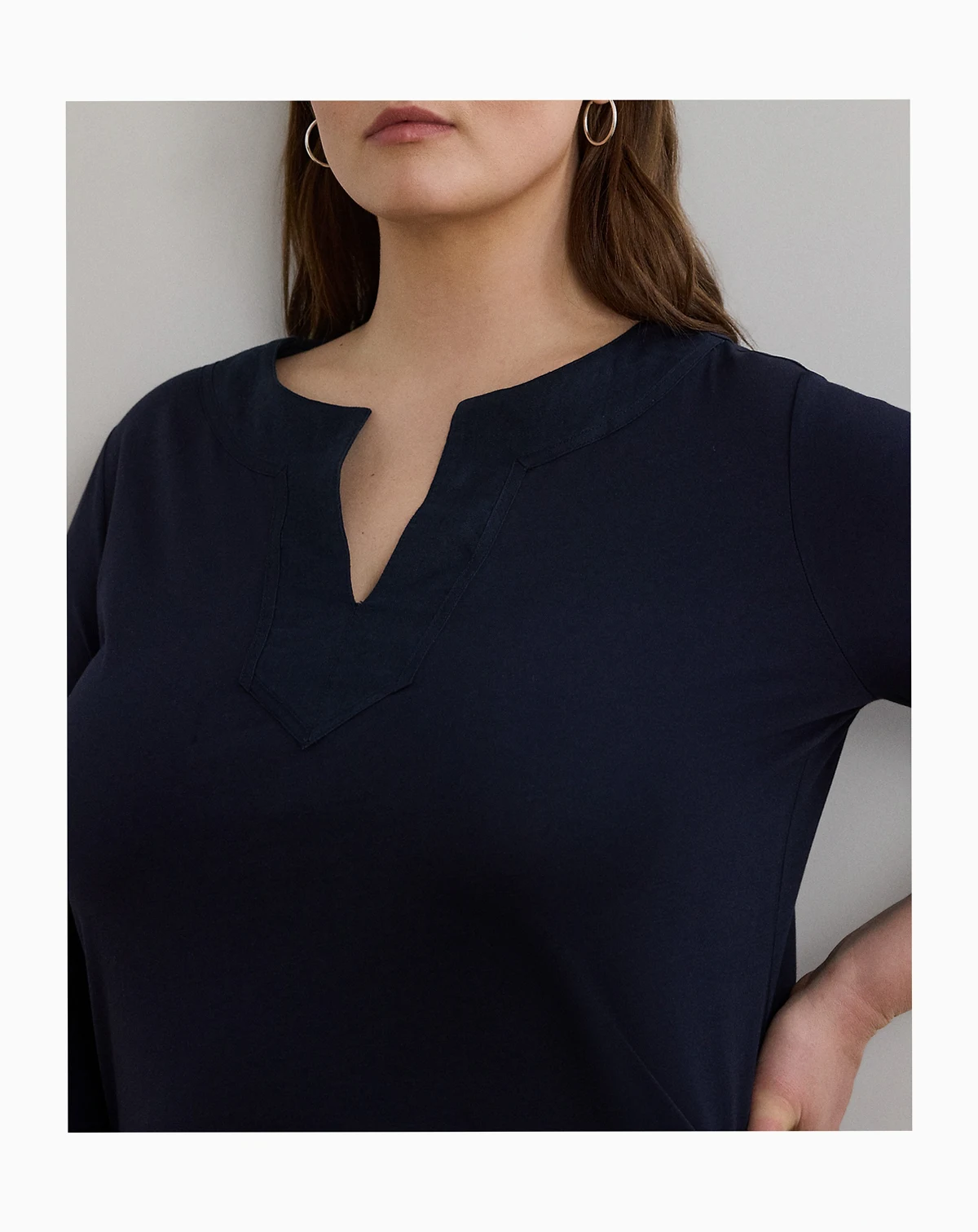 Relax in style in this cotton jersey Lauren Ralph Lauren plus size tunic with a soft and breathable comfortable feel. A split neckline and side-split hem lend to its effortless appeal, finishing the look with three-quarter-length sleeves.