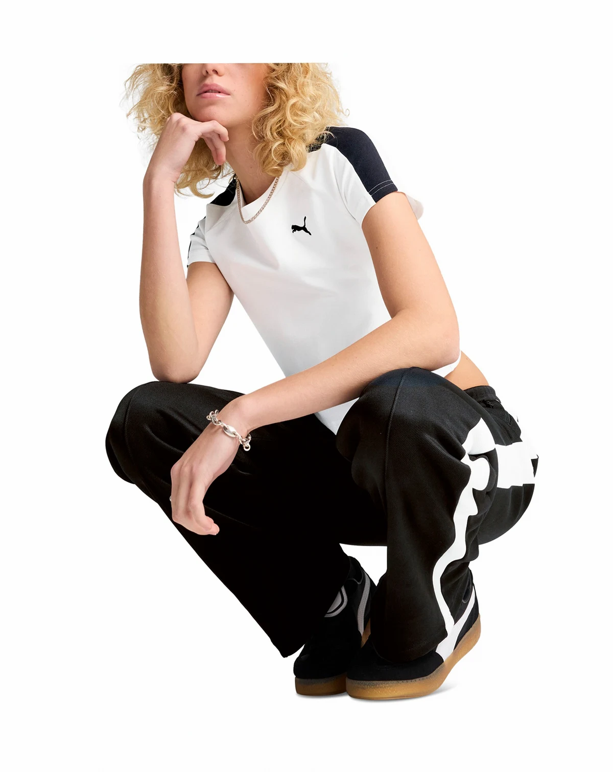 Cute and cropped, this cotton-blend Puma T-shirt keeps it authentic with classic T7 stripes at the shoulders.