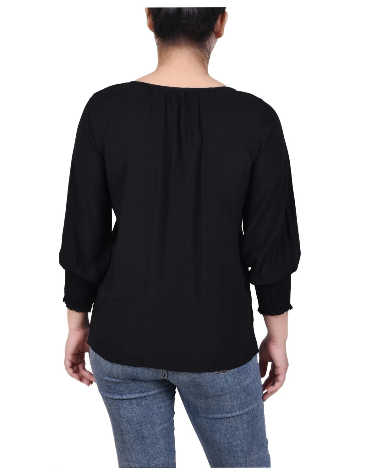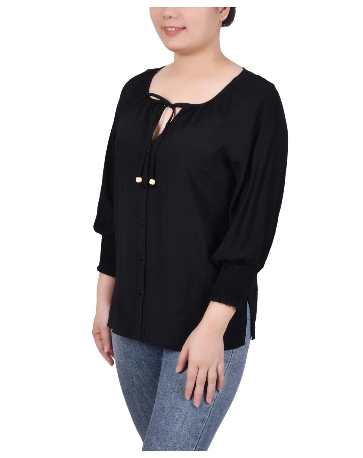 It's all about the details on this slubbed tie blouse from NY Collection. The smocked cuffs and beaded ties complete the look.
