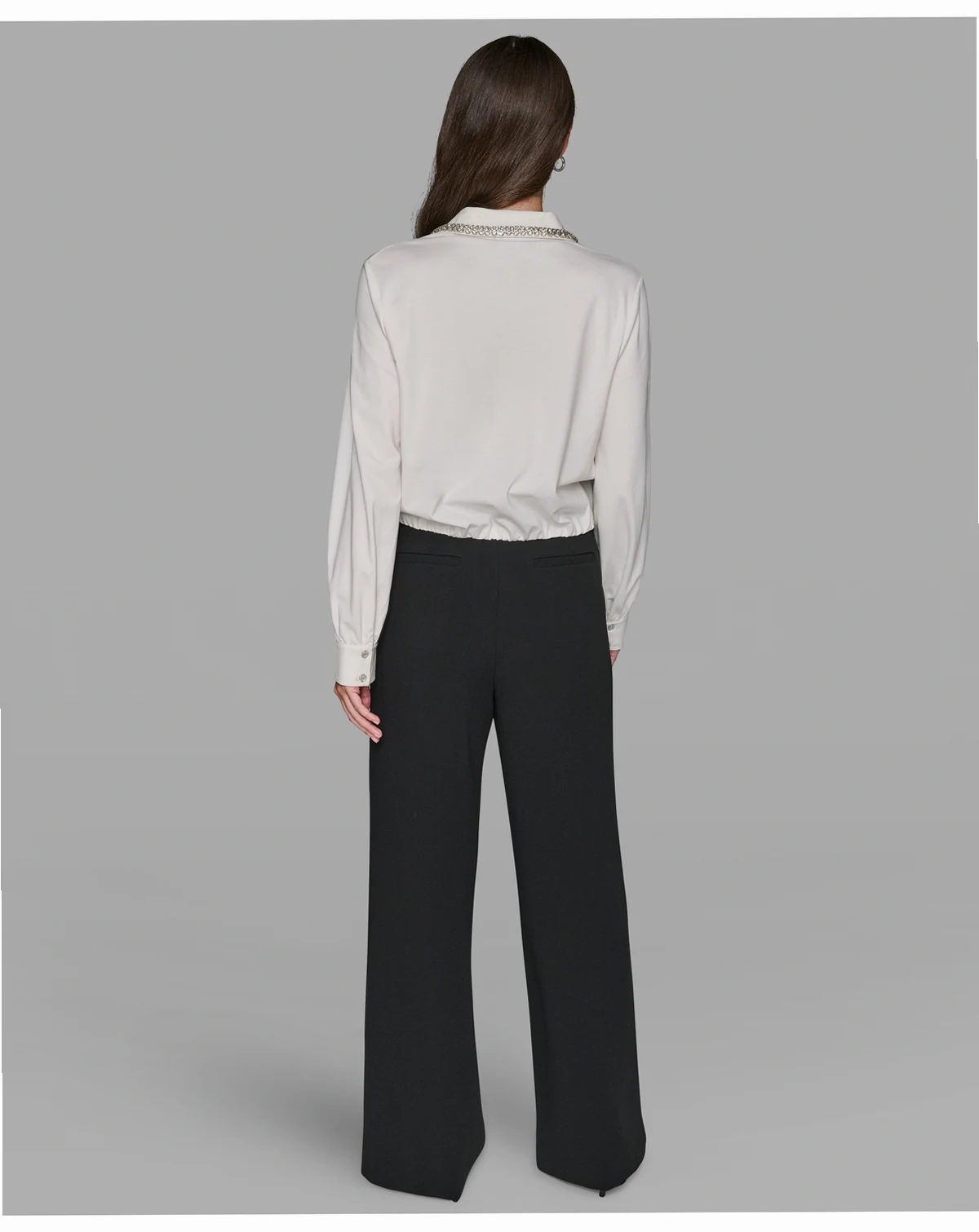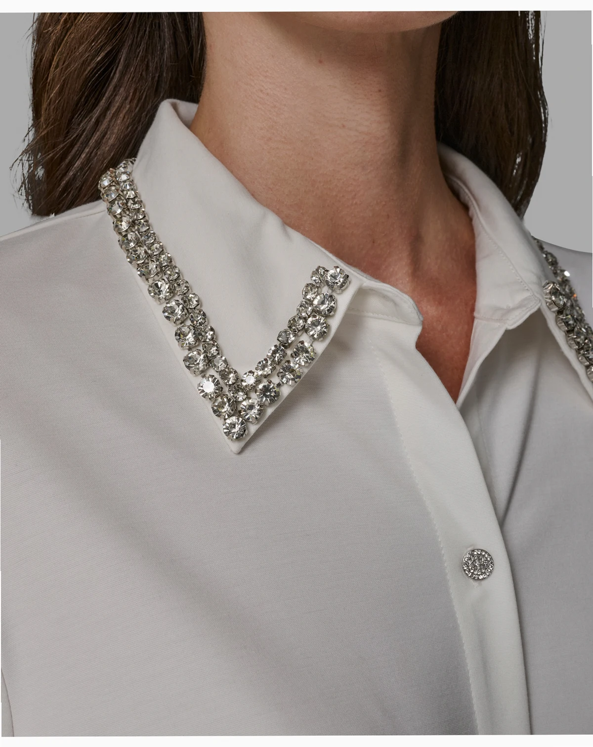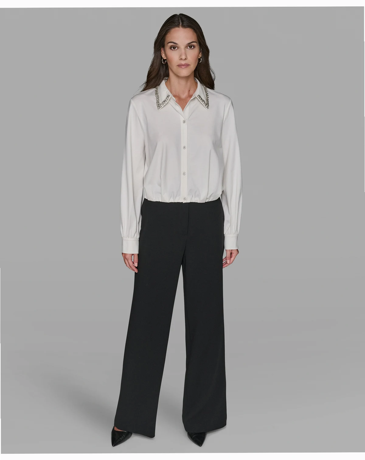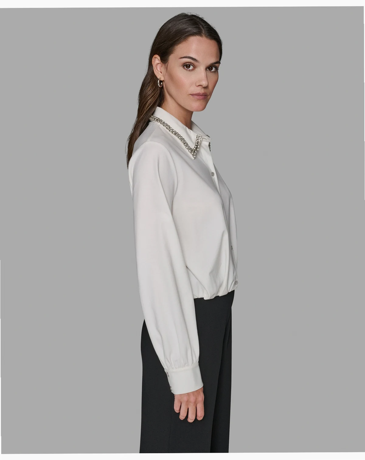 Sparkling details meet timeless design in this embellished top by KARL LAGERFELD PARIS. The intricate collar adds instant glamour, while the button closure ensures a smooth, fuss-free fit. Long sleeves provide gentle coverage, making it versatile from desk to dinner.