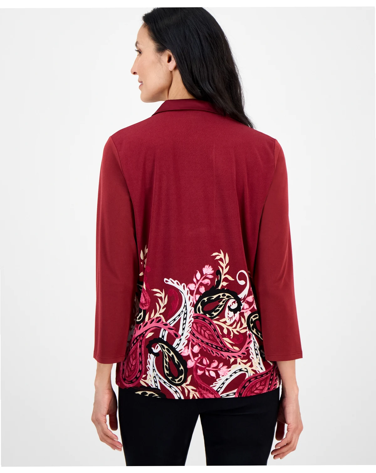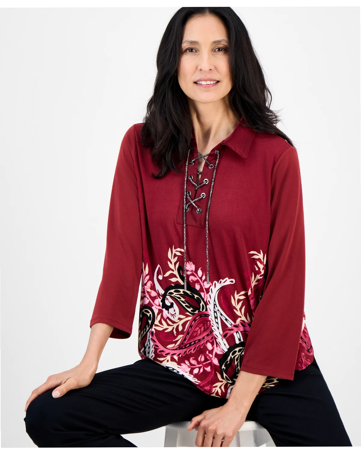 JM Collection updates a 3/4-sleeve top by adding a satin collar, rhinestone lace-up placket and a swirling paisley print.