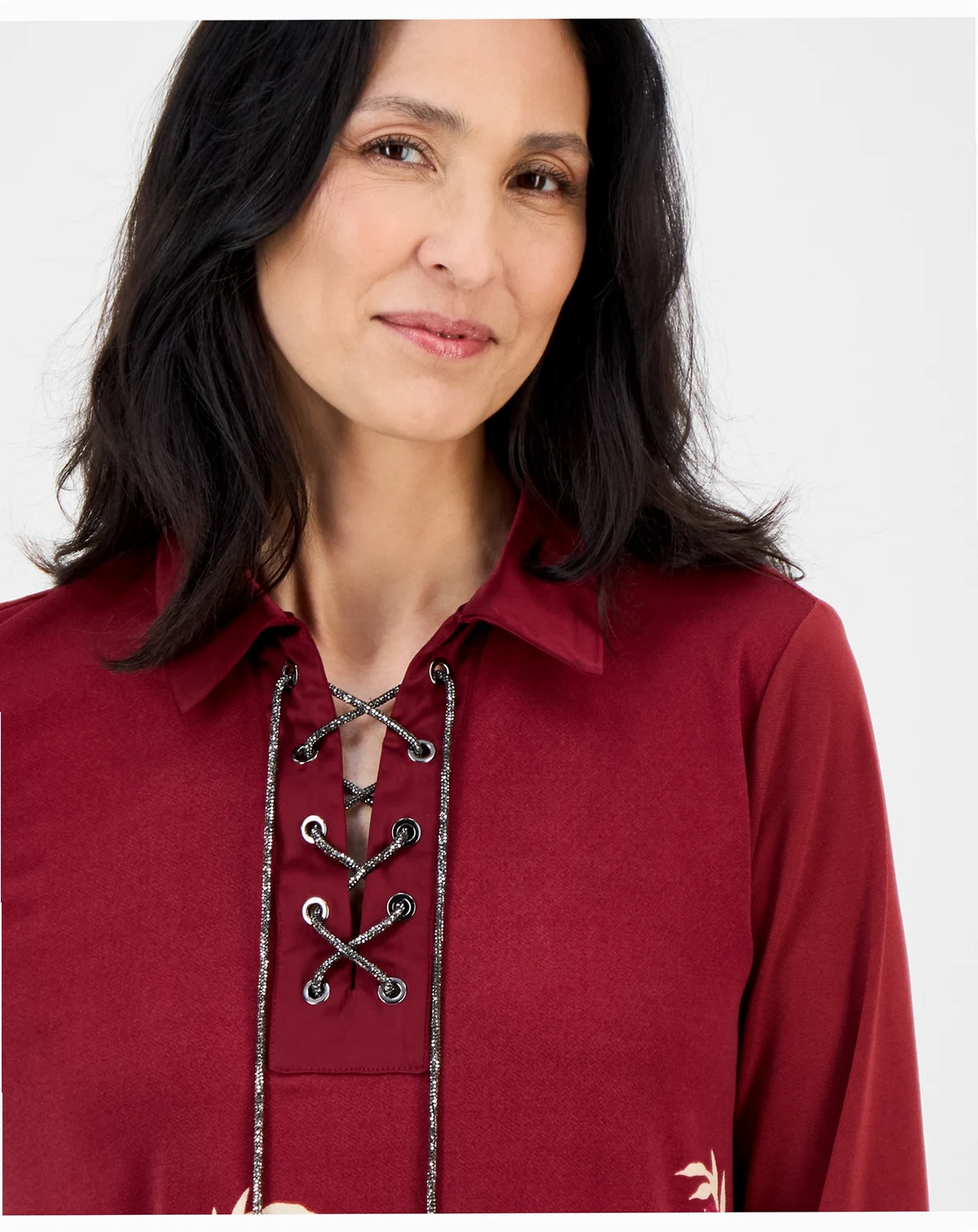 Women's Printed Lace-Up Collared Top, Exclusively at Macy's
