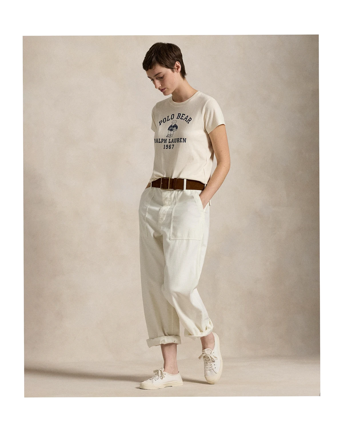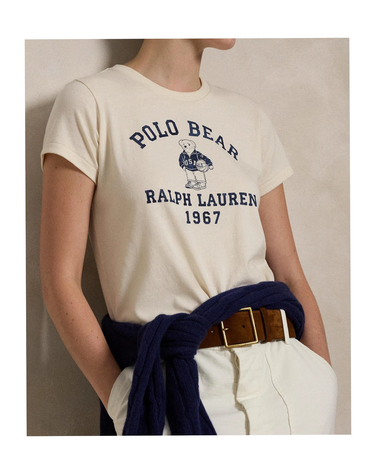 Approx. model height is 5'10" and she is wearing a size small; Size medium has an approx. 23-1/2" body length; Slightly relaxed fit with a fitted waist; intended to hit at the hip; Polo Bear and "Polo Bear Ralph Lauren 1967" printed at the center front
