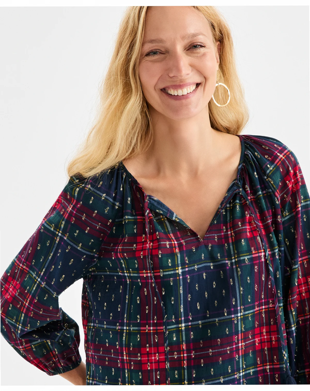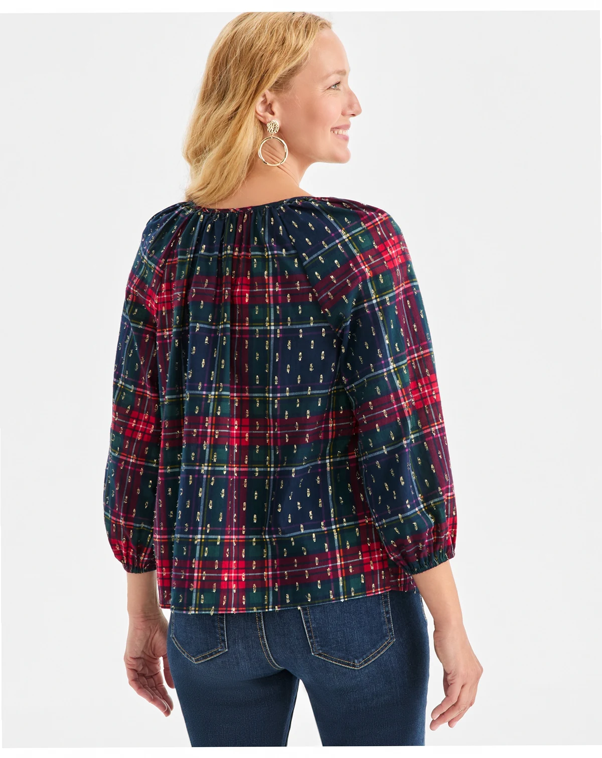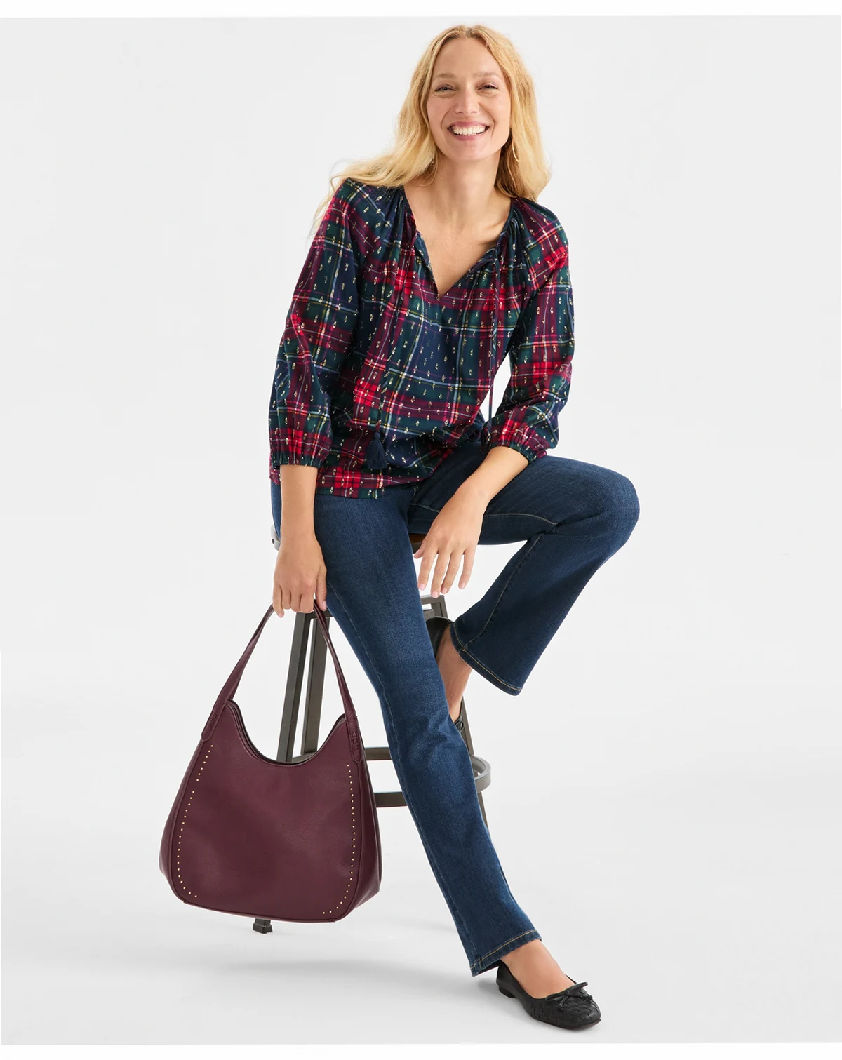 For an easy-going charm, this plaid top by Style & Co features raglan bracelet sleeves that allow effortless movement. The V-neck with a self-tie draws attention to the neckline and lets you tailor the look.