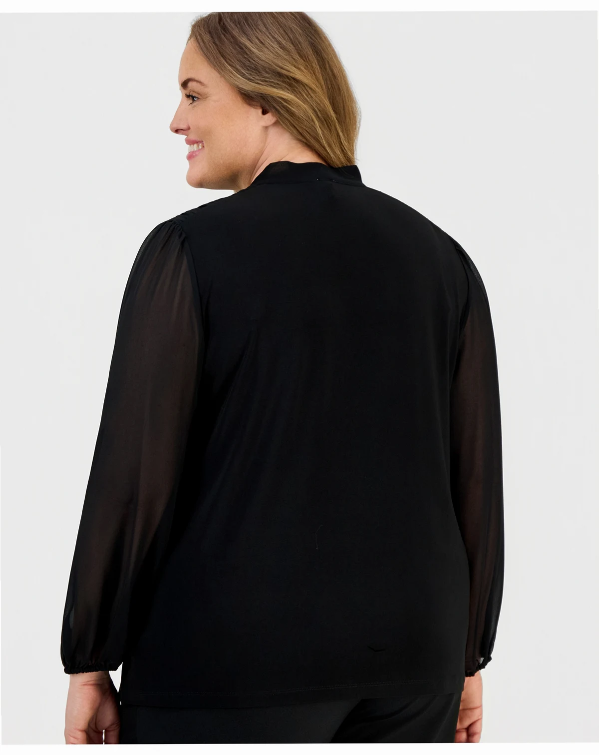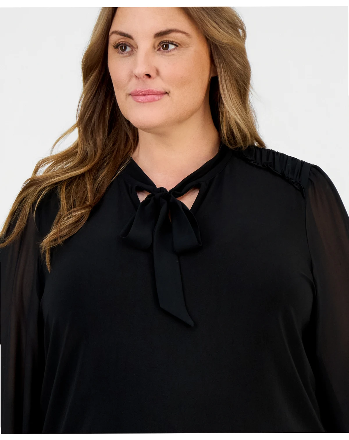 Tonal accents at the tie neck, shoulders, and sleeves add smart style to the soft shape of this plus size top from Anne Klein.