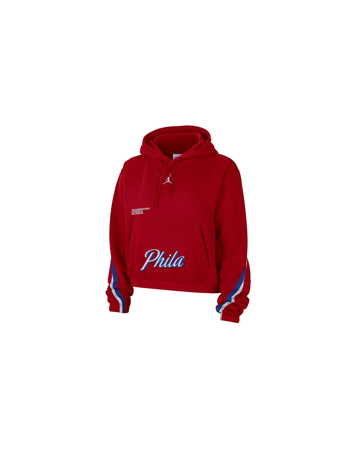 Stay warm and dress stylishly in this Philadelphia 76ers Courtside pullover hoodie from Jordan Brand. Its design is inspired by the team's Statement Edition jersey and features a fashionable cropped hem. The adjustable hood and roomy pouch pocket also give this Philadelphia 76ers pullover added heat.