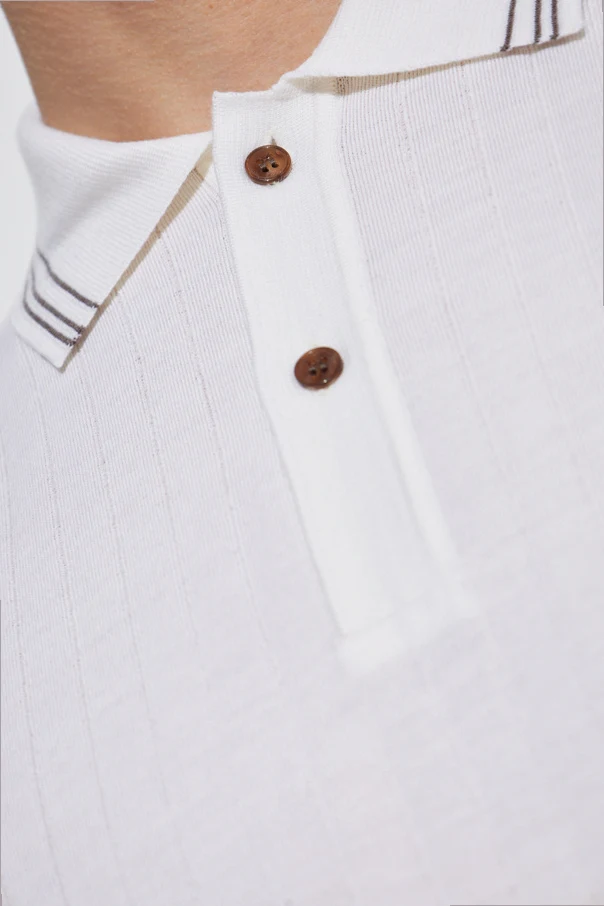 A subtle vertical micro-texture pattern infuses the piece with understated elegance, beautifully showcased upon close inspection. The refined cream hue complements its exclusivity and versatility, while the traditional polo collar, accented with contrasting double lines in a dark, distinguished shade, epitomizes elevated leisurewear.