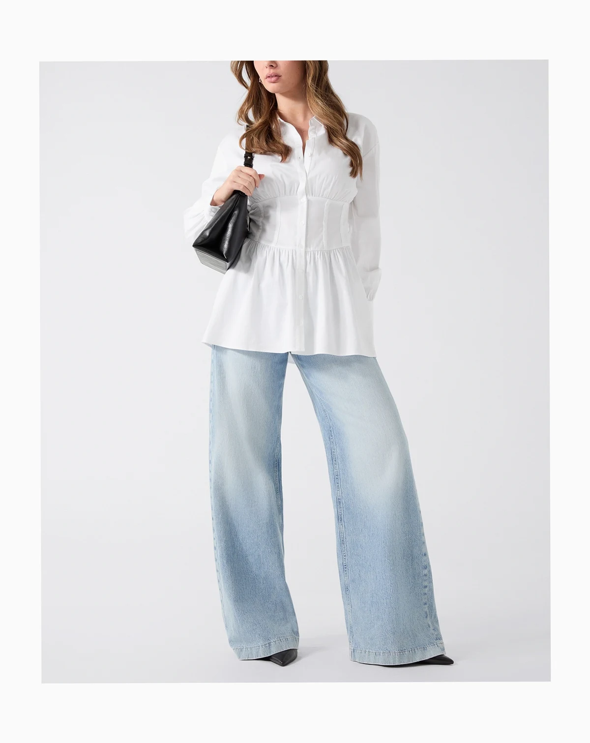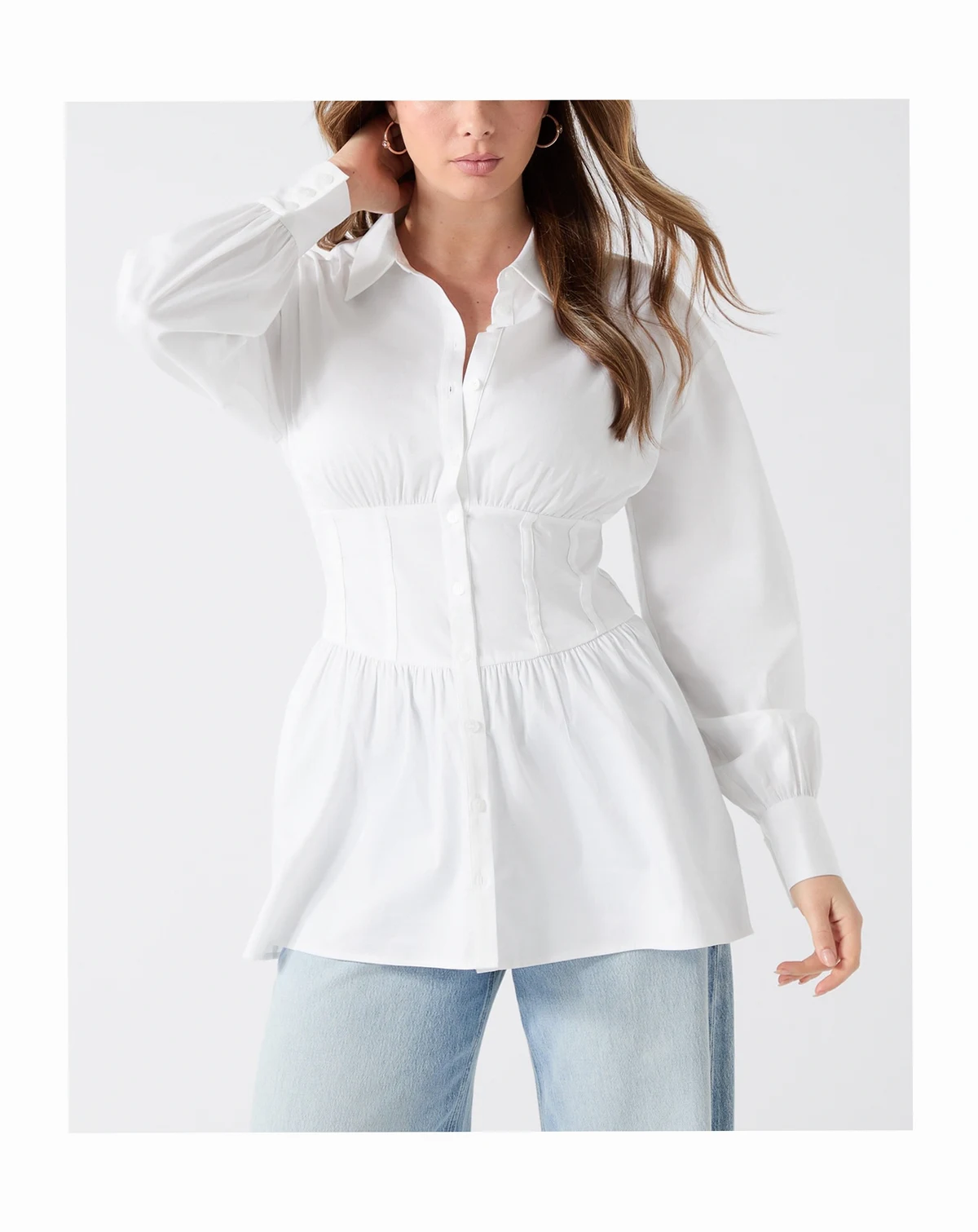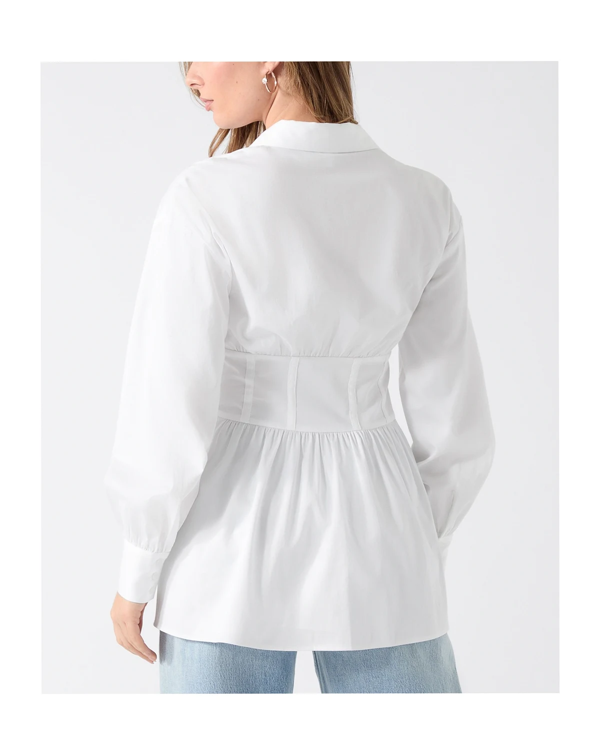 Effortless elegance defines this GUESS Lori Corset shirt top, crafted in crisp white fabric with a gathered waist to enhance the silhouette. Its flared hem provides a soft, flowing shape, while long sleeves offer graceful coverage. The collared neckline and button-front closure deliver classic polish.