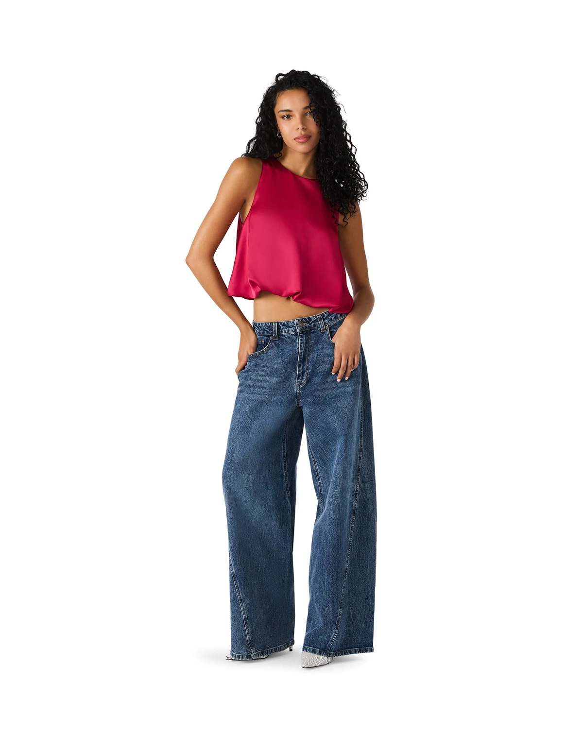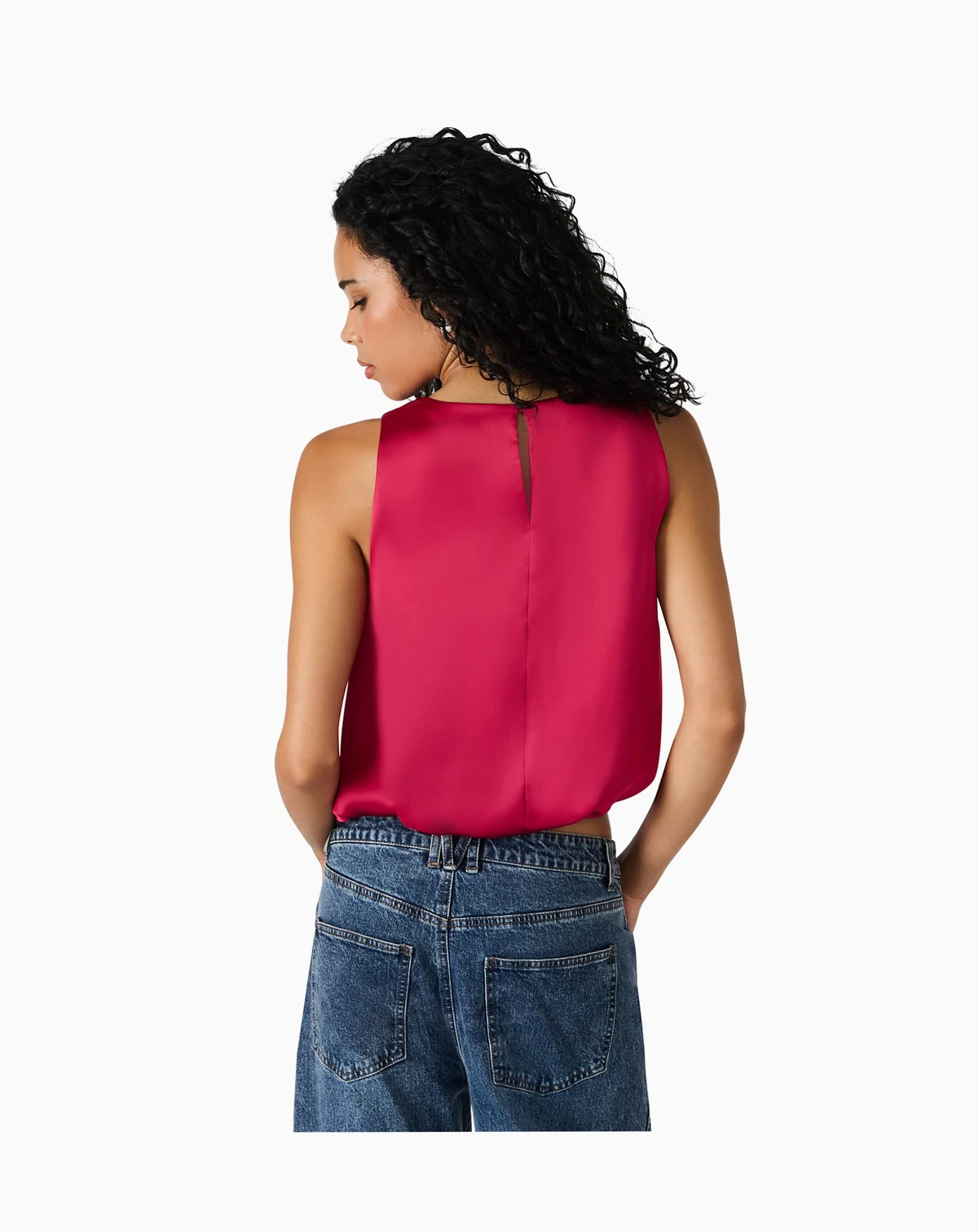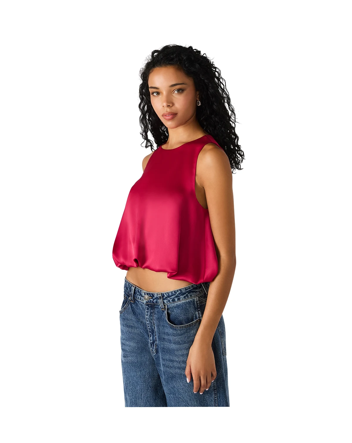 A sleek satin finish defines this Steve Madden Yazmin top, styled in a bubble silhouette that adds modern volume. Its sleeveless design is elevated with a high neckline and a back keyhole closure for a polished touch.