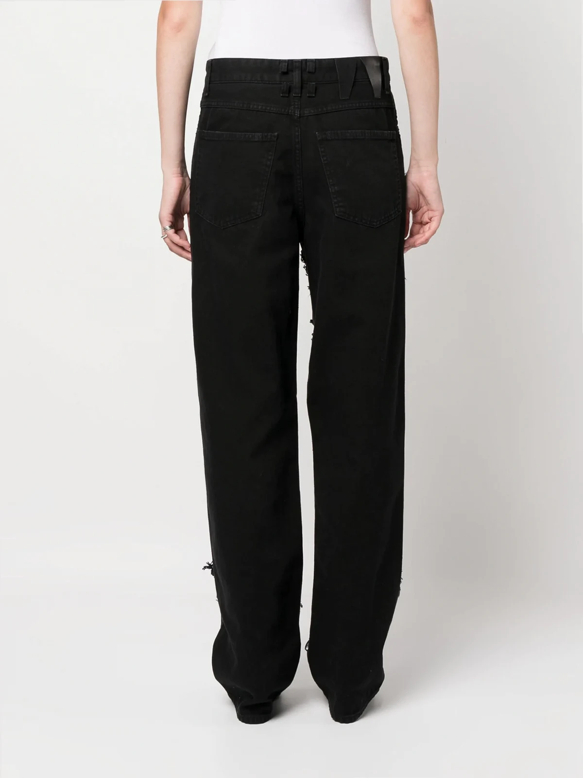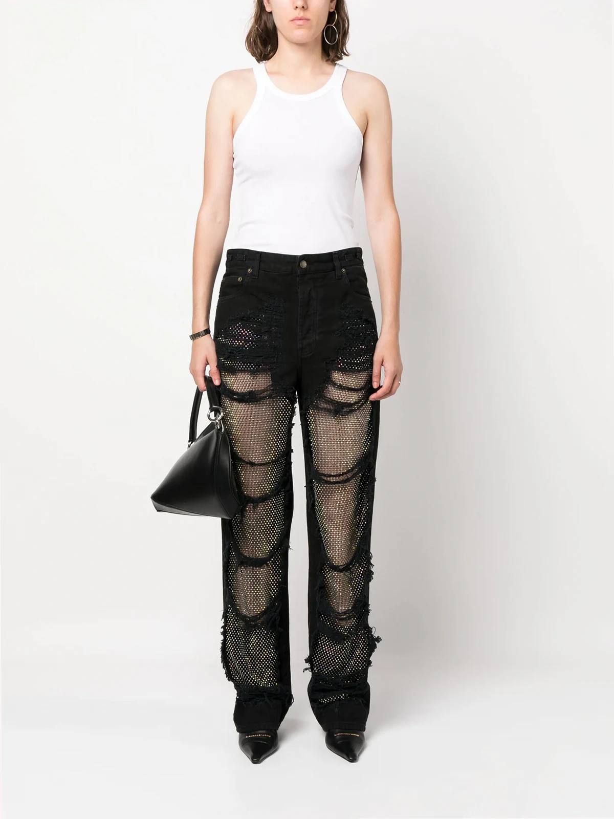 black cotton denim mesh panelling crystal embellishment ripped detailing belt loops front button fastening mid-rise straight leg classic five pockets