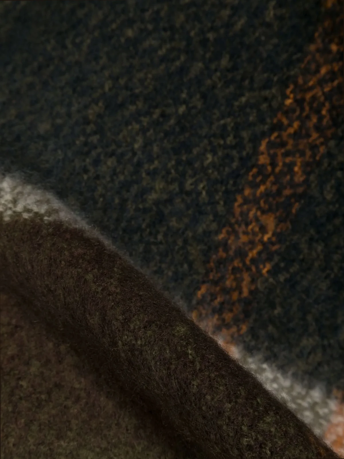 forest green plaid check pattern fringed edge V-neck asymmetric hem cape design