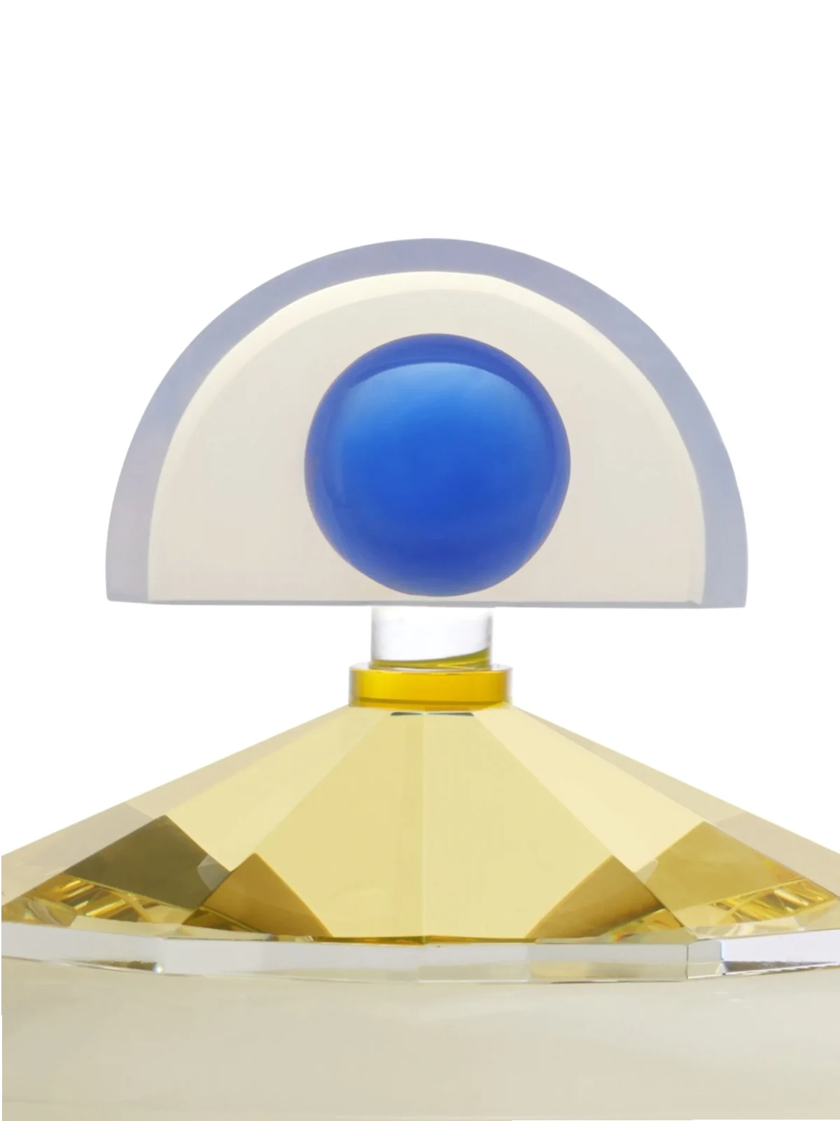 crystal-detail decorative bowl from Reflections Copenhagen featuring crystal, onyx stone, cylindrical design, matching lid and cloud white/royal blue/light yellow.