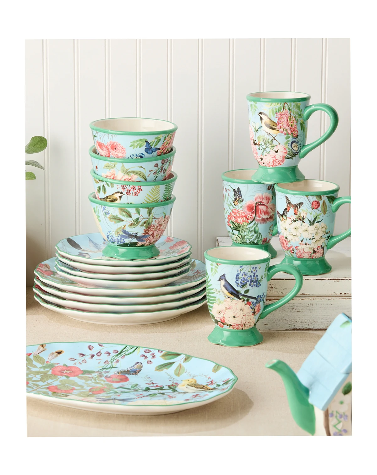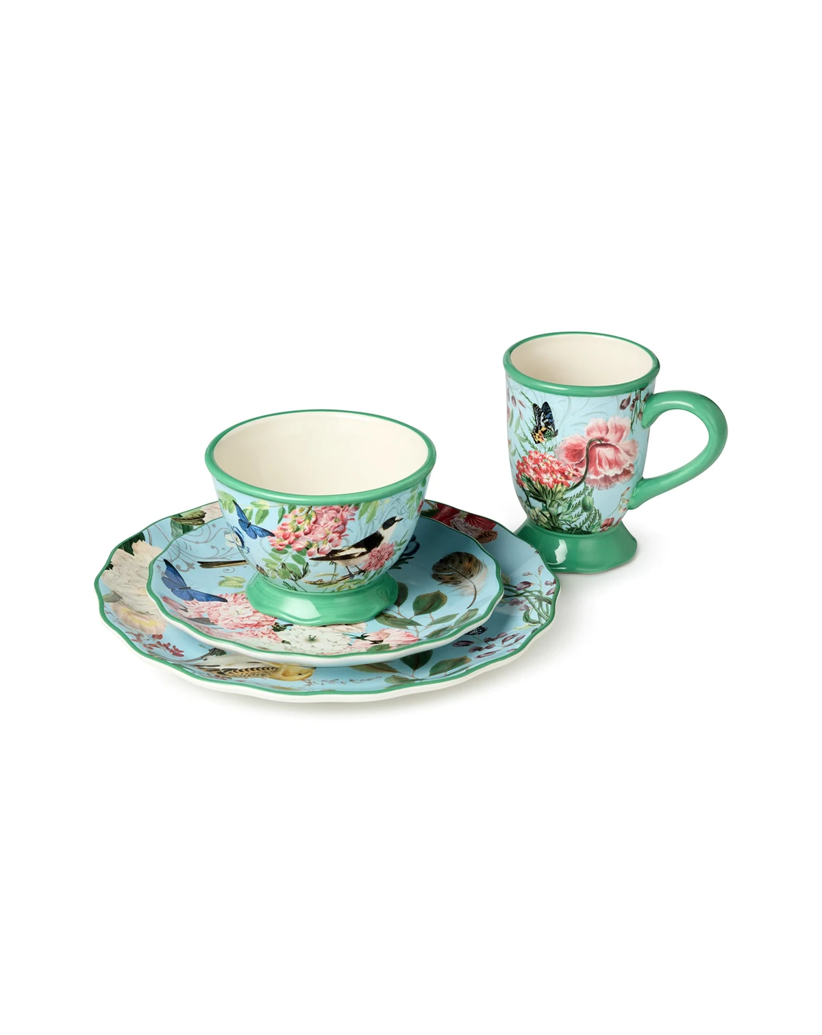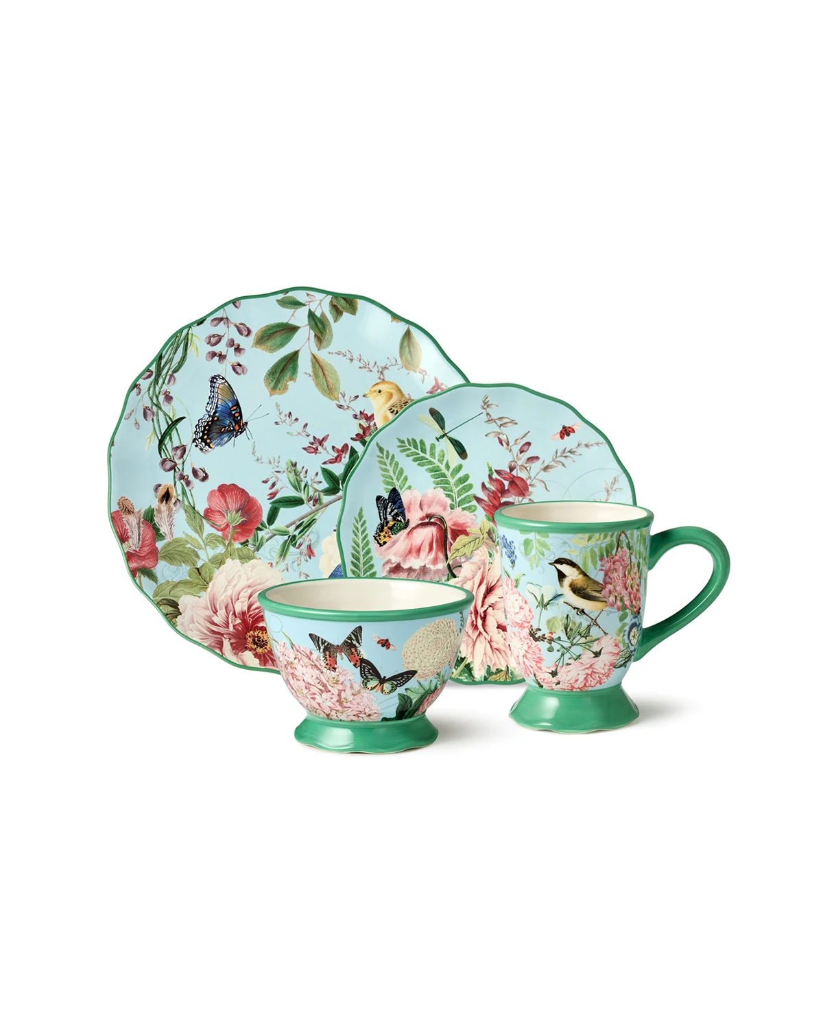 A stunning blend of practicality and artistic charm. Featuring a vibrant, colorful tableware design inspired by nature, this floral dinnerware set includes delicate hues of green, blue, and yellow, accented by butterfly and dragonfly motifs. Crafted from high-quality ceramic, the pedestal base of the bowls and mugs adds elegance and functionality, creating a sophisticated statement at every meal. Perfect for casual dining or entertaining guests, this durable dinnerware is designed to elevate your kitchen essentials. Its artistic floral patterns bring a vibrant and inviting touch to your table, while its thoughtful design makes it a giftable dinnerware set ideal for housewarmings, weddings, or holidays.