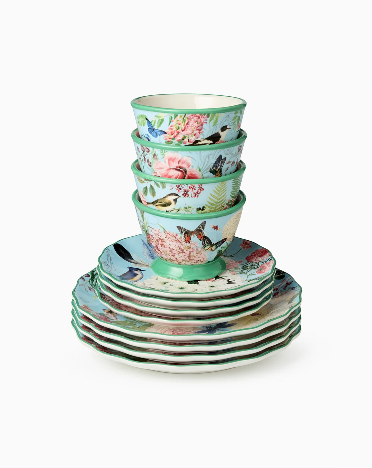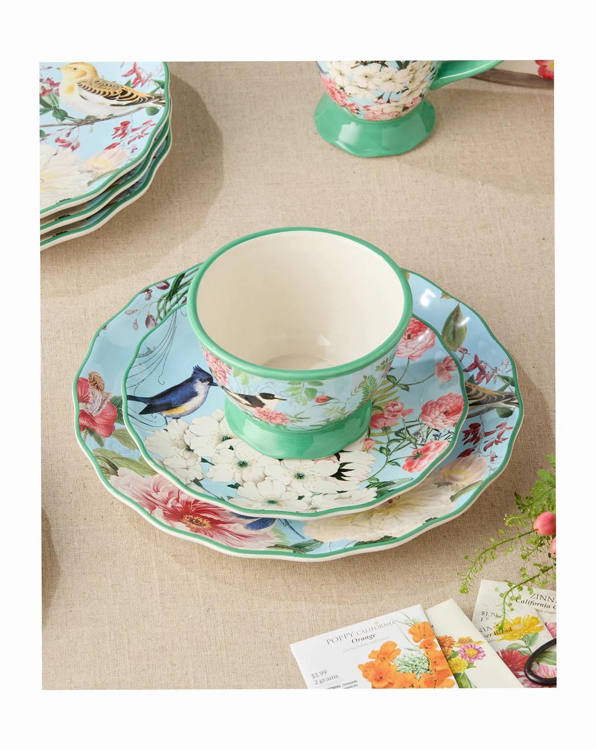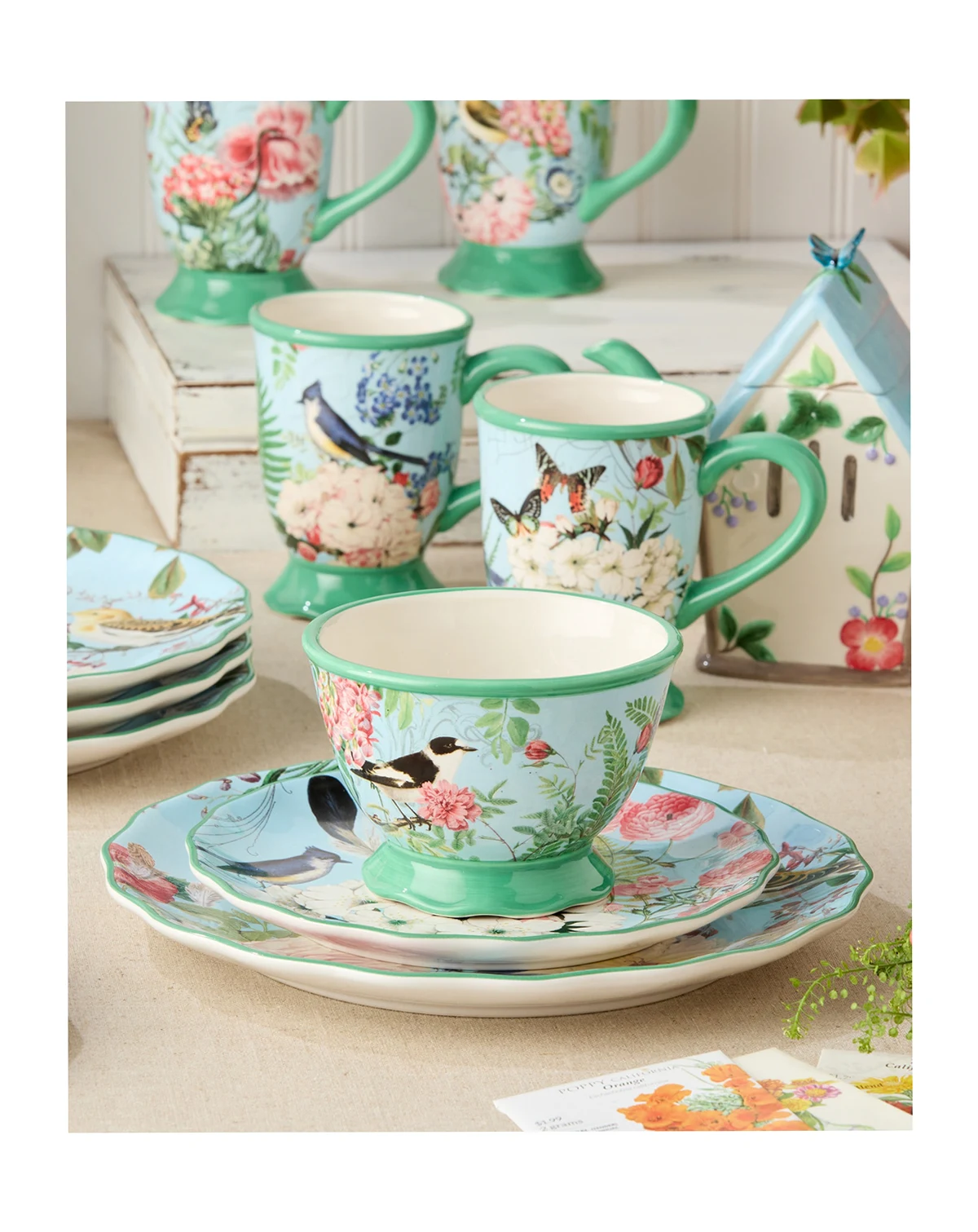 A stunning blend of practicality and artistic charm. Featuring a vibrant, colorful tableware design inspired by nature, this floral dinnerware set includes delicate hues of green, blue, and yellow, accented by butterfly and dragonfly motifs. Crafted from high-quality ceramic, the pedestal base of the bowls and mugs adds elegance and functionality, creating a sophisticated statement at every meal. Perfect for casual dining or entertaining guests, this durable dinnerware is designed to elevate your kitchen essentials. Its artistic floral patterns bring a vibrant and inviting touch to your table, while its thoughtful design makes it a giftable dinnerware set ideal for housewarmings, weddings, or holidays.
