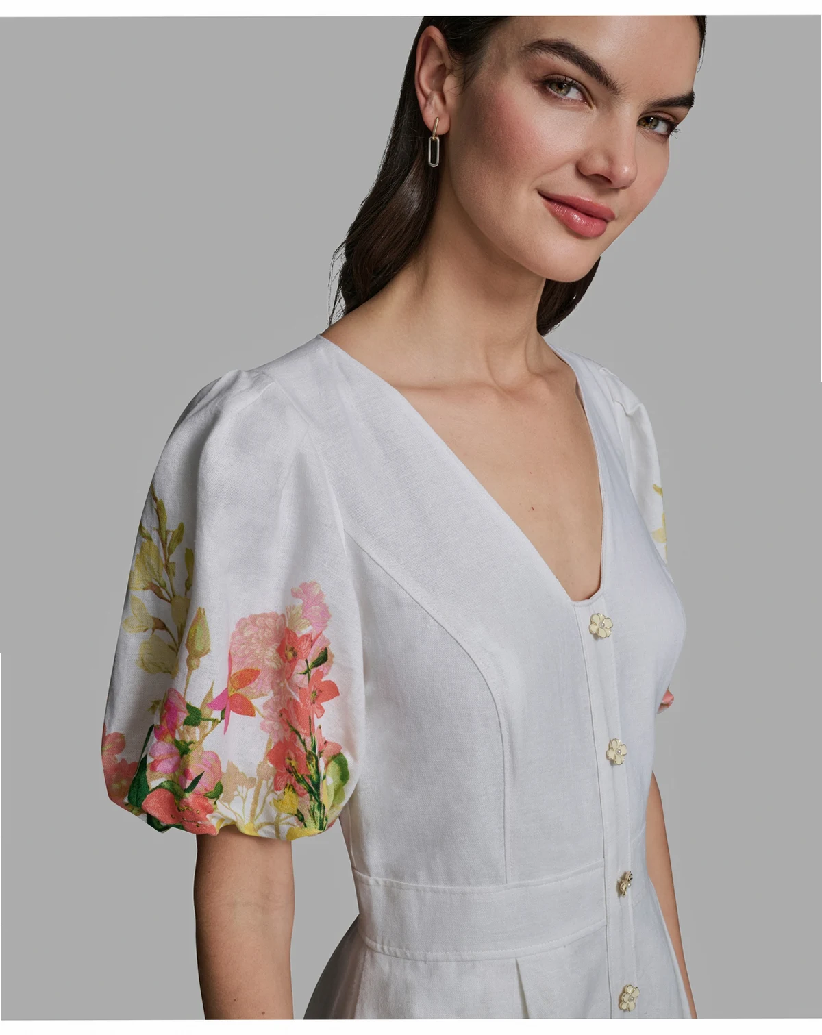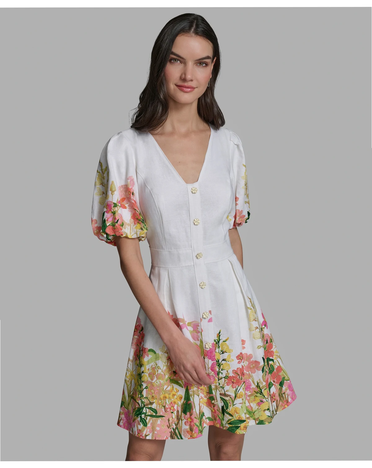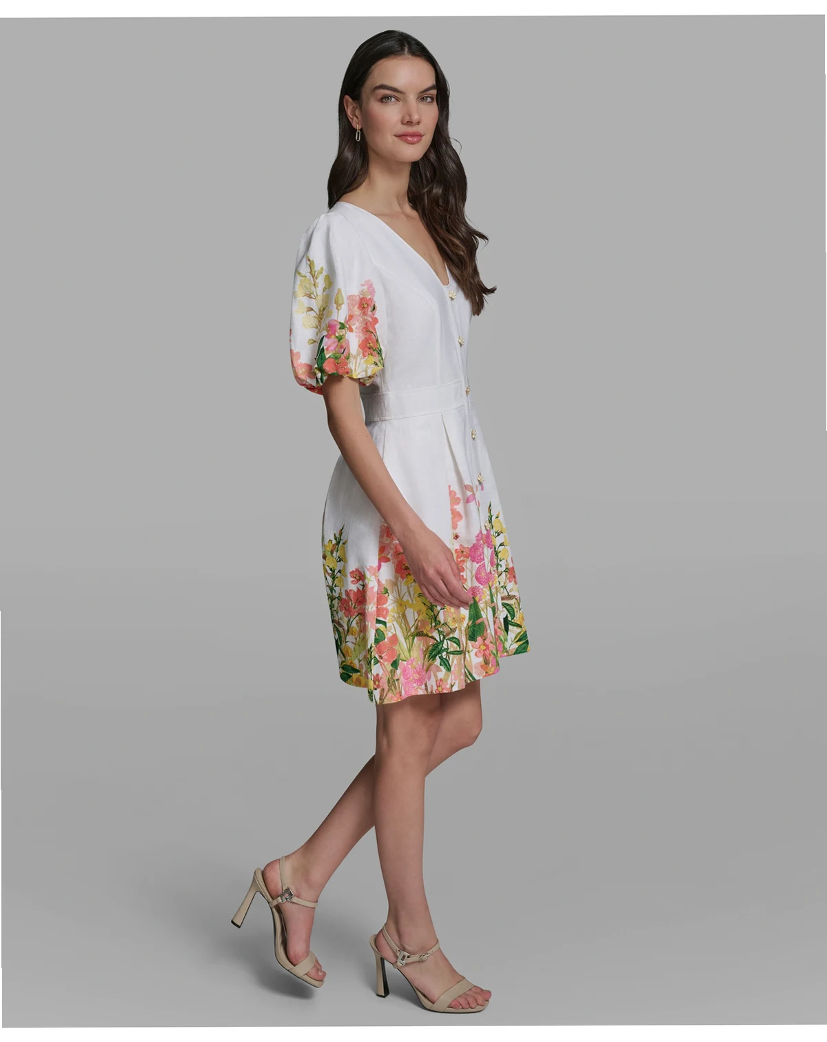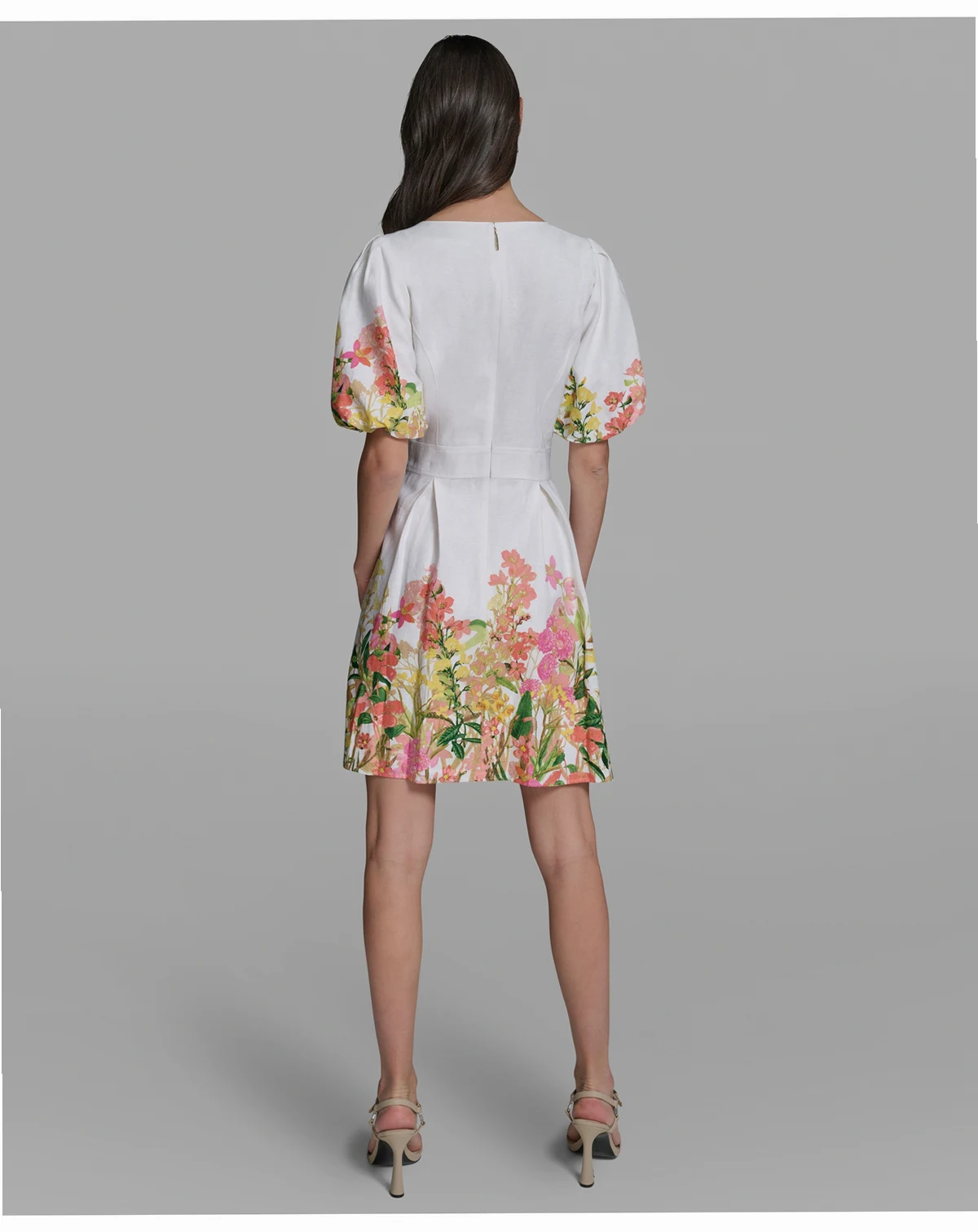 Embrace playful elegance with this KARL LAGERFELD PARIS fit-and-flare dress, featuring a flattering V-neck and puff sleeves. Side seam pockets and a center-back zipper combine practicality with charm, while the floral border print adds a touch of springtime sophistication.