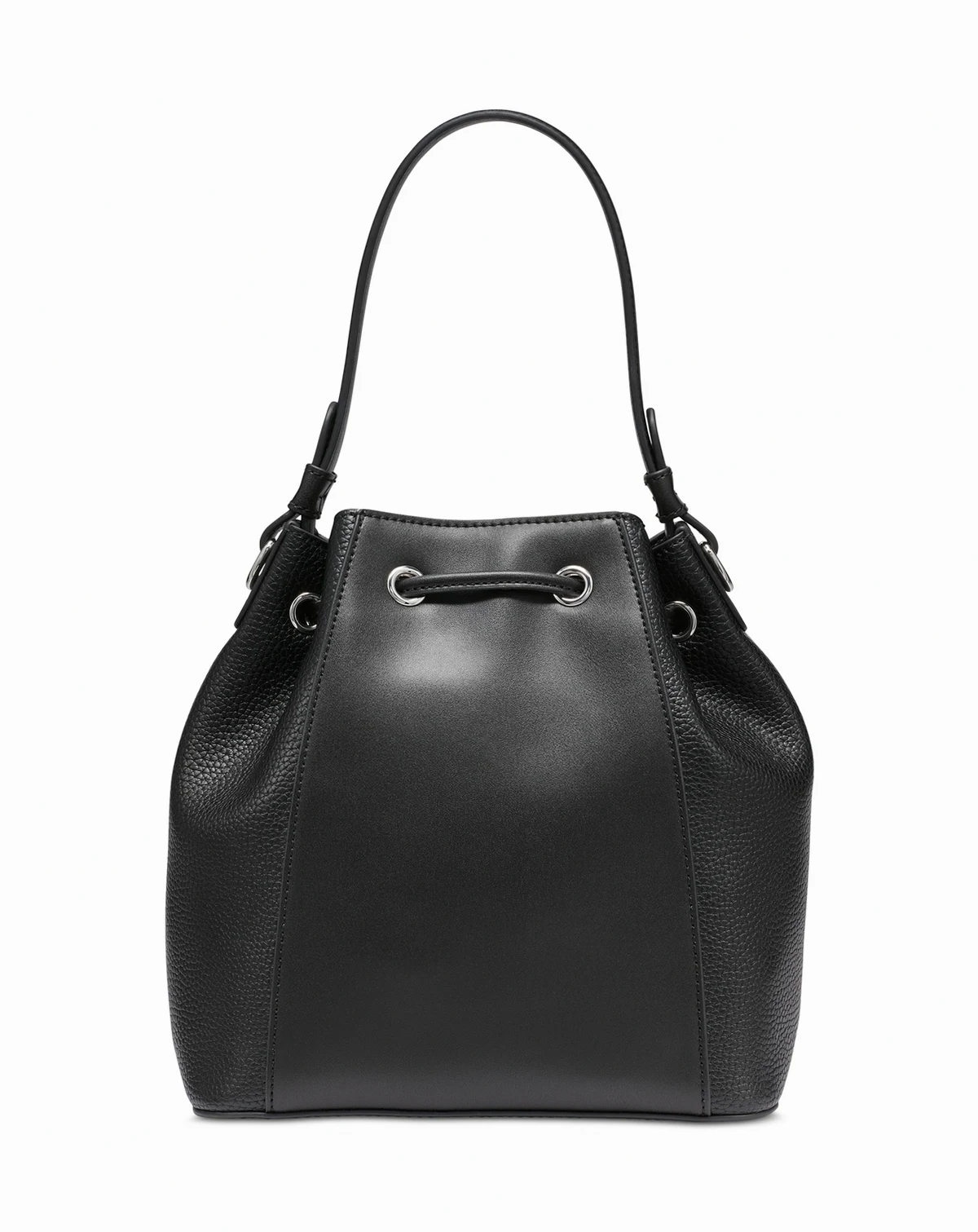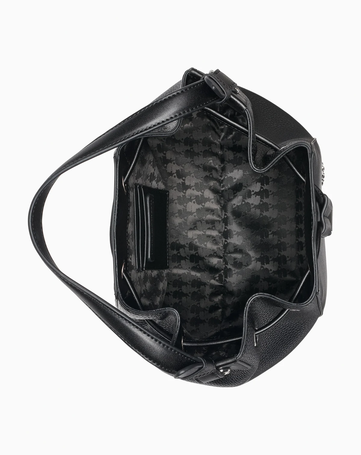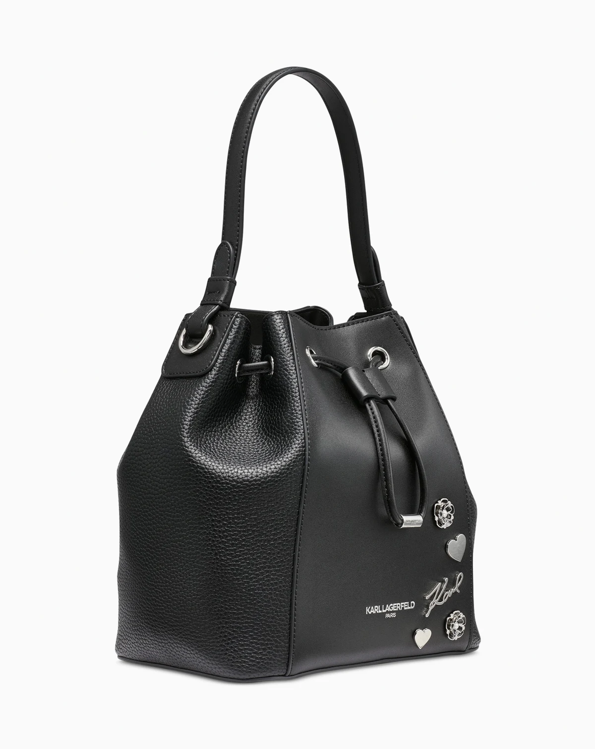 The Karl Lagerfeld Paris Adele Bucket Bag delivers streamlined sophistication with its sleek silhouette, removable logo web strap, and hanging charms that add an elegant finish. Equally chic over the shoulder or across the body, this bag is your go-to for effortlessly elevated everyday style.