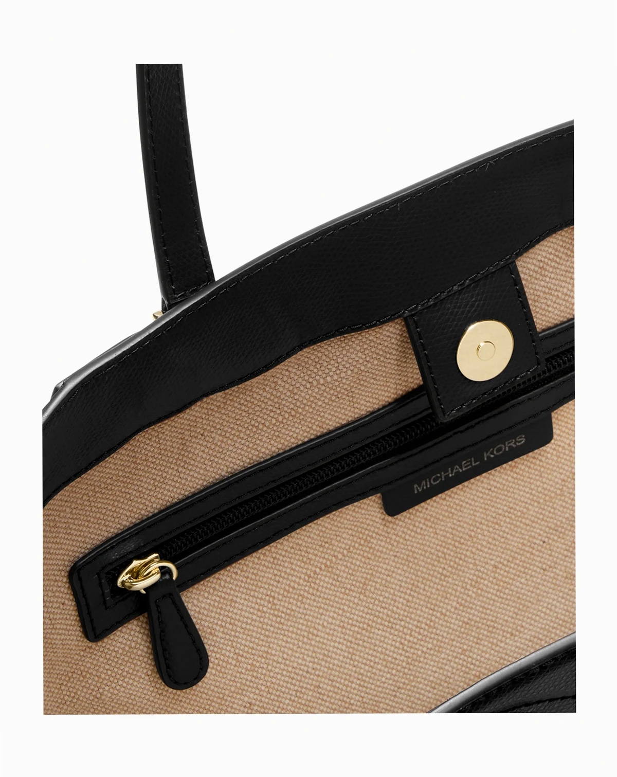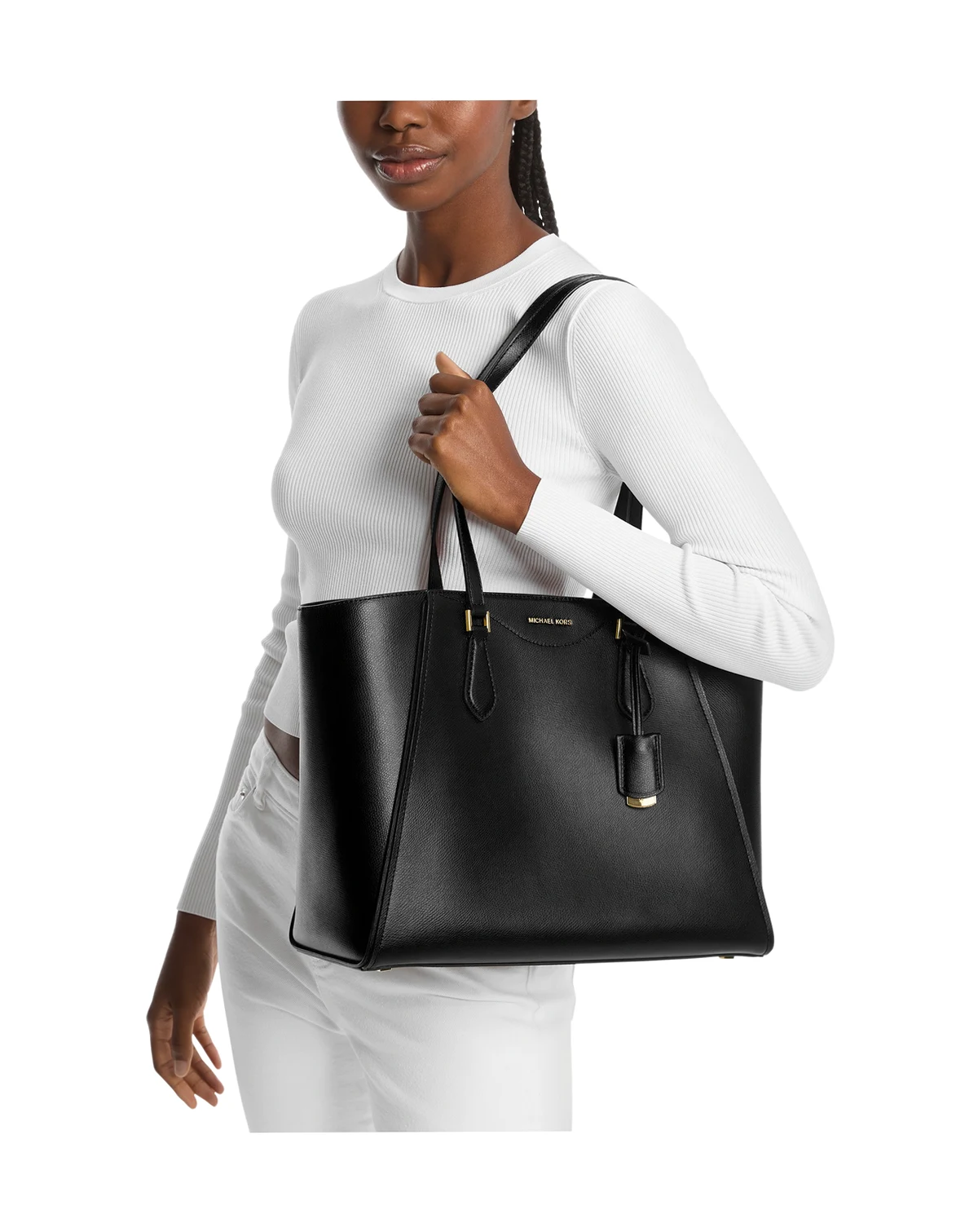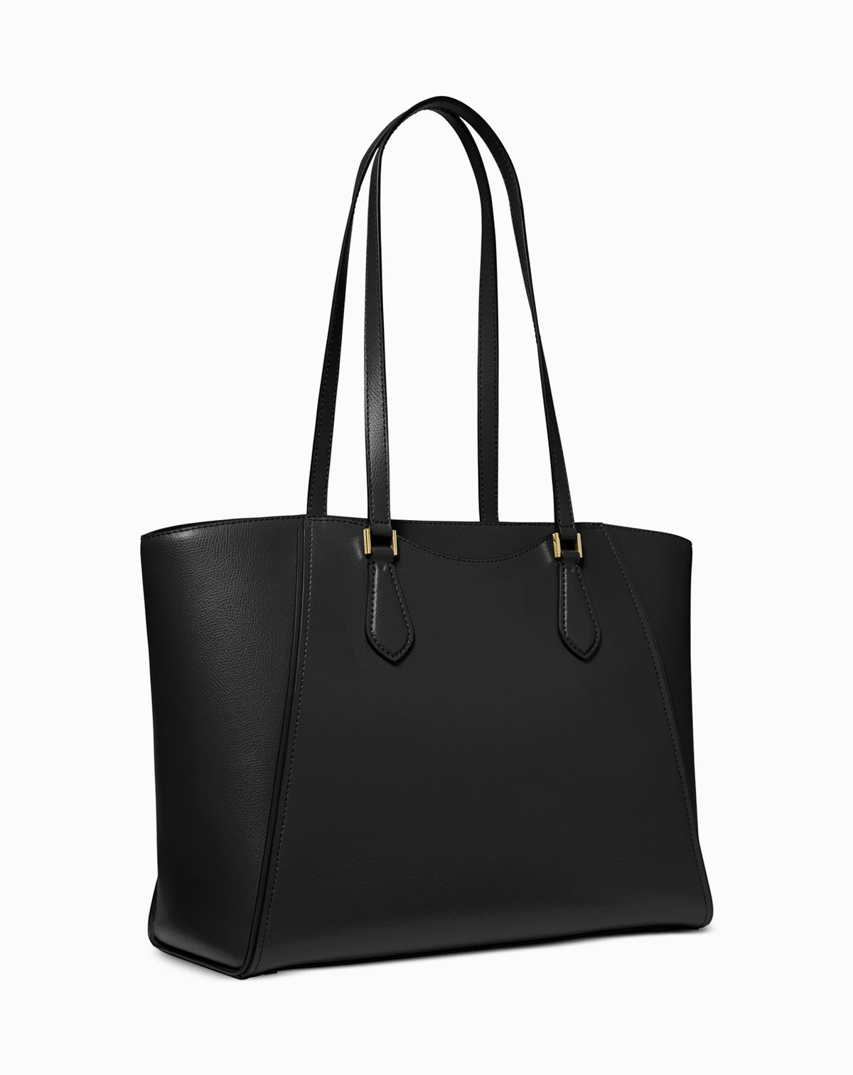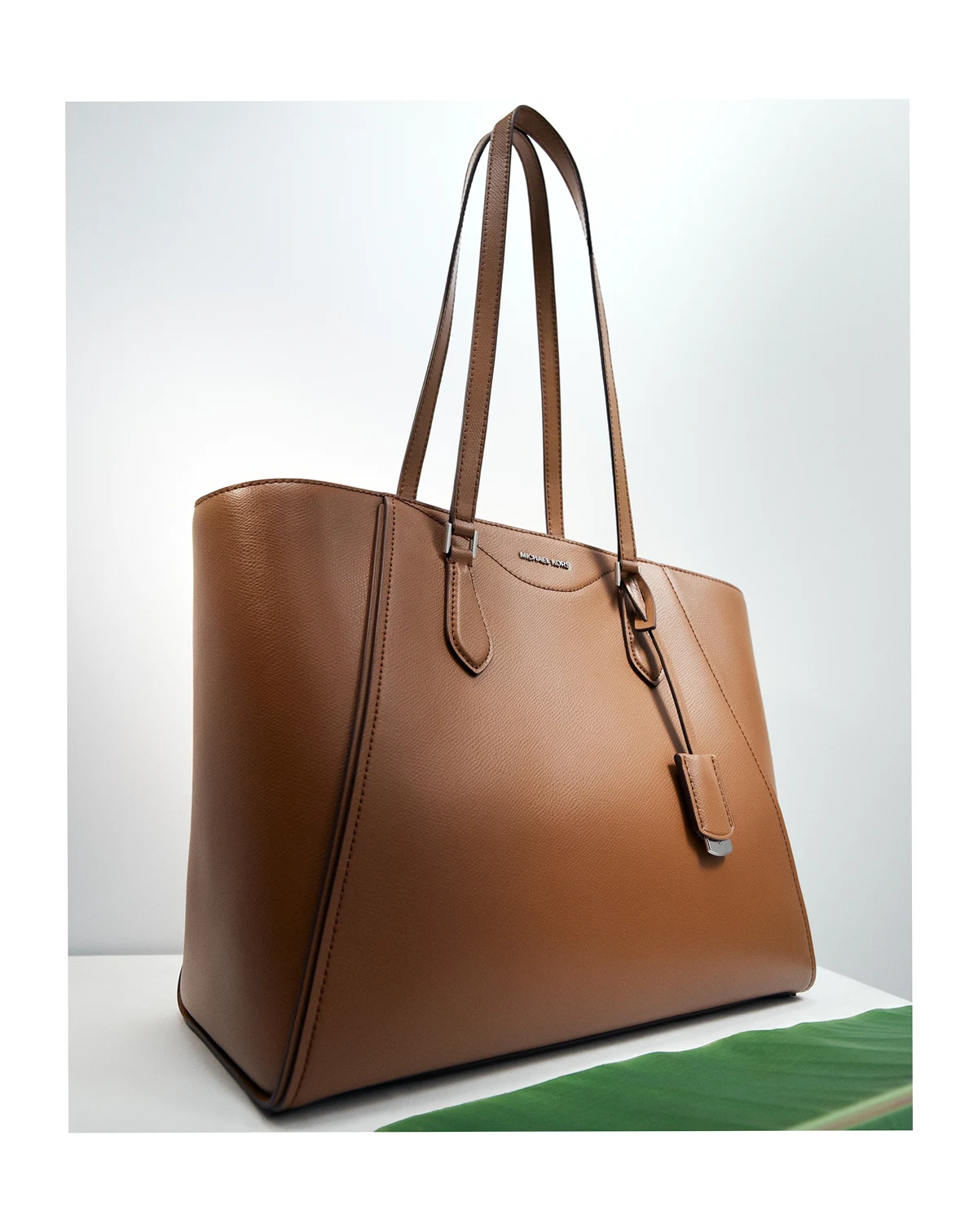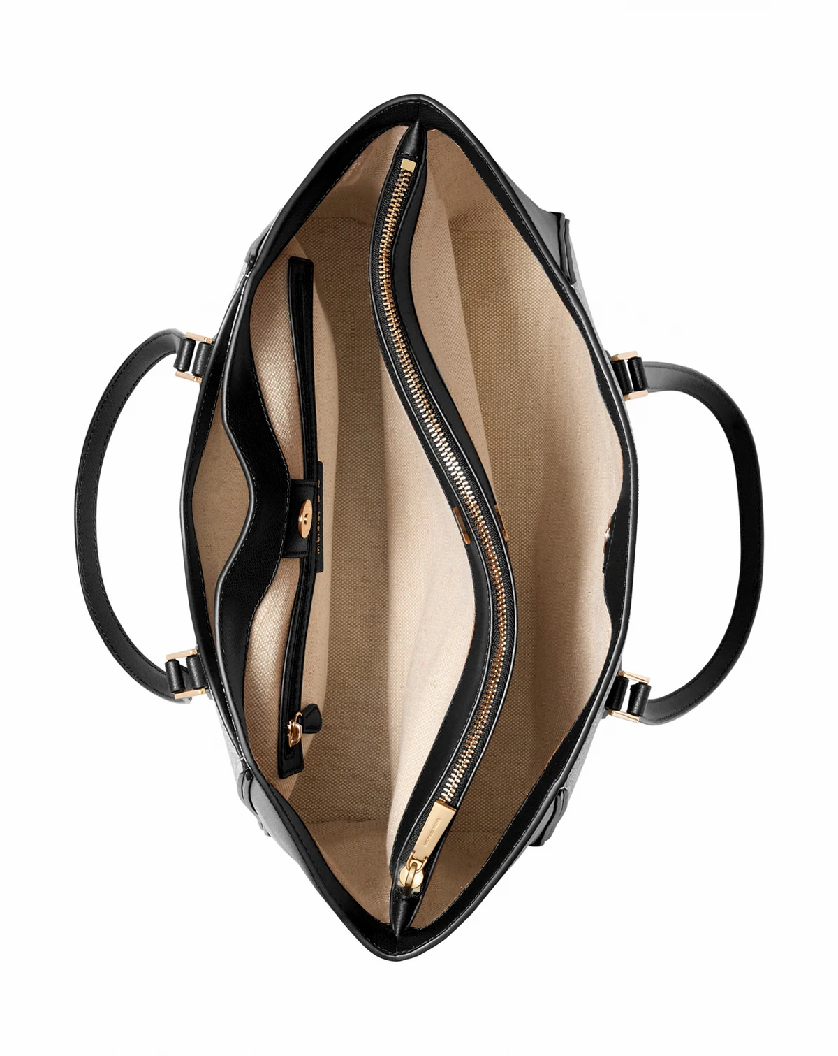 Crafted from Sahara Leather, the Taryn tote is the ultra-sleek carryall that re-defines on the go style. This bag opens up to a well pocketed interior featuring longer shoulder straps to easily slip over the shoulder.