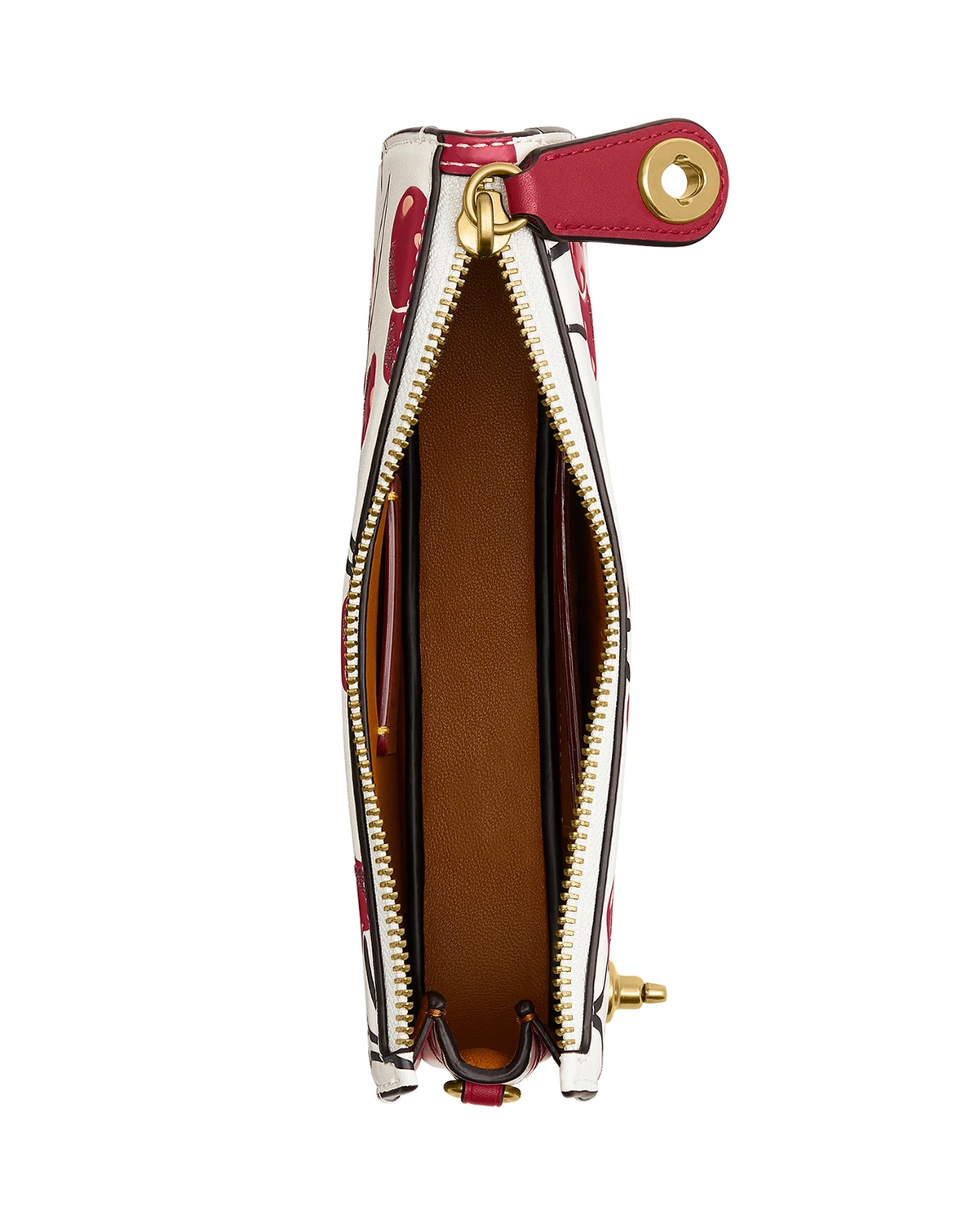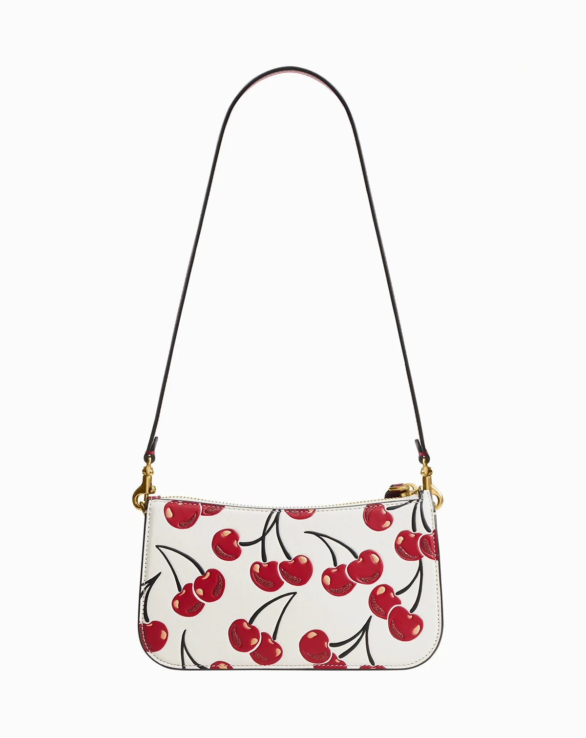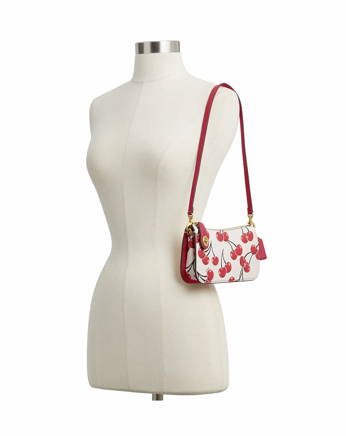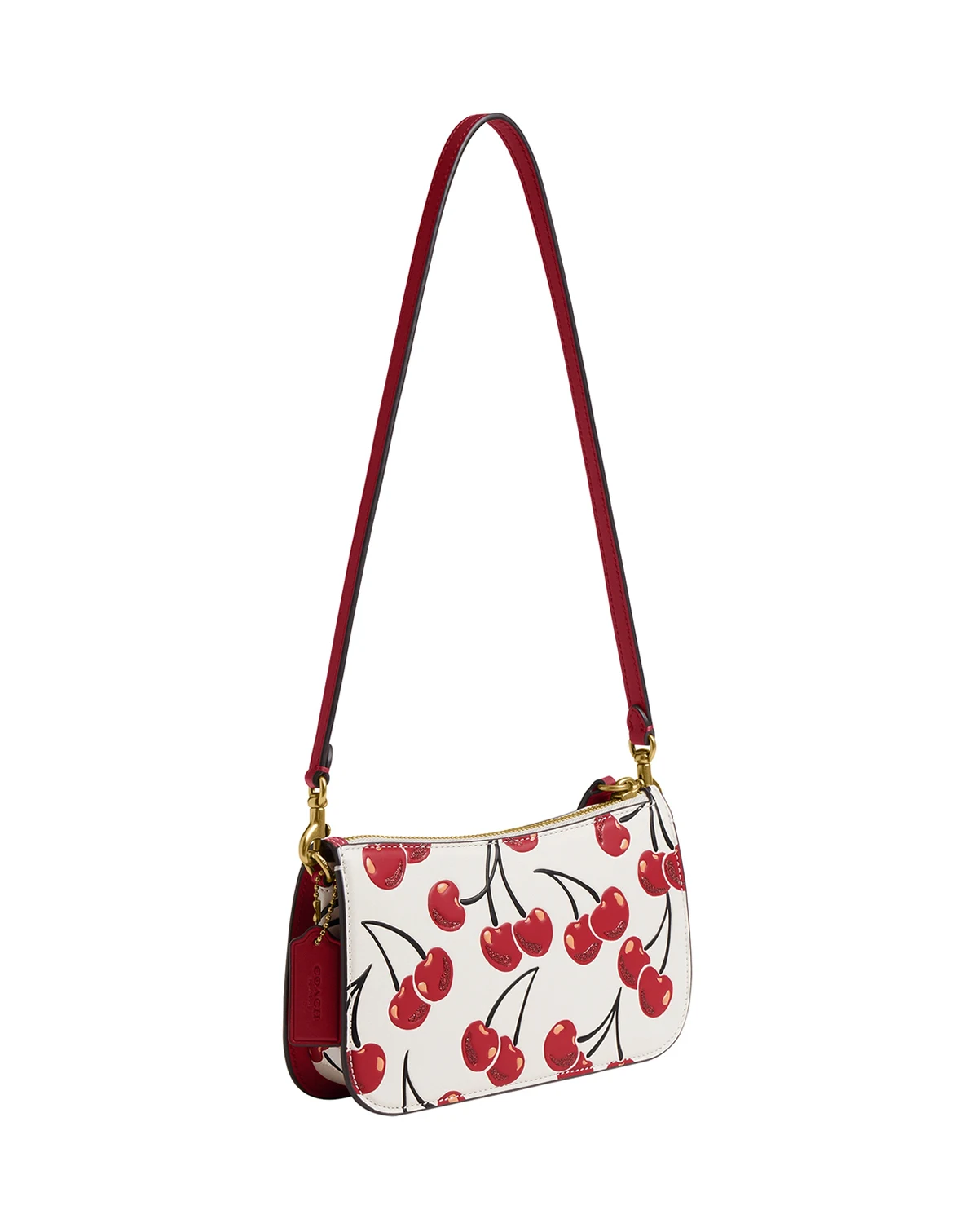 Make a statement with this COACH handbag, featuring a playful cherry print and a detachable strap for versatile styling. It includes a zip-top closure for secure storage and three credit card slots to keep your essentials organized.