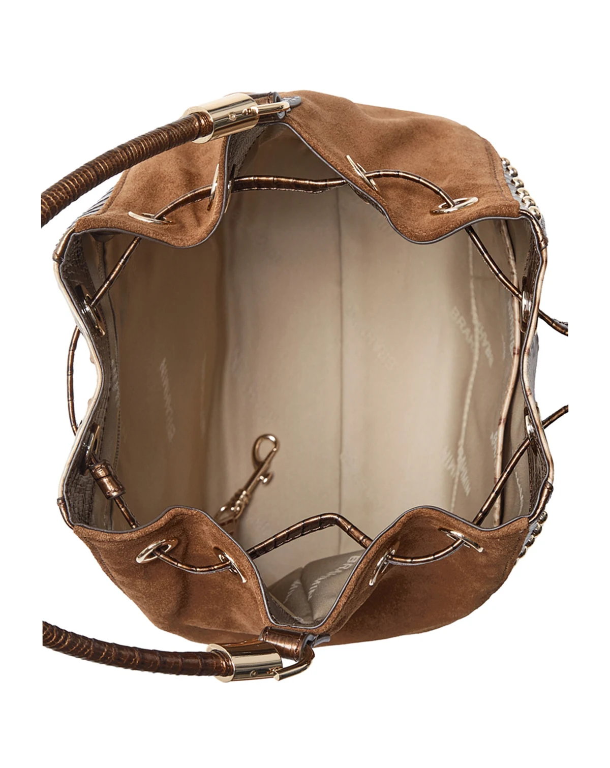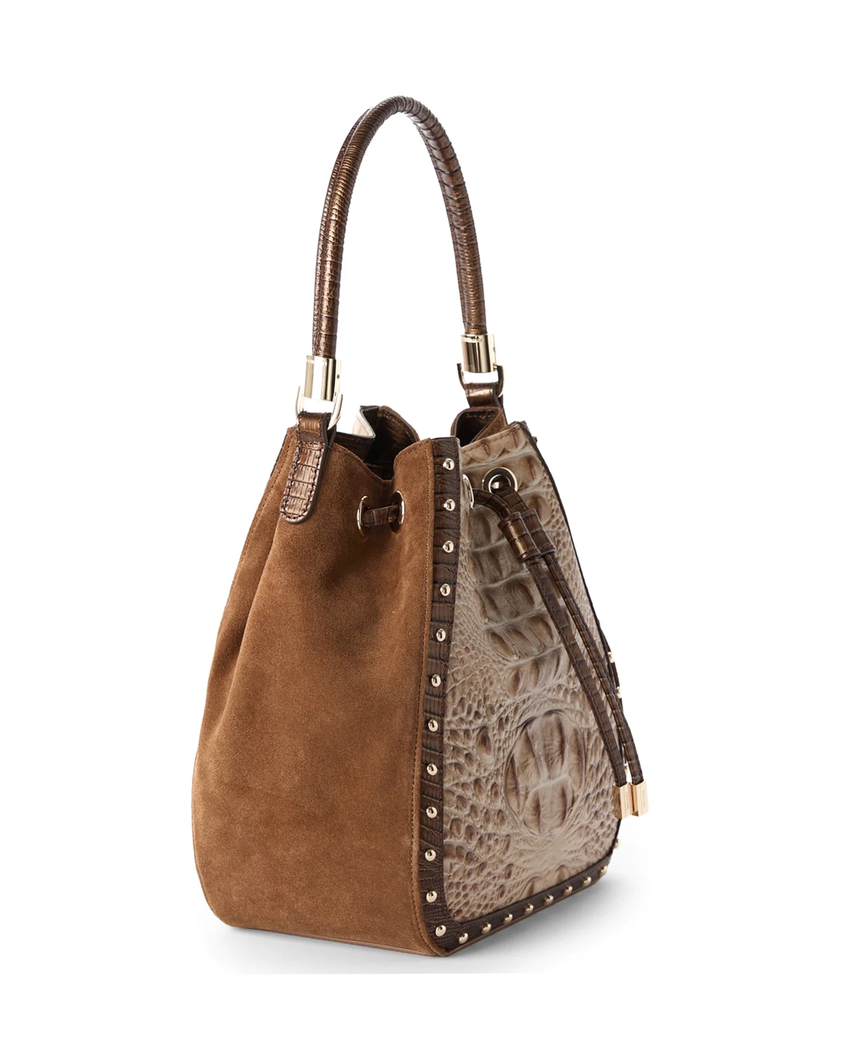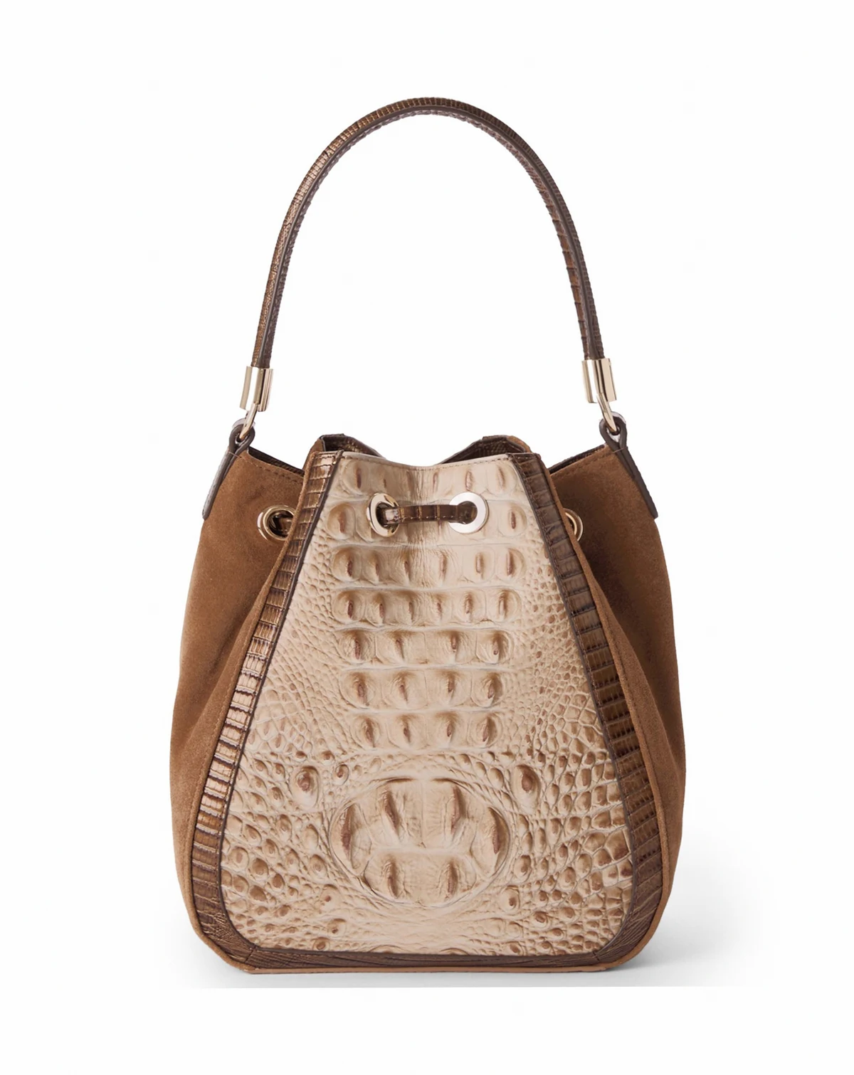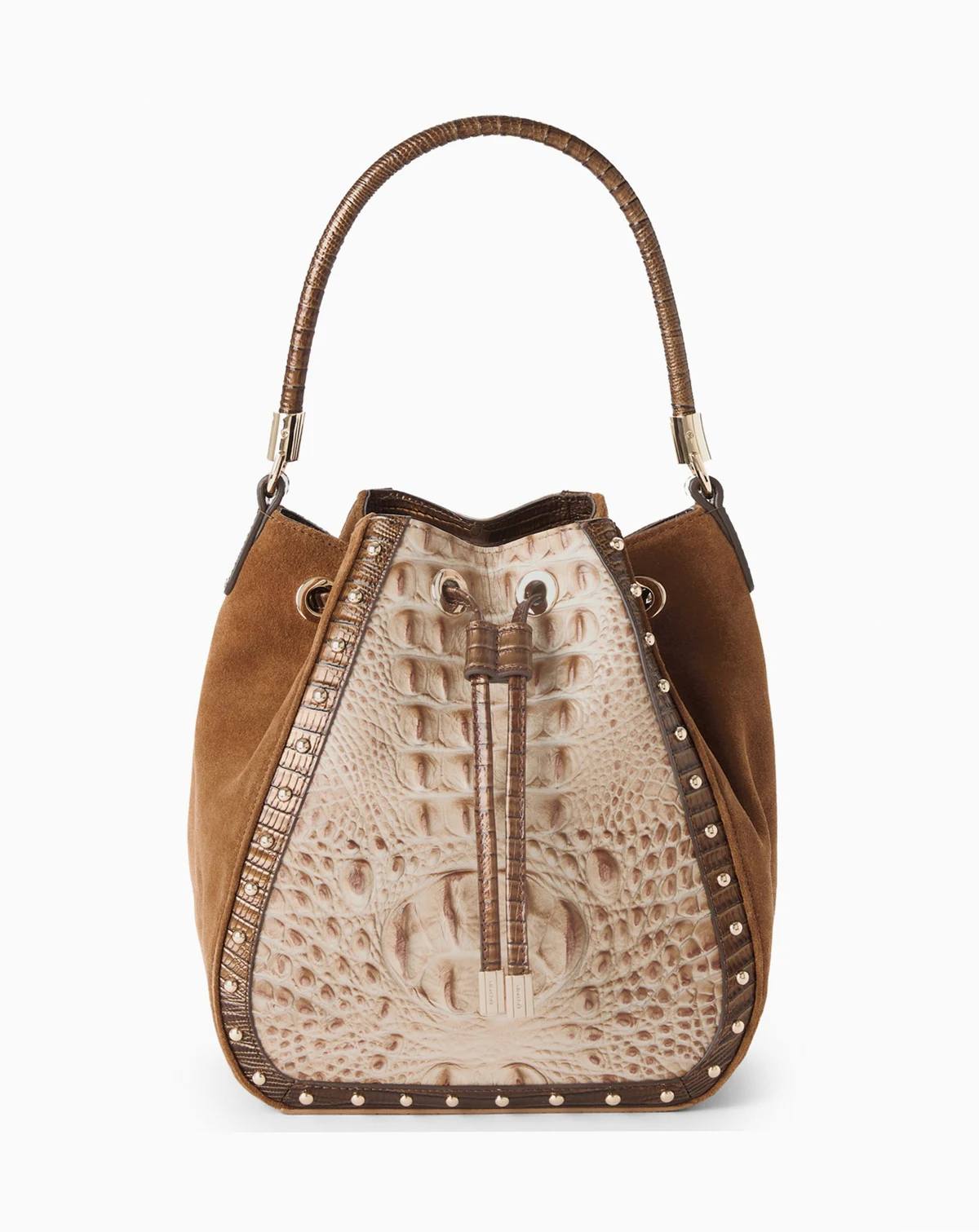Feeling fresh and modern with its curved silhouette, this Brahmin bucket bag is designed with new branded metal caps on the drawstrings. Interior pockets, including a secure jewelry pocket, allow for effortless organization.