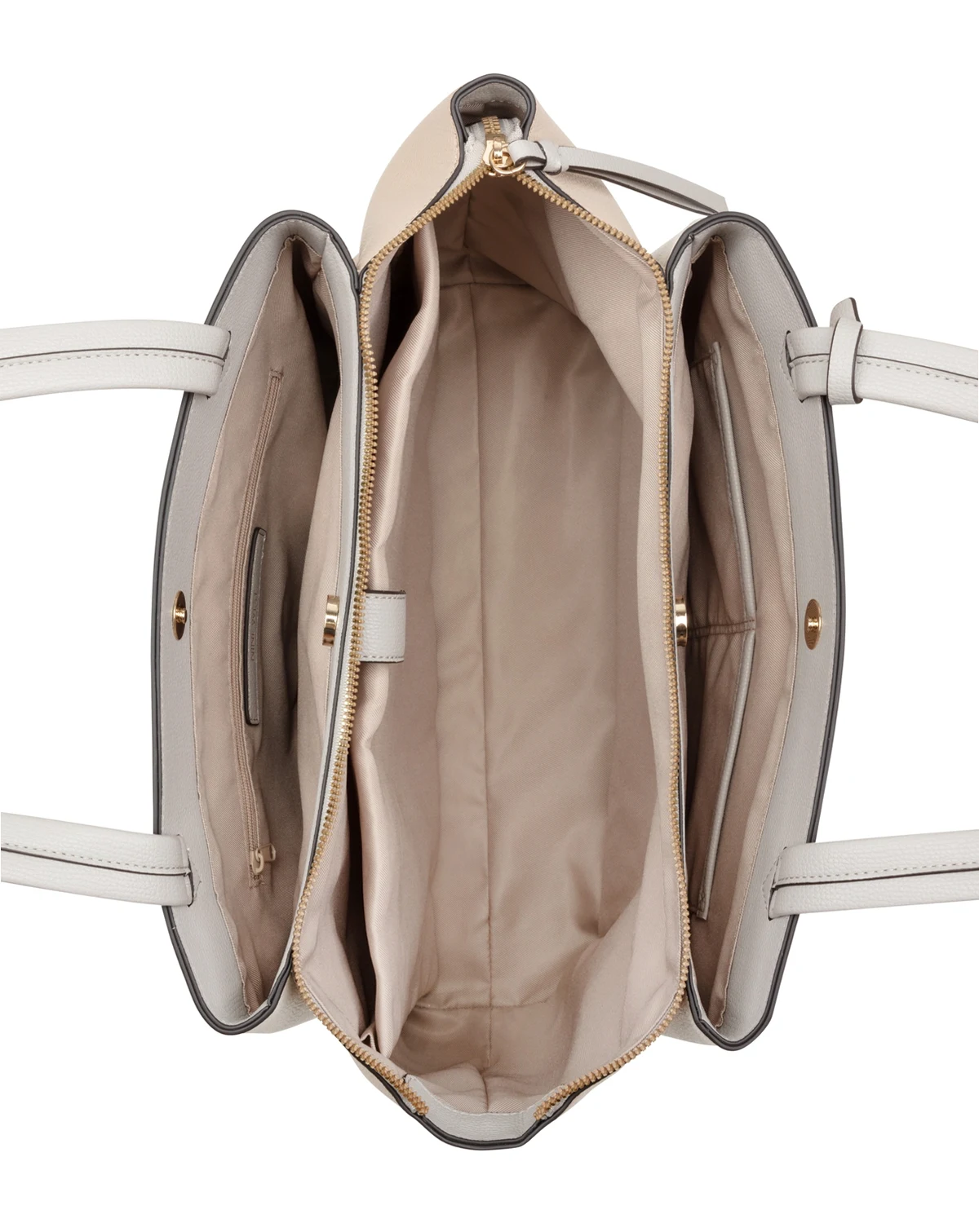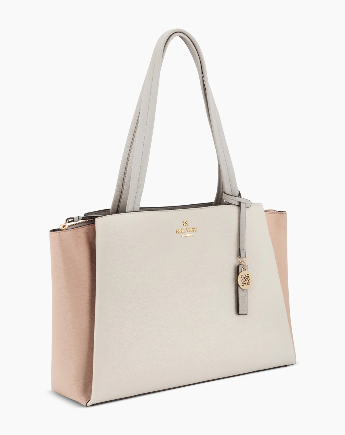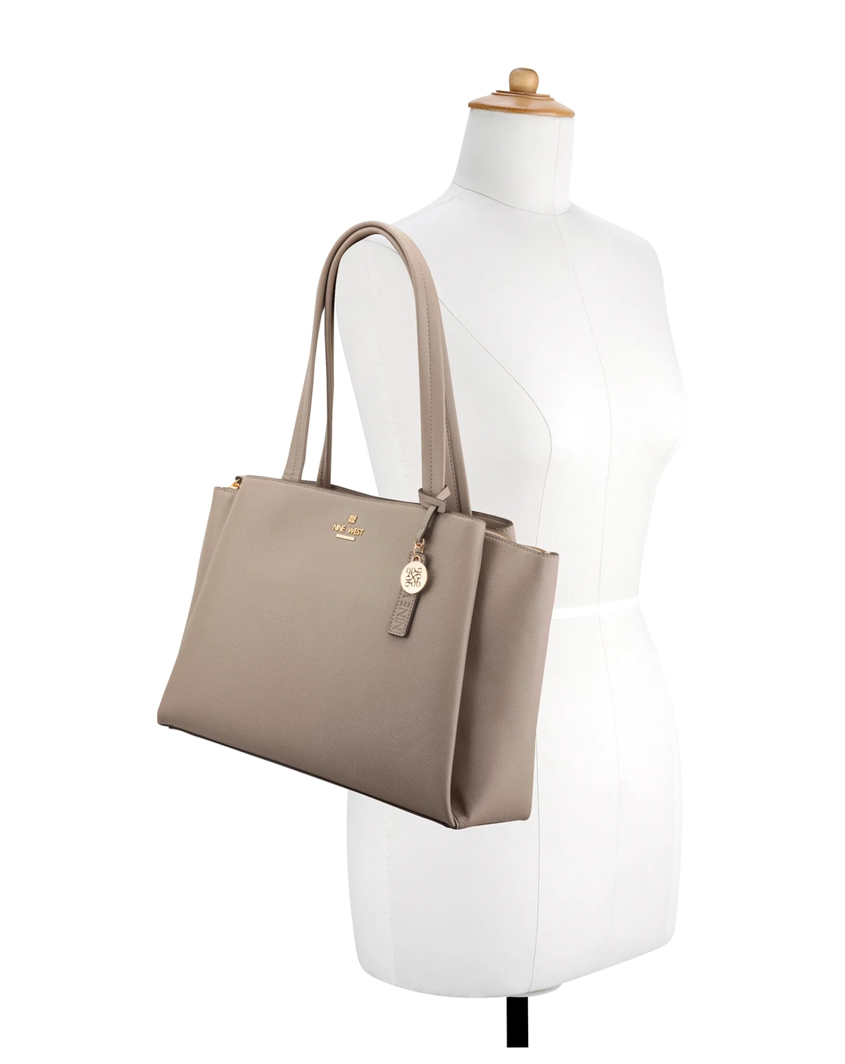 Nine West designer Luela triple compartment tote with internal slip and zipper pocket organization and external hardware details and branding. Includes padded laptop compartment for a great chic career or school tote carryall.