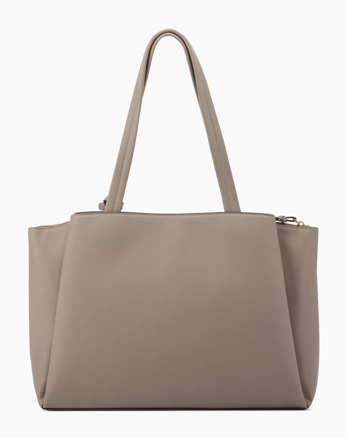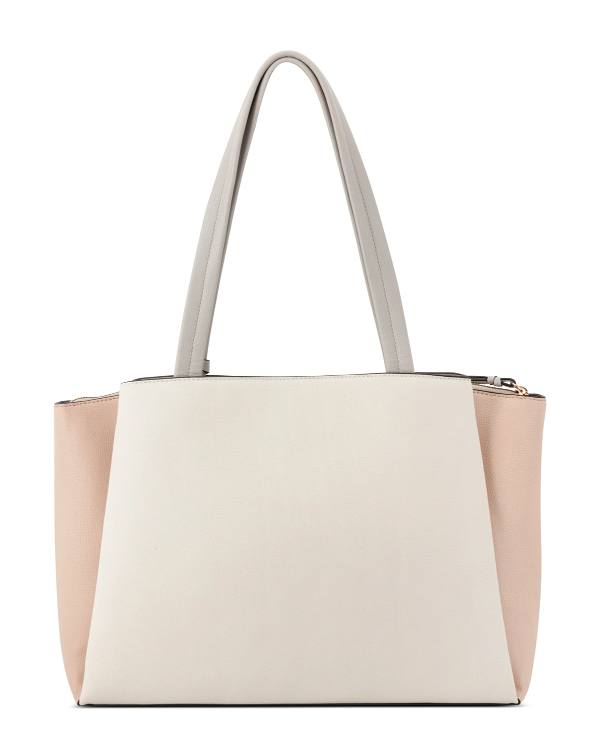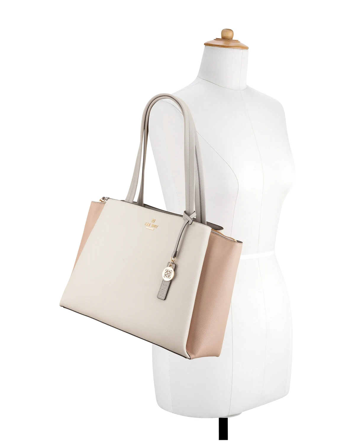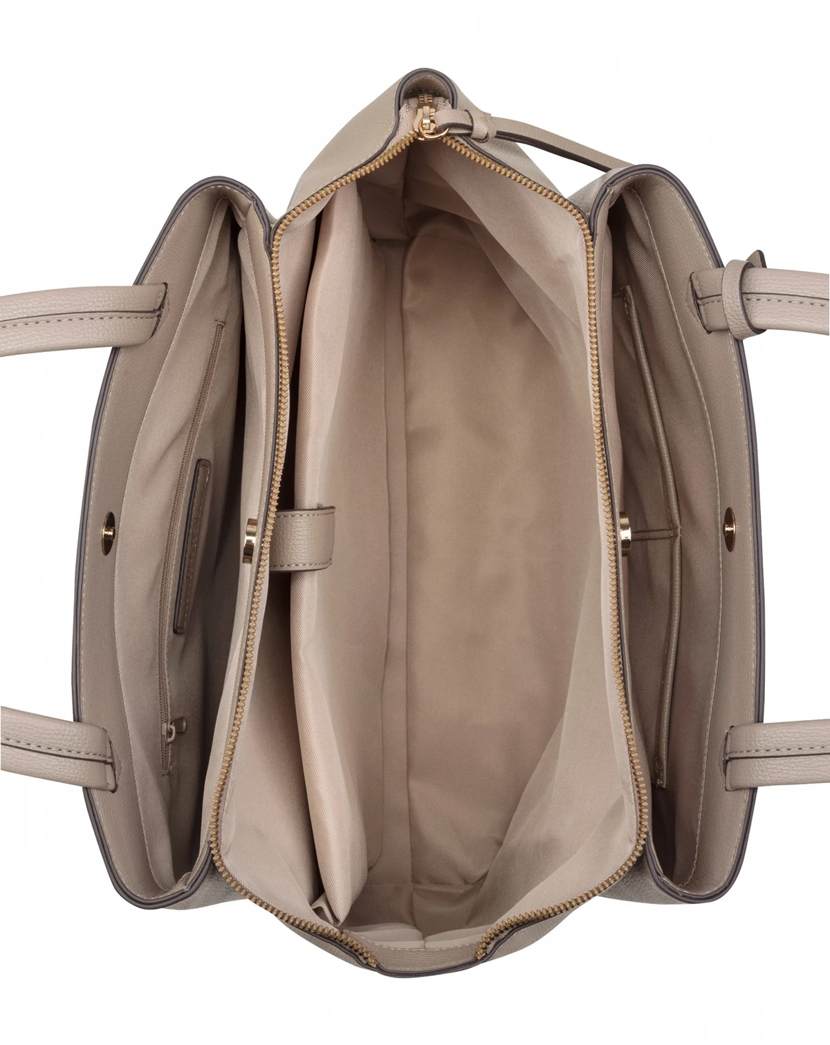 Nine West designer Luela triple compartment tote with internal slip and zipper pocket organization and external hardware details and branding. Includes padded laptop compartment for a great chic career or school tote carryall.