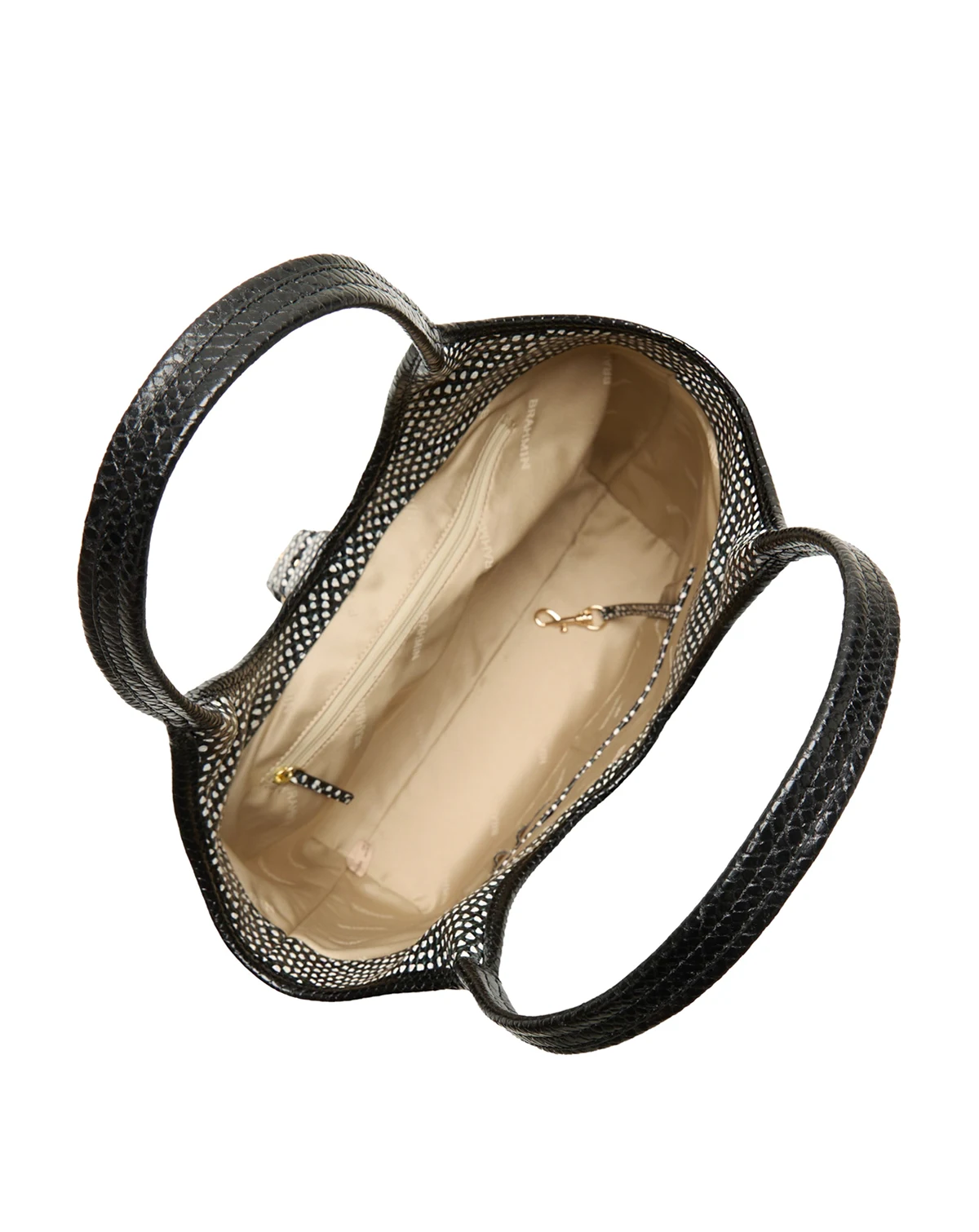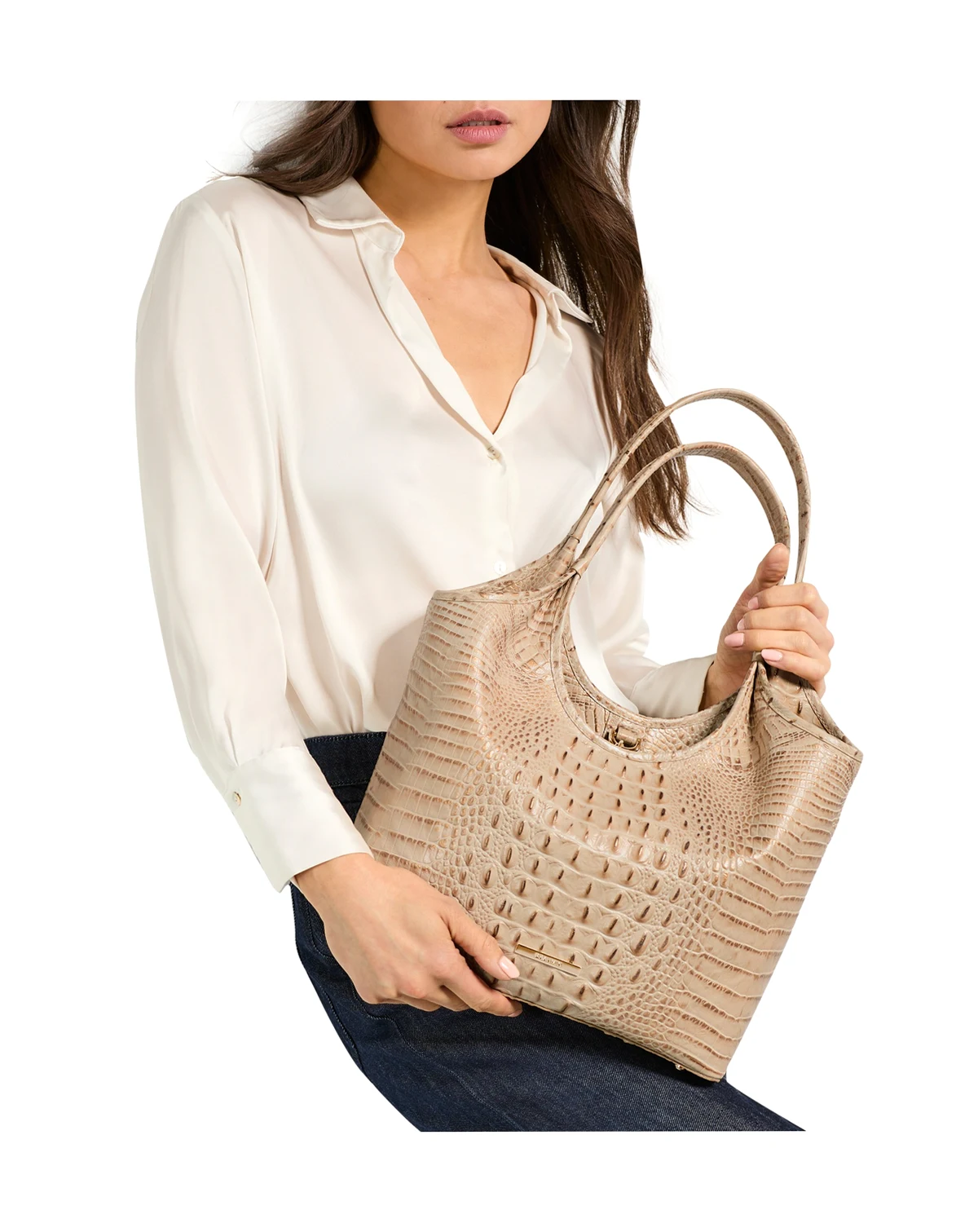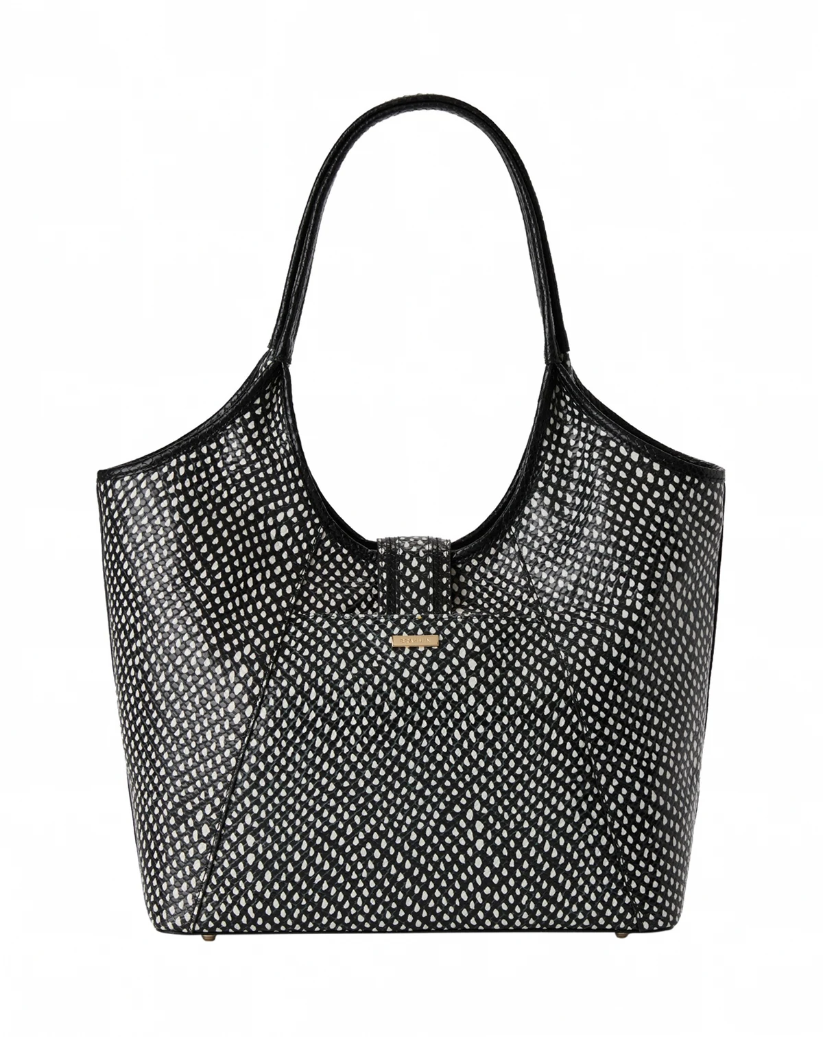 Boasting a vintage-inspired feminine silhouette, this textured tote from Brahmin features an easy key clip closure and a convenient back slide-in pocket. The spacious yet refined design makes it a go-to for daily use.