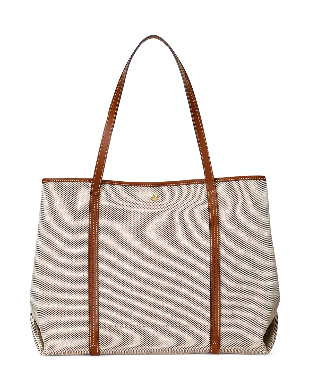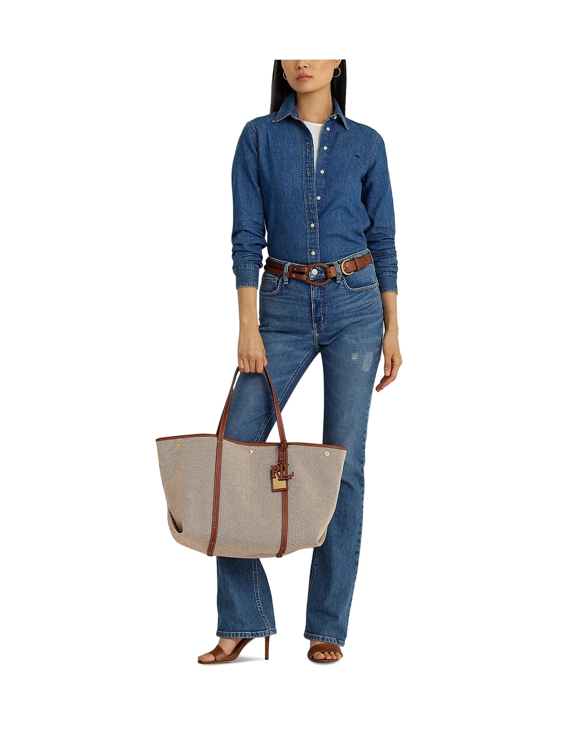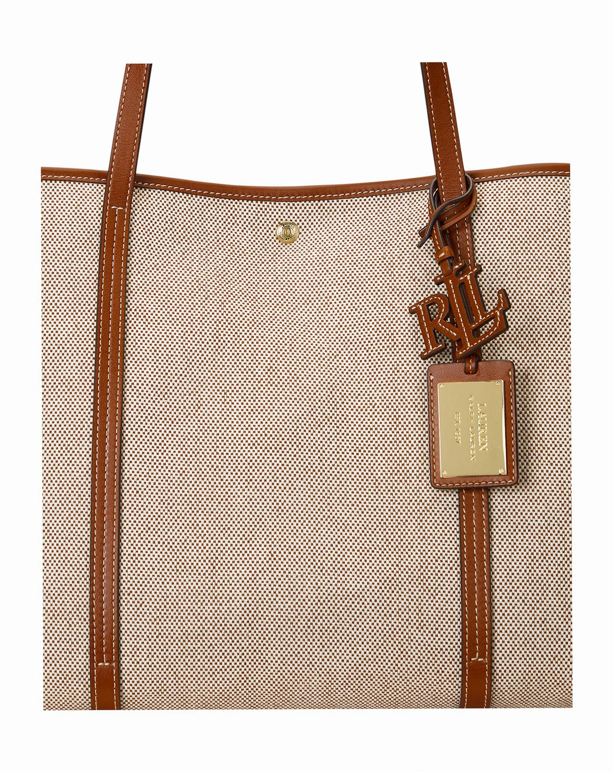 Crafted with a combination of durable, cross-dyed canvas and supple full-grain leather, Lauren Ralph Lauren's Emerie tote is designed with a spacious, convertible silhouette perfect for storing your essentials. The ultimate bag for every occasion, whether it's a weekend getaway or running errands, it's finished with a supple "LRL" stacked leather charm and a luggage tag with a signature engraved metal plaque for iconic Lauren style.