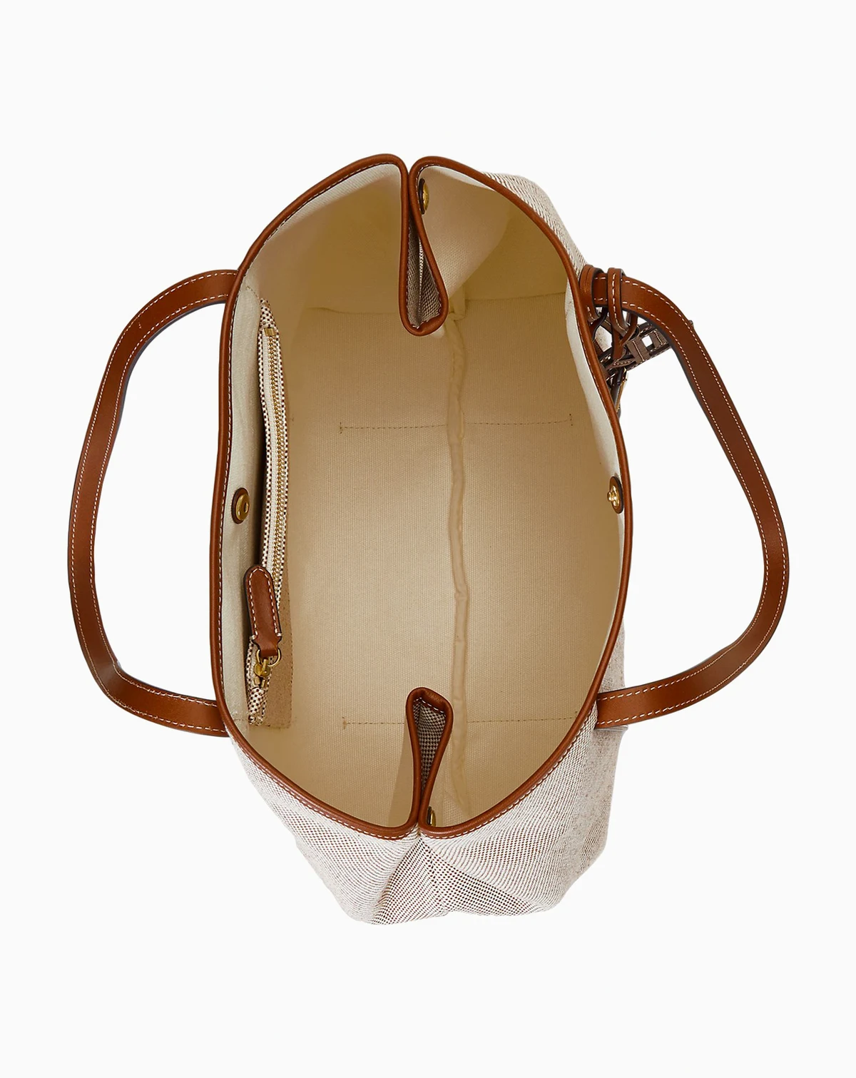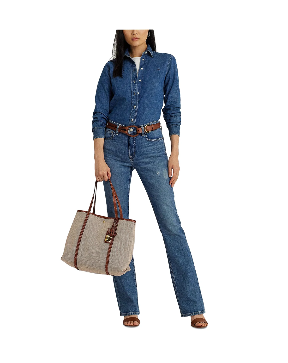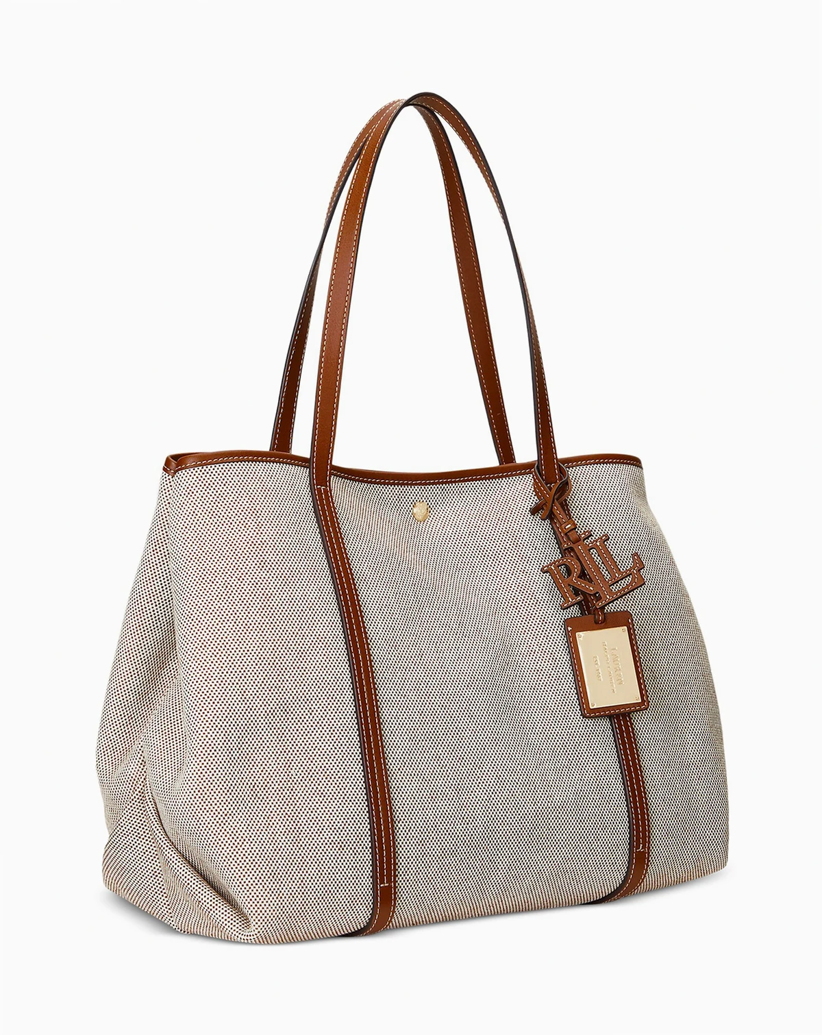 Crafted with a combination of durable, cross-dyed canvas and supple full-grain leather, Lauren Ralph Lauren's Emerie tote is designed with a spacious, convertible silhouette perfect for storing your essentials. The ultimate bag for every occasion, whether it's a weekend getaway or running errands, it's finished with a supple "LRL" stacked leather charm and a luggage tag with a signature engraved metal plaque for iconic Lauren style.