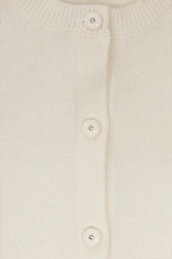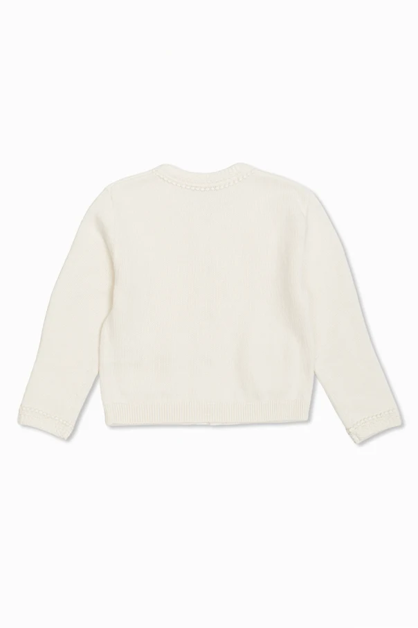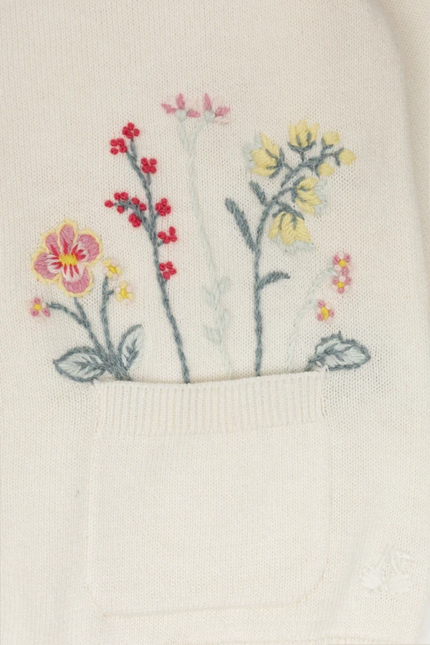 Presented in a sophisticated cream hue, this cardigan is enhanced by two front patch pockets delicately adorned with embroidered flowers in charming shades of pink, yellow, and green. Cream-toned, rounded buttons elegantly trace the front closure, while the ribbed finish at the neckline, sleeves, and hem lends a touch of refinement. A discreet, intricate embroidery at the pocket corner offers a final note of subtle distinction.