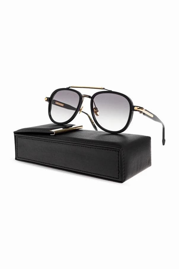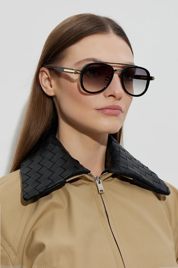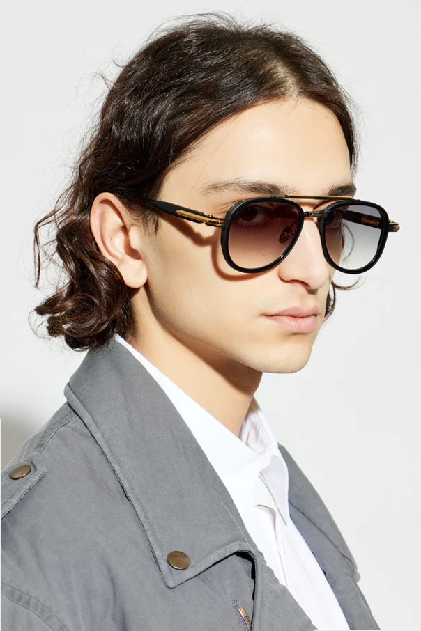 Discover timeless sophistication with the ‘Akira’ sunglasses by John Dalia . The gently rounded aviator silhouette features a bold, defined upper frame and an iconic double bridge, expressing modern refinement. Crafted from glossy, premium acetate in a black finish, the frame is elegantly contrasted by polished gold-toned metal accents, including the bridge, hinge, and distinctive side details.