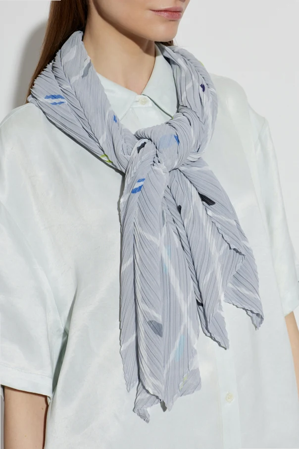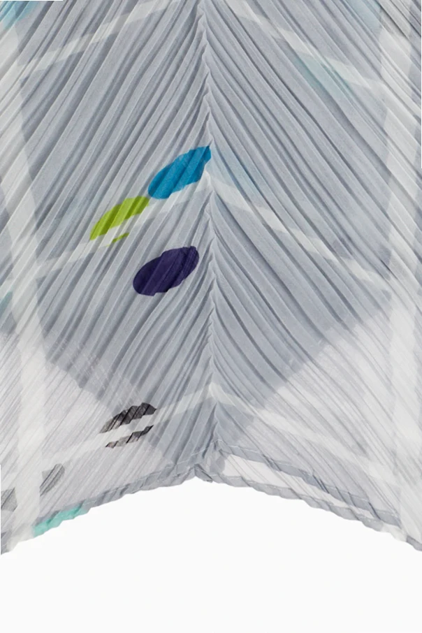 Discover the exquisite allure of the Pleated Printed Scarf by Pleats Please Issey Miyake , a masterful accessory crafted for the modern, sophisticated woman. This rectangular, subtly elongated scarf is distinguished by a uniquely sculpted half-arrow tip, imbuing every ensemble with a note of avant-garde elegance.