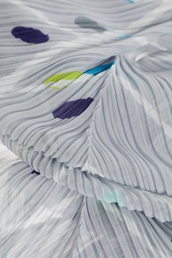 Delicately pleated on a lightweight, semi-sheer fabric with a gentle luster, this accessory fuses traditional Japanese artistry with innovative tailoring. The oblique pleats create a dynamic, tactile surface, complemented by an artistic scatter of small, colorful spots in shades of navy, sky blue, black, light green, and turquoise. The impeccable finish ensures its refined, polished presence.