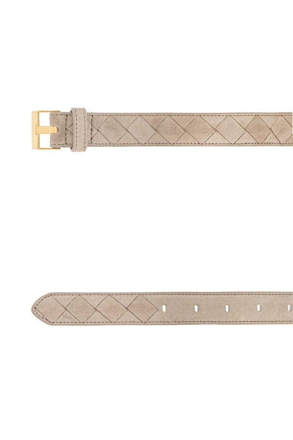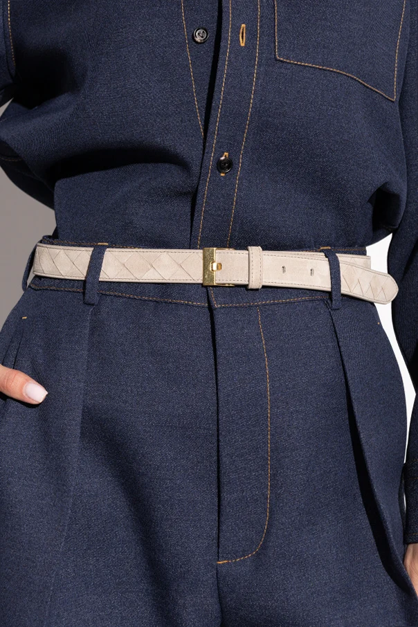 Subtly adorned with an all-over geometric quilted motif, the belt achieves a captivating sense of dimension, heightening its allure. The slender silhouette is meticulously designed to accentuate the waist and harmoniously complement trousers, dresses, or blazers. A striking, gold-tone rectangular buckle with a gleaming finish anchors the design, featuring a subtle signature detail from the celebrated house. The covered keeper further affirms the thoughtful craftsmanship for which Bottega Veneta is renowned.