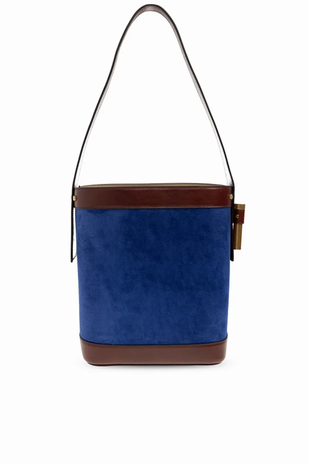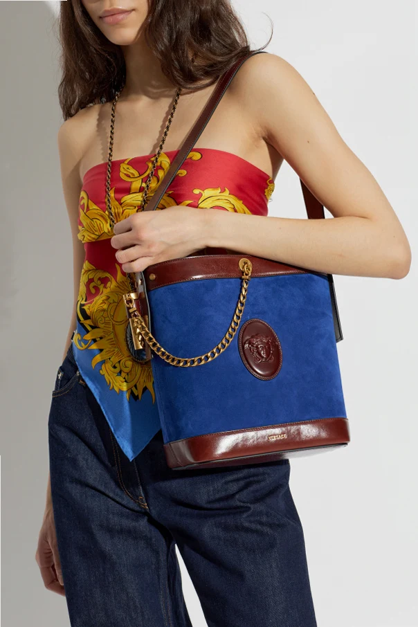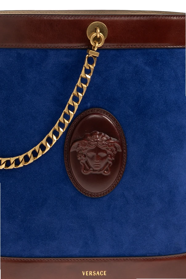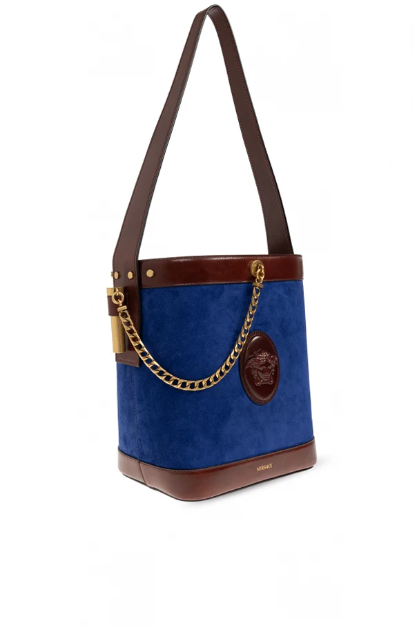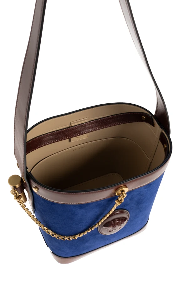 Discover the Pivot Small bucket bag by Versace—an elevated accessory defined by its classic cylindrical silhouette and refined presence. The dominant navy blue hue of sumptuous suede graces both the front and back, lending a plush, sophisticated touch, while smooth brown leather artisanally frames the top, base, and handle for striking contrast and durability.