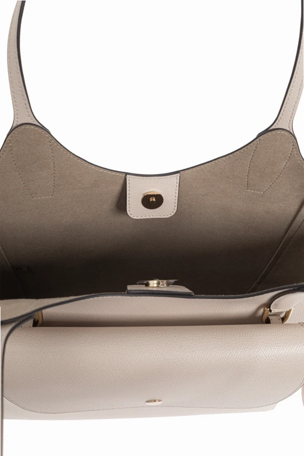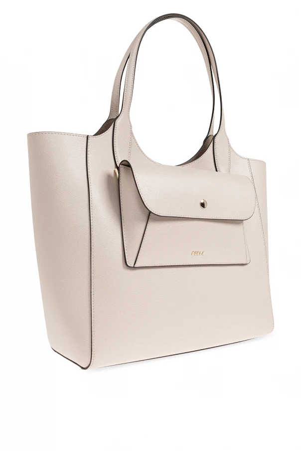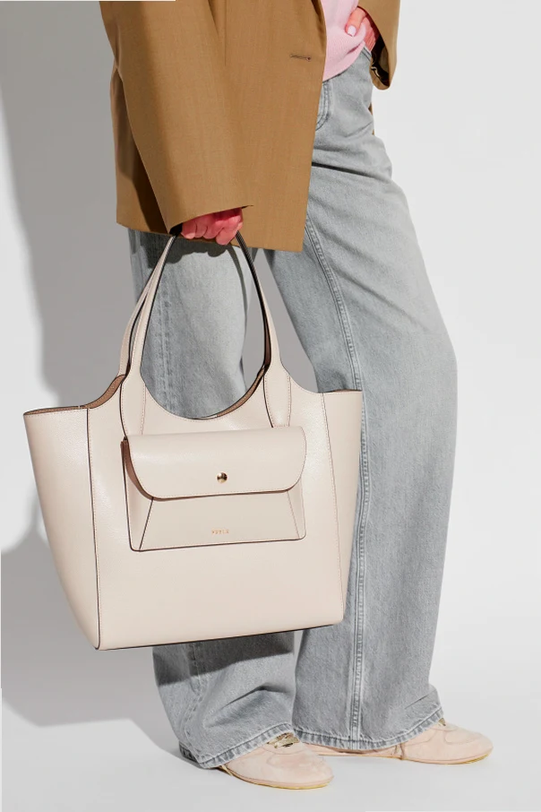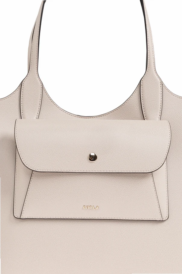 A generously sized, front patch pocket with a decorative metal clasp not only offers practical storage but also serves as a subtle focal point. The gold designer logo, delicately embossed above the pocket edge, enhances the bag’s distinctive allure. Contrasting, dark-toned edging accentuates the geometric form, while two elongated handles ensure effortless carrying comfort. The fully lined interior further attests to the meticulous craftsmanship and luxury inherent to Furla’s aesthetic.